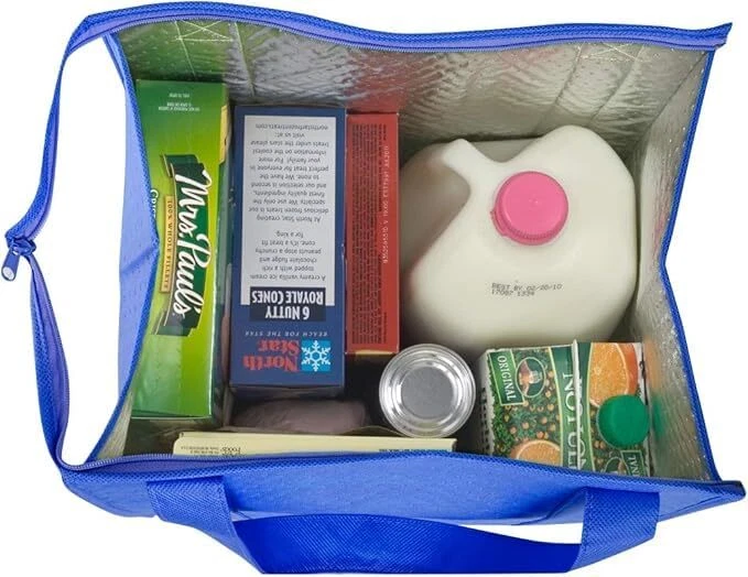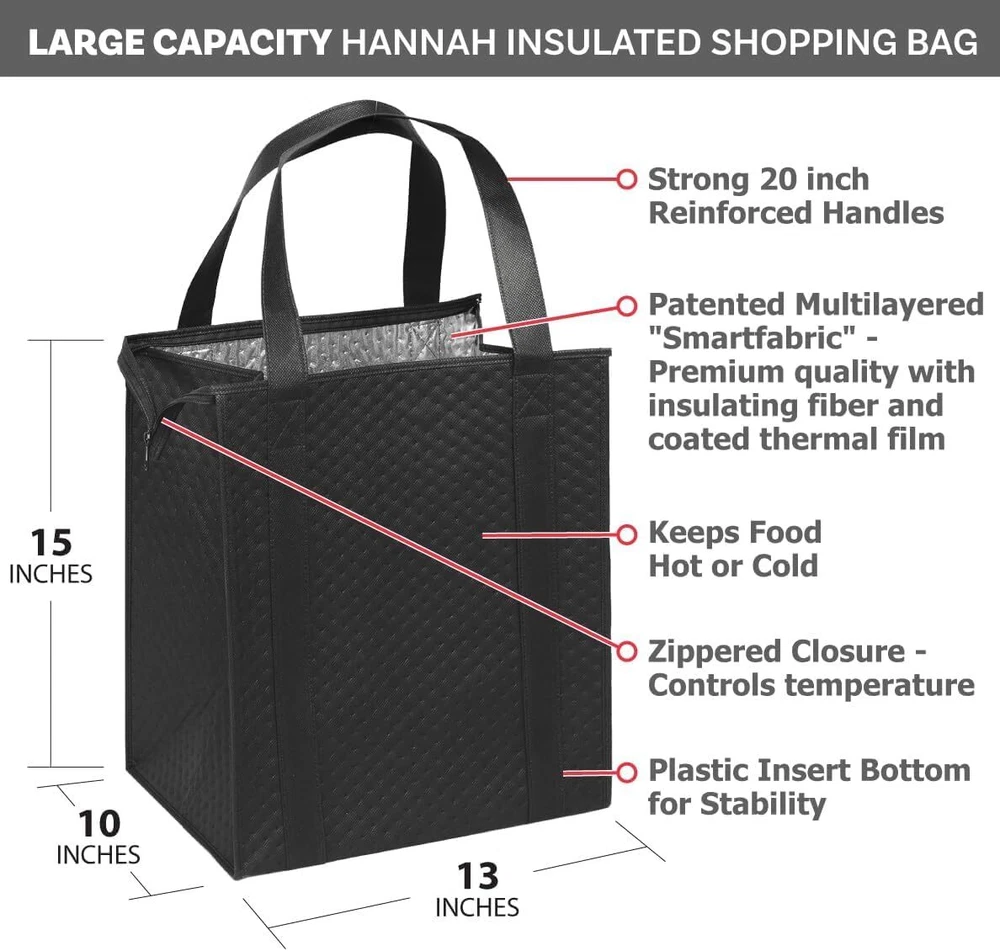 Description Experience the ultimate convenience and temperature control with our premium insulated grocery totes. Crafted from high-quality non-woven polypropylene, these totes are designed to keep your items hot or cold while you're on the move. Measuring 13"W x 10"D x 15"H, they provide ample space for all your groceries and essentials, making them the perfect companion for shopping trips or picnics. The zippered top ensures both and easy access, preventing spills and temperature changes. The reinforced 20" handles are not only strong enough to carry heavy loads but also provide comfortable handling, whether you're holding the tote by hand or wearing it over your shoulder. Plus, with the added convenience of collapsibility, these totes can be effortlessly folded flat for storage when not in use. Elevate your shopping experience with these versatile, durable, and reusable insulated totes, designed to make your life easier while prioritizing style and functionality. Premium Insulation: Keep your groceries and items at the desired temperature for longer, thanks to the high-quality non-woven polypropylene insulation that is great at keeping your food hot or cold. Spacious Design: With dimensions of 13"W x 10"D x 15"H, this large tote offers ample space to accommodate a variety of items, making it perfect for grocery shopping - especially at a big box , picnics, food or meal delivery, sporting events and more. Secure Zippered Top: The zippered closure ensures that your items are safely enclosed within the tote, preventing spillage and maintaining the temperature of your hot or cold products. Built to Last: The durable, heavy duty construction of this eco-friendly tote was designed for longevity, the tote features dual reinforced 20" handles that can comfortably bear the weight of your groceries. The plastic bottom insert adds stability and durability, preventing sagging or wear and tear. Convenient Handling: The 1 1⁄4”-wide x 20”-long handles provide a comfortable grip for easy carrying, whether you're lifting the tote by hand or wearing it over your shoulder. Plus it is collapsible - it folds flat for easy storage and makes it great for storing an extra 1 or 2 in your car for any last minute needs.