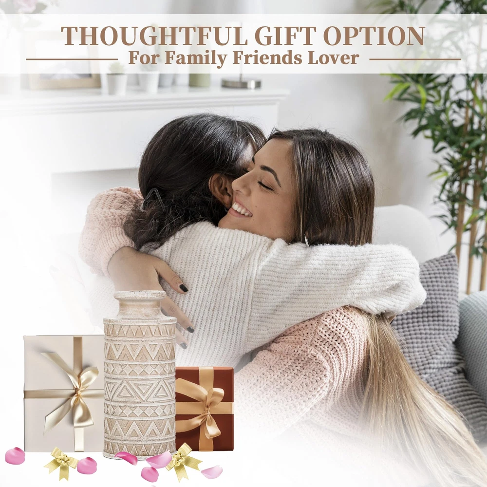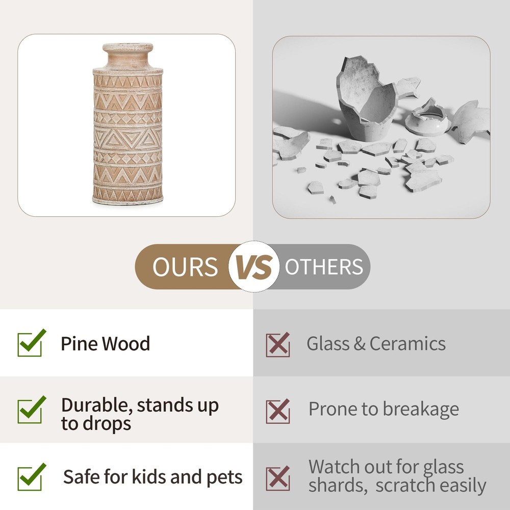 Unique Carved Beauty: Elevate your room decor with our decorative fall vase, featuring unique carved patterns that make a striking statement. The wooden dried flower vase is vintage elegant with a natural charm, adding texture and warmth to your space Durable and Pet-Friendly: Each centerpiece vases for table crafted from solid pine, boasts unique variations, ensuring durability. No pet or child's playful touch can harm these timeless pieces, suit to display artificial greenery plants or faux flowers Versatile Boho Farmhouse Style: Our beige vintage vase fits seamlessly into various styles, from modern to traditional. The farmhouse vase can be used as a living room coffee table vase, or as a standalone decorative piece in any room Elegant Display for Any Room: Measuring 4 x 4 x 8.7 inches with a 1.2-inch opening, it's ideal size for floral arrangements, seasonal decorations. Add an organic touch to bathrooms, office, kitchens, entryway, dining room, mantels, bedrooms or shelves Thoughtful Gift Option: This decorative vases for home decor is an ideal gift for every celebration. It's neutral minimalist design appeals to all tastes, making it a versatile choice for birthdays, Mother's Day, Christmas, or housewarmings present