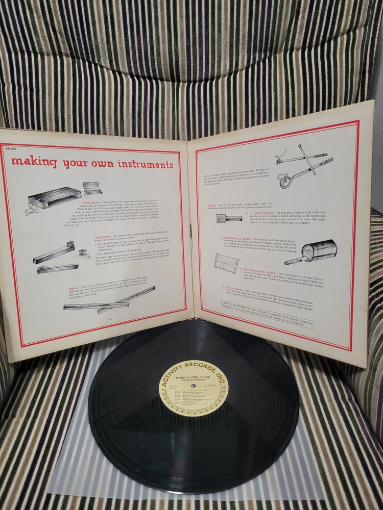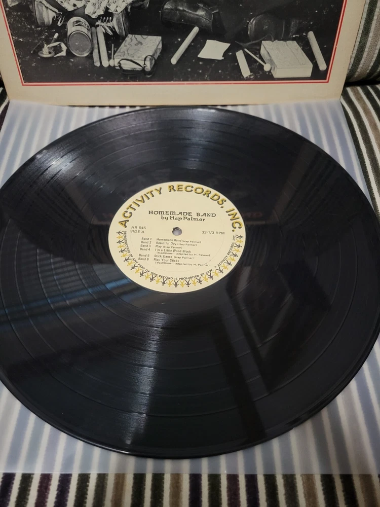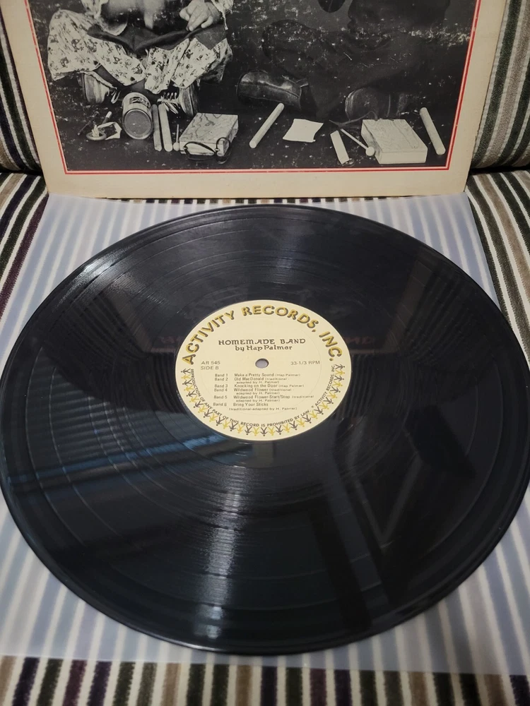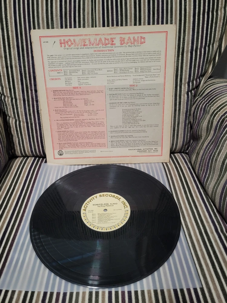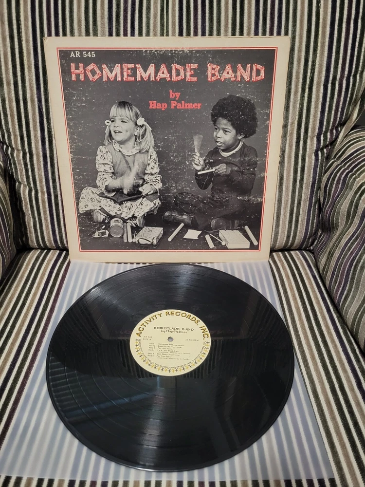 This vinyl record features the beloved children's musician Hap Palmer and his band, with a first edition, limited edition, and first pressing of the album "Homemade Band". The 12" record has a black color and comes in a cardboard sleeve, with an original cover and gatefold. The inlay condition is very good plus (VG+), while the sleeve grading is very good (VG). The record grading is also very good plus (VG+), with a high-fidelity level and 33 RPM speed. This LP is a must-have for any fan of children's music, storytelling, or educational music.