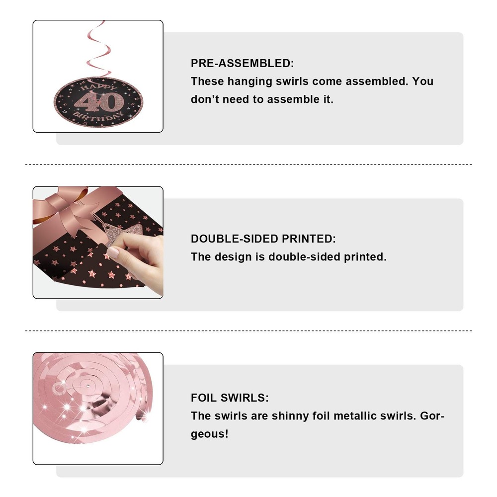 Happy 40th Birthday Party Hanging Swirls Streams Ceiling Decorations, Celebration 40 Foil Hanging Swirls with Cutouts for 40 Years Rose Gold Birthday Party Decorations Supplies Product Details Premium Quality: Made from high quality cardstock and double-sided printed. They are not flimsy and not easy to be bent. They are durable and can be used many times in different occasions. 40th Birthday Decoration Kit: Comes with total 10 different hanging swirls in the kit. The cutouts are double-sided design in rose gold glitter color. The swirls are shiny metallic foil swirls. There are a variety of birthday element patterns including gift box, hat, cake and other popular patterns… Perfect for: 40th Birthday parties. These hanging swirls can be used indoor or outdoor. You can hang them from the ceiling, window, doorway, branches. These 40th birthday cutouts can also be used as party centerpiece. Size: Each swirl can extend to approx. 29in to 38inch in length. Each cutout measures approx. 7inch x 7inch. Great for birthday party, works well with our other rose gold party decorations to give you a gorgeous rose gold world. Pre-assembled: The hanging swirls and the cutouts are pre-assembled and you do not need to spend time on assembling. Just open the package and they are ready for decoration. birthday party hanging swirl decorations:premium quality: sturdy cardstockcolor: rose golddesign: double-printed. Traditional rose gold color.package includes: 10 hanging swirls with cutoutsEasy to use: pre-assembled, just open the package and ready for decoration.perfect for: birthday party decorations. Can be used indoor and outdoors.how to use: Pull from the middle to get a rotating shape and can be hung with plastic hooks.