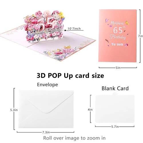 30 Days Return Policy Fast Delivery Trusted seller Happy 65th Birthday Pop-Up Card for Women, Wife, 65th Birthday Gift for, Mom, 3D Greeting Birthday Card with Blank Note and Envelope, 5" x7" Product Description 【Ideal Gift】: This 65th birthday pop up card would be a great gift for women, her or friends. Card folds flat and can be popped up of features “Happy 65th Birthday” with flower and butterfly. This intricate and elegant design is sure to surprise and delight the recipient on their special day. 【Unique Design】: This 65th birthday card is tailor-made for conveying birthday greetings which combine with elegant, cute and intricate details design. We use top cutting technology to ensure each detail is cut flawlessly and fits together perfectly for a high quality pop up card. 【Package Included】: Our birthday greeting card measures 5x7 inch when folded flat. Comes with an envelope, a birthday pop up card and a little note card. You have the opportunity to add your own heartfelt wishes or messages, making this gift even more personalized and cherished by the recipient. 【A Treasured Keepsake】: This delightful 65th birthday card serves as a wonderful keepsake that will astonish and enchant anyone who receives it. Whether it's for a friend, family member, colleague, or anyone dear to you, this creative birthday gift is d to be adored and leave a lasting impression during this joyous celebration. 【Premium Quality 】: Made from high-quality materials and crafted with care, this card is built to last and can be cherished as a keepsake long after the celebrations are over. Shipping Returns Payment Shipping Shipping is FREE to all addresses other than APO/PO boxes in the lower 48 states. All our stock ships from US-based warehouses. Shipped via USPS or UPS (depending on location and package weight) Unless stated otherwise, all orders will ship within 24-72 hours of your payment being processed. Check our feedback to see the great reviews of FAST shipping we offer. Returns As our valued customer, we will do our best to make sure the product you receive arrives to you on time and as expected. If you are not satisfied with your purchase, please contact us within 30 days of receiving your order to process a return. Payment We currently accept payment via eBay managed payments only. Once payment is cleared, we will dispatch your shipment within 1-3 business days. Please refer to the "Shipping" tab for more information regarding shipping speed to your destination.