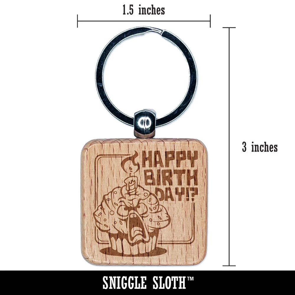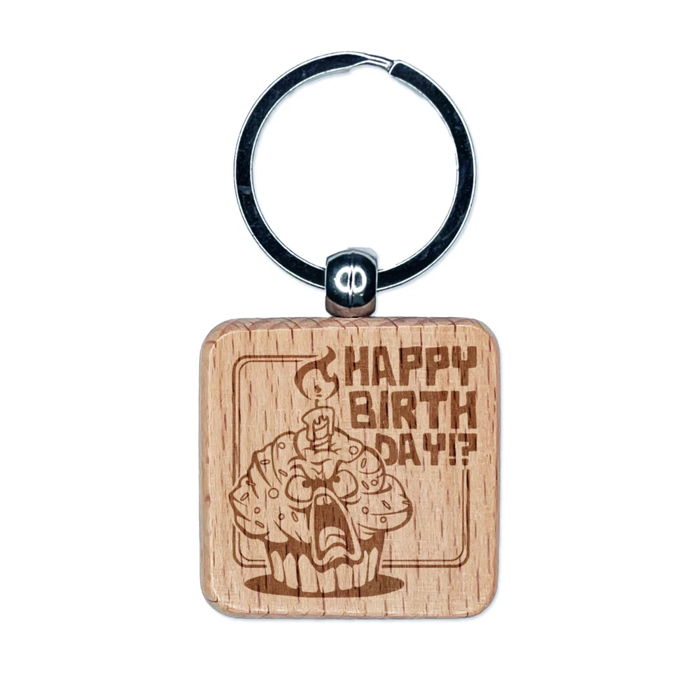 Happy Birthday Horrified Cupcake Engraved Wood Square Keychain Tag Charm