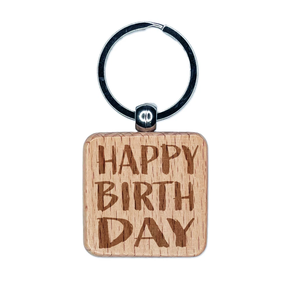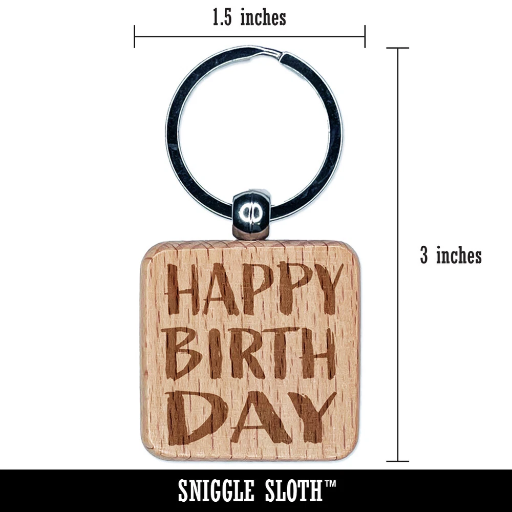 Happy Birthday Sketchy Fun Text Engraved Wood Square Keychain Tag Charm