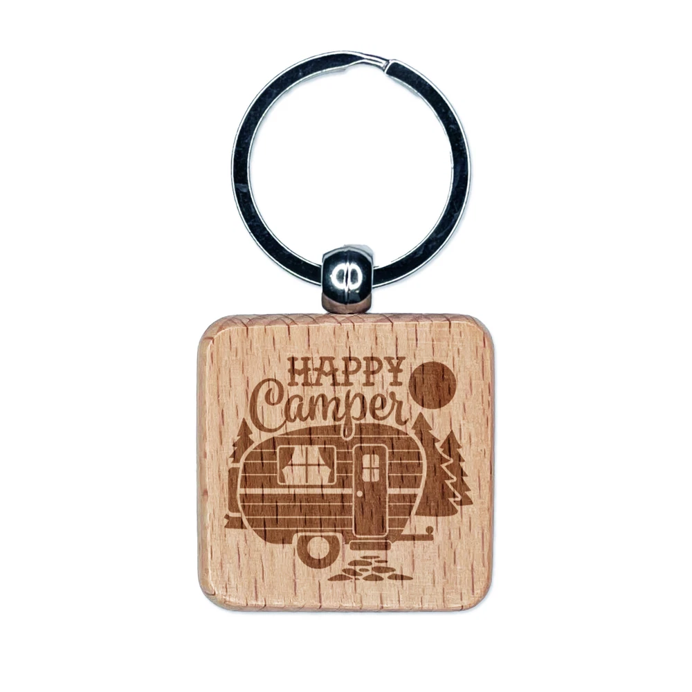 Happy Camper Trailer Camping Engraved Wood Square Keychain Tag Charm