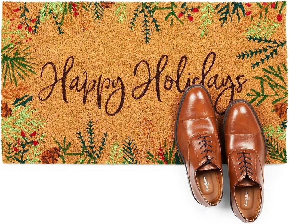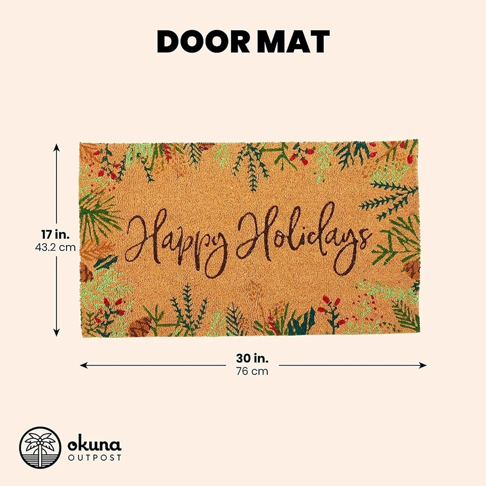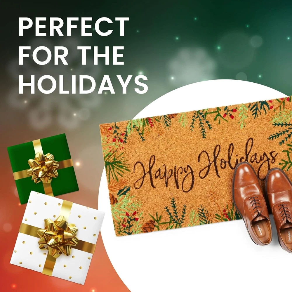 Store New Arrivals Add to Favorite View Feedback Contact Fast deliveries to the customer's home Quality customer service John Make the customers happy! Happy Holidays Coco Coir Non Slip Christmas Doormat for Outdoor Entrance, Christmas Decor (17 X 30 In) Description Christmas Coco Coir Mat: Make your home feel festive and welcoming thanks to this Happy Holidays coco coir doormat while protecting your home from unwanted dirt and mud Holiday Home Decor: The decorative coco mat for Christmas decor features green and red garland on the sides and reads “Happy Holidays” to instantly elevate your kitchen, laundry room, garden, backyard, or patio Easy To Clean: The coco coir doormat material is ideal for both indoor and outdoor use; to wash the front door mat, use water and a stiff-bristle scrub brush to remove debris within the fibers The Perfect Size: The Christmas doormat measures approximately 30 x 17 inches; the non-slip backing ensures stability while cleaning your sneakers, boots, or sandals What's Included: You’ll receive 1 brown holiday door mat; perfect for all your Christmas decor needs Spruce up your Christmas decor this holiday season with this Happy Holidays welcome coir doormat. Place this coir mat at your front door, patio entry, or garage to protect your wood, carpet, or tile floors from unwanted stains caused by mud, grass, and snow. The festive brown coco coir rug features a decorative garland and floral border and reads "Happy Holidays," which will instantly elevate your Christmas home decor. This festive holiday doormat will also ensure your floors stay clean and damage-free. The entry rug measures approximately 30 x 17 inches and is made from natural coir fiber with a rubber backing to provide additional stability while cleaning your shoes. Item Shape Rectangular Room Type Hallway Number of Pieces 1 Pattern Letter Print Material Coir Indoor Outdoor Usage Indoor Style Garden Is Electric No Is Stain Resistant Yes Pile Height High Pile Construction Type Handmade Item Dimensions L x W 30"L x 17"W Back Material Type Rubber Special Features Non Slip Theme Christmas,Holidays Rug Form Type Doormat Product Care Instructions Hand Wash Only Is Autographed No ABOUT US We offer the best prices around on high quality products. Our E-store includes media such as books, movies, music and games while offering electronics, toys, sporting apparel, clothing, tools, general home, garden items and more. SHIPPING We are always working hard to ensure your package arrives as soon as possible. Please understand that some factors like weather, high postal traffic, and the performance of shipping companies are outside of our control. We offer free shipping to the lower 48 states and ship within 2 business days of payment, usually sooner. We do not accept P.O. Boxes. Please provide a physical address. For shipping outside of the continental USA, we only use eBay's Global Shipping Program. The item is shipped to KY and then sent to the rest of the world. International customers are responsible for all duties and taxes. Continue to 'check out' to calculate costs for shipping the item to your country. Messages regarding eBay's Global Shipping Program MUST be directed at eBay EXCLUSIVELY. RETURNS We offer a 30-Day Return Policy on items in which you are not completely satisfied with. You have the option of a full-refund or an exchange of the item. No returns are available on items shipped outside of the USA PAYMENT We accept PayPal. CONTACT US This page content is yet to come Please ad us to your favorite seller and visit again later Thank You CUSTOMER SATISFACTION We try our very best to make sure every customer is completely satisfied. If there's a problem, message us! We're happy to help. WE ACCEPT