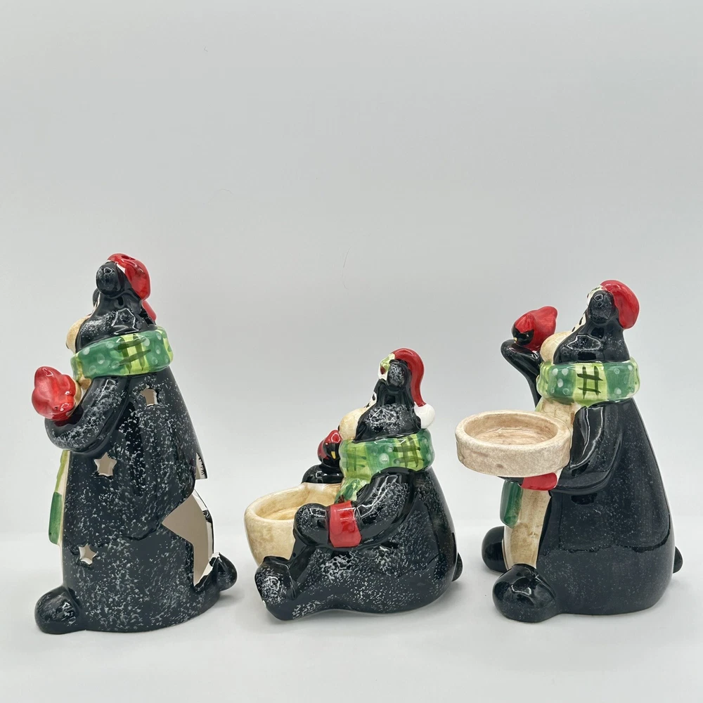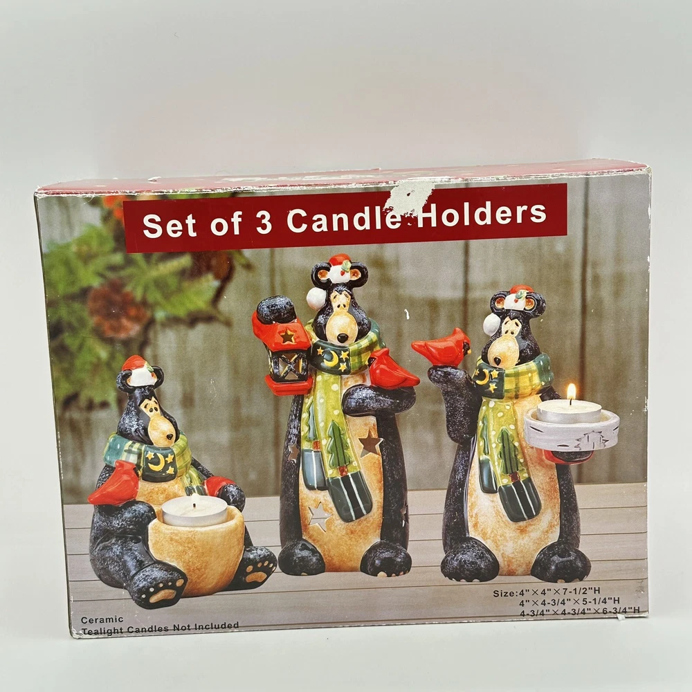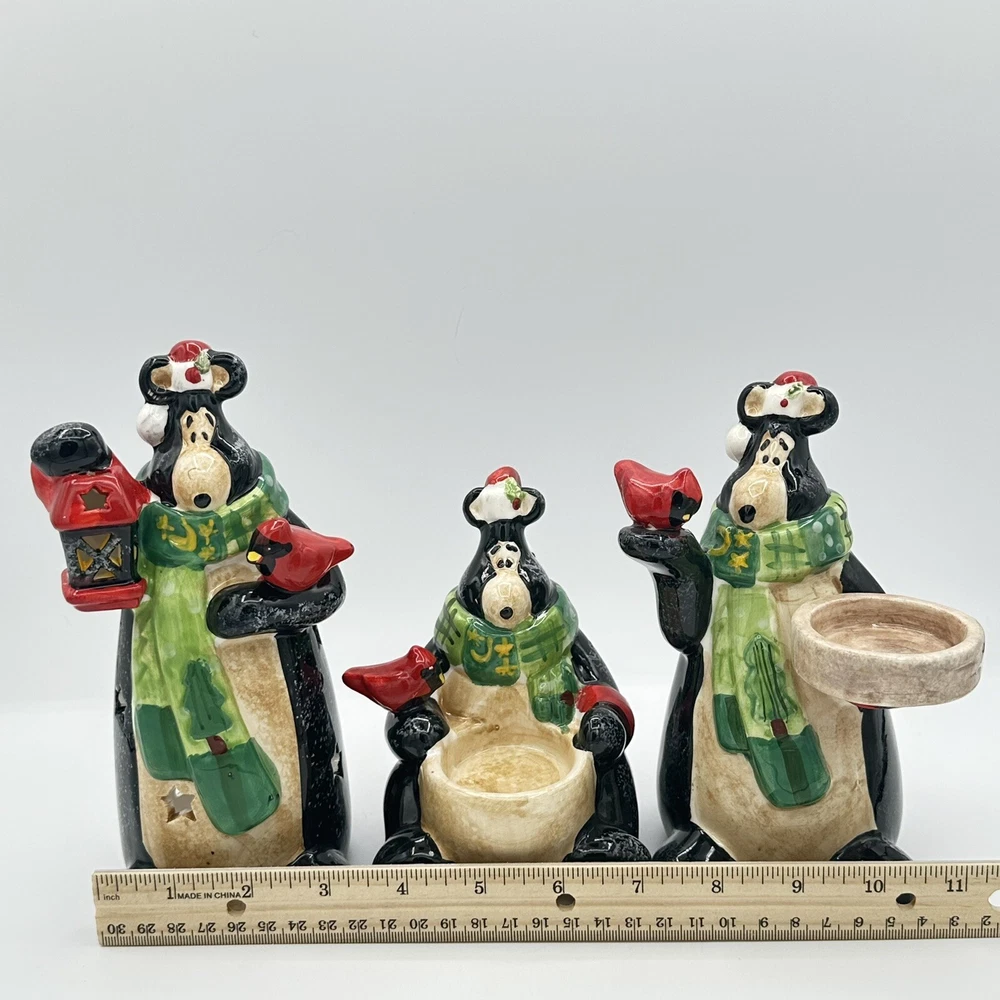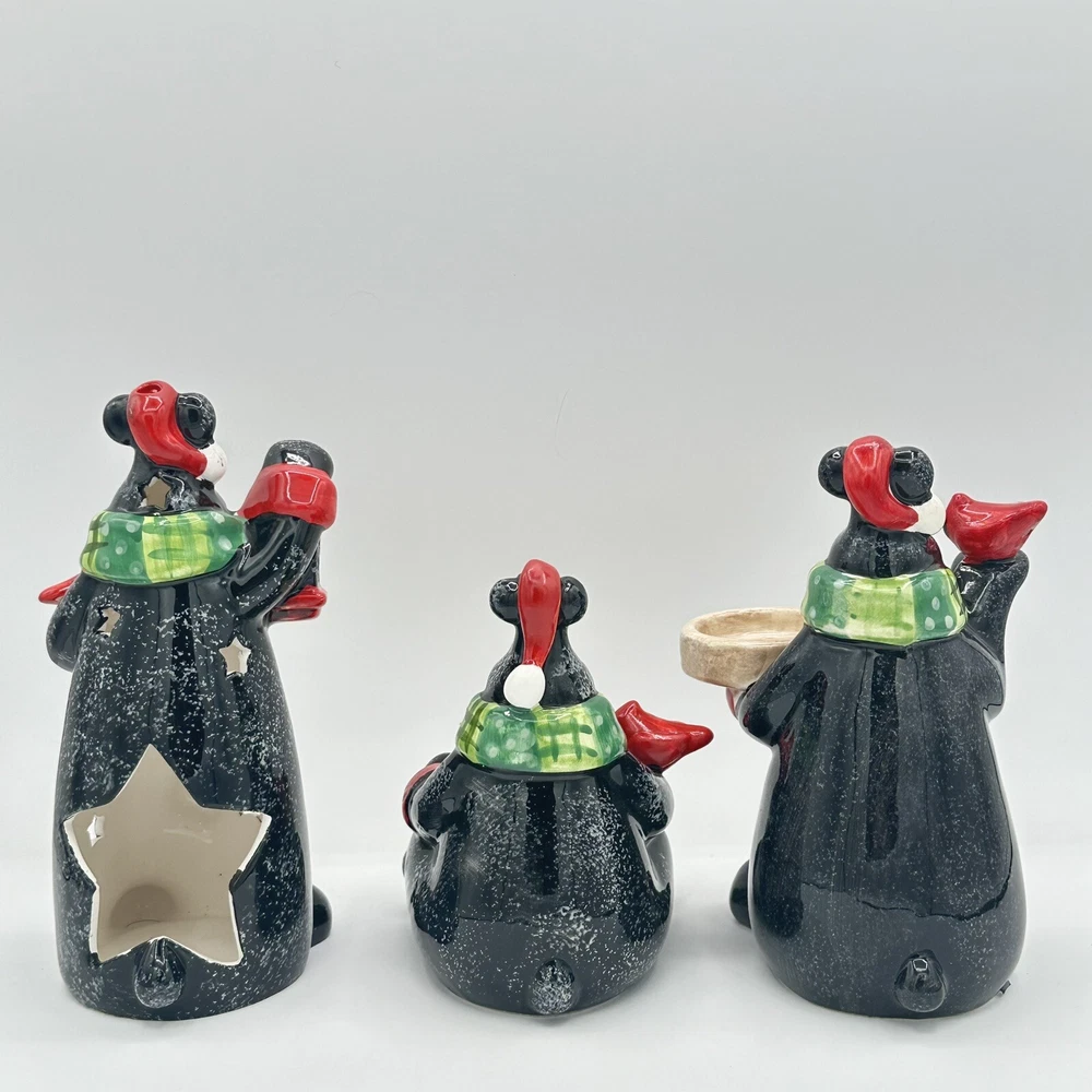 Add some festive cheer to your home with this Happy Holidays set of 3 black bears/cardinals ceramic tea light candle holders. Perfect for any room and suitable for Christmas, these candle holders are made from high-quality ceramic material and feature a cute design of bears. The multicolor adds a touch of playfulness to your holiday décor. Bring home the magic of the holiday season with these adorable candle holders. No chips or cracks.