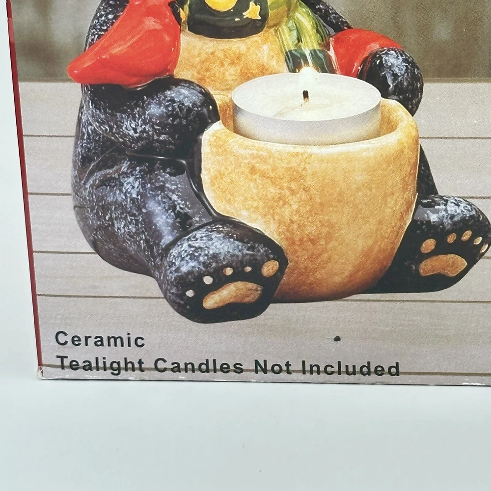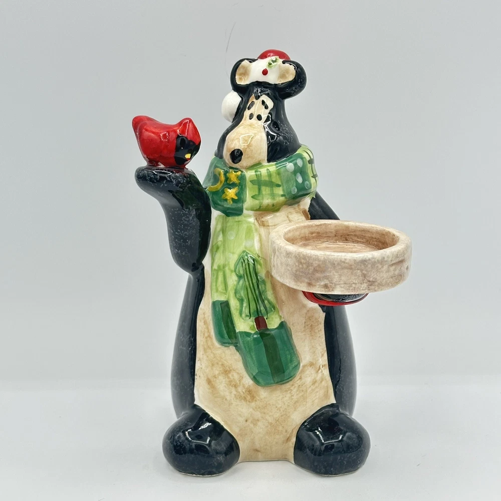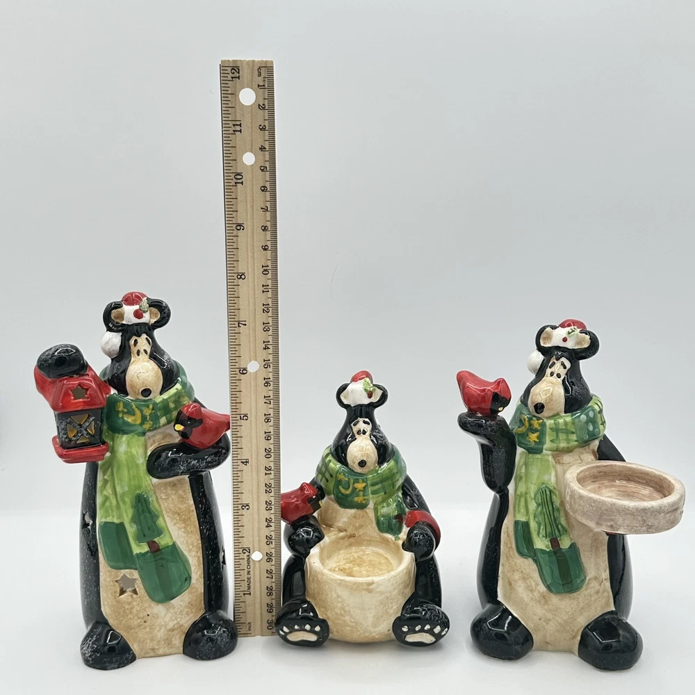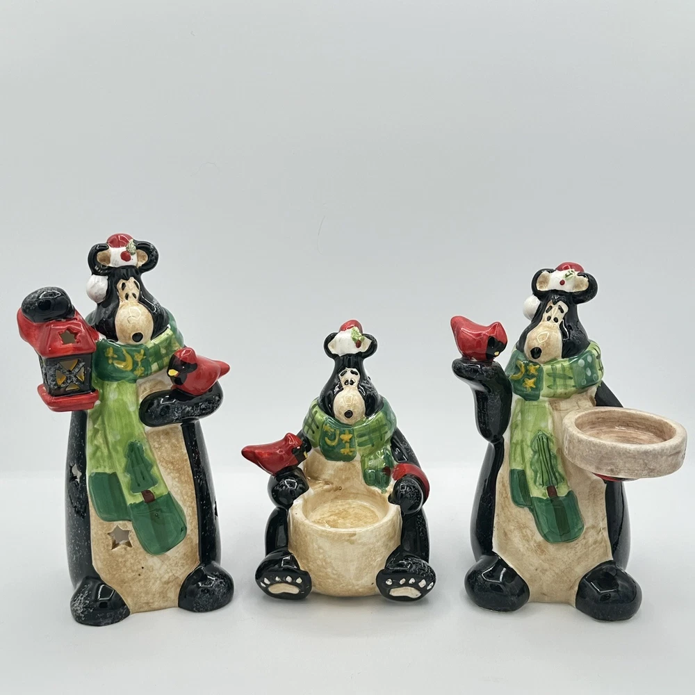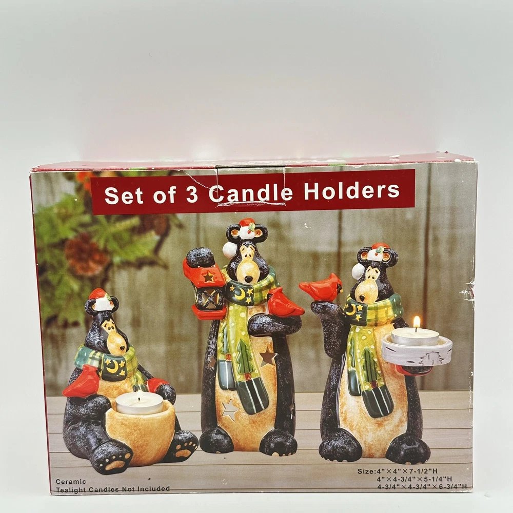 Add some festive cheer to your home with this Happy Holidays set of 3 black bears/cardinals ceramic tea light candle holders. Perfect for any room and suitable for Christmas, these candle holders are made from high-quality ceramic material and feature a cute design of bears. The multicolor adds a touch of playfulness to your holiday décor. Bring home the magic of the holiday season with these adorable candle holders. No chips or cracks.