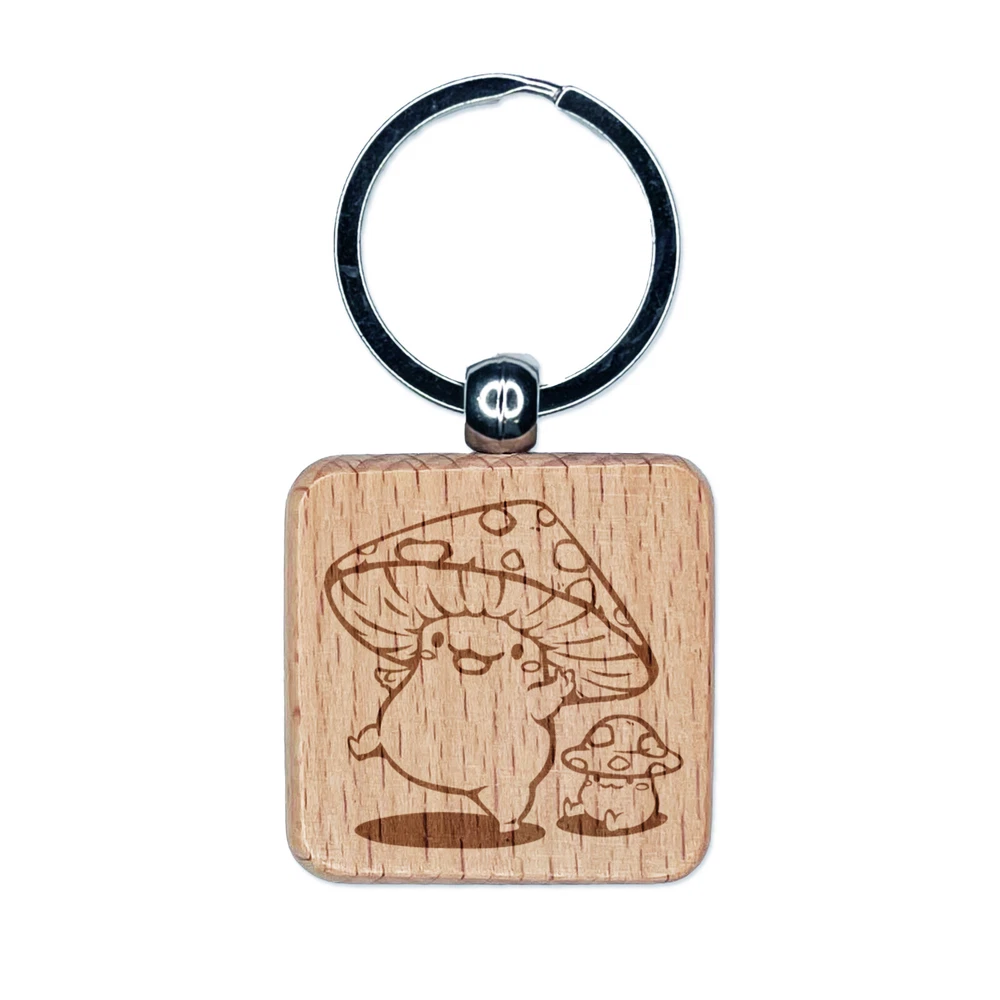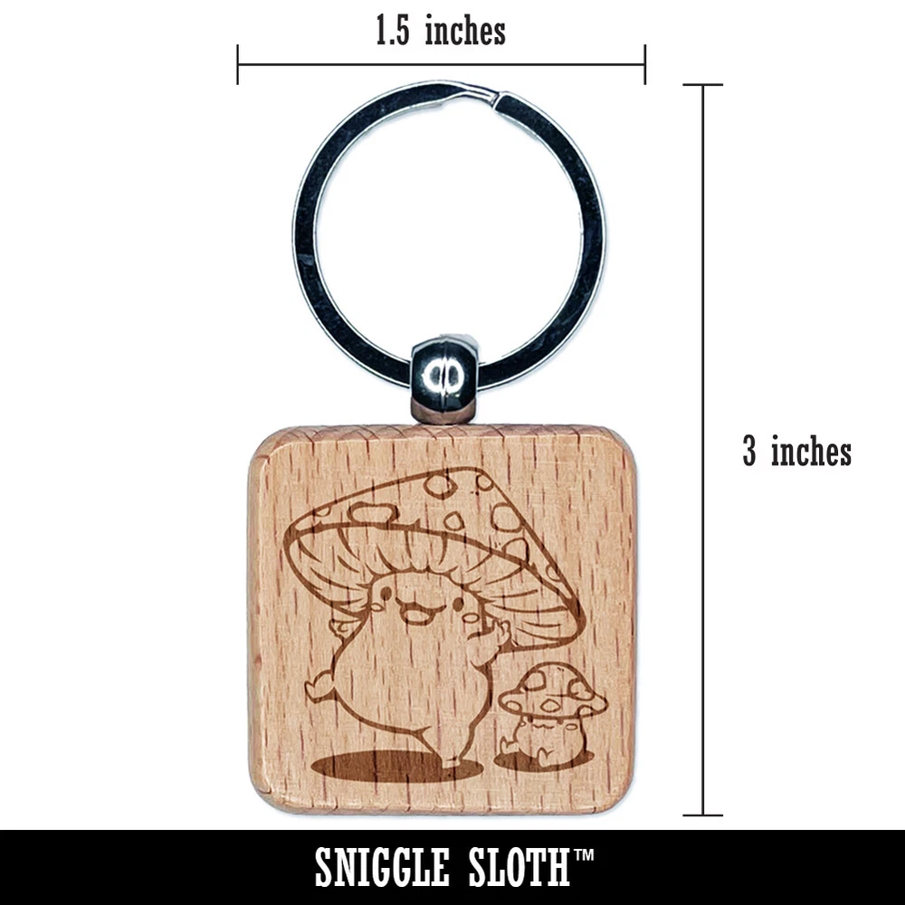 Happy Kawaii Mushroom Friends Engraved Wood Square Keychain Tag Charm