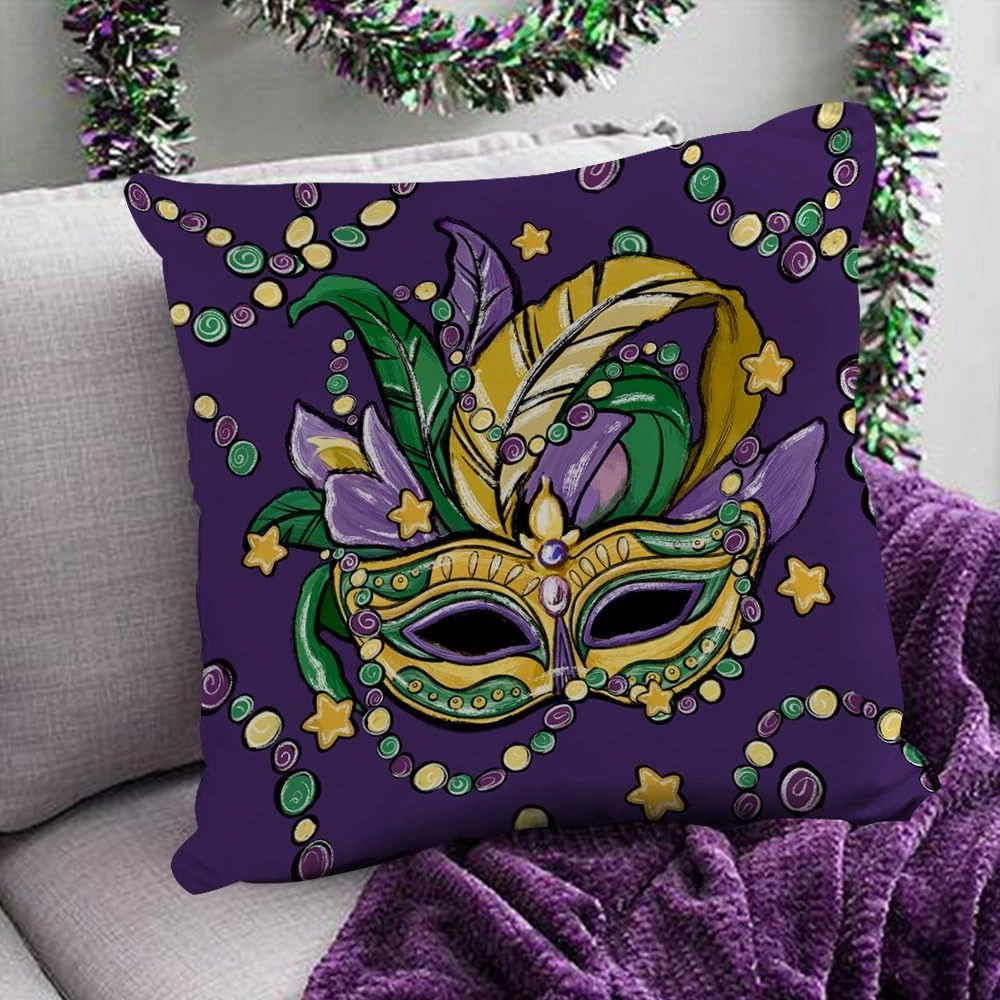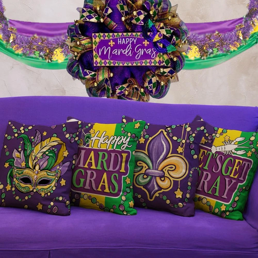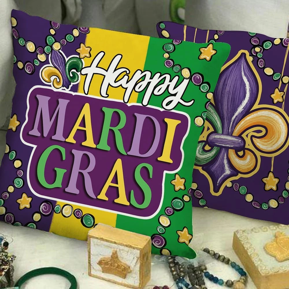 Happy Mardi Gras Fleur De Lis Mask Beads Throw Pillow Covers 18X18 Inch Set of 4