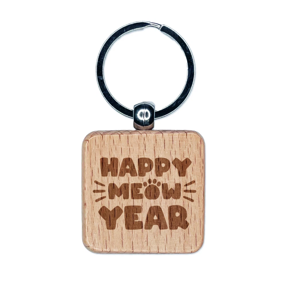 Happy Meow New Year Cat Funny Engraved Wood Square Keychain Tag Charm