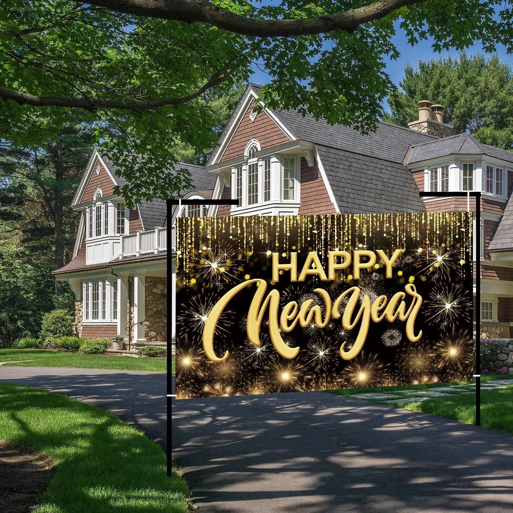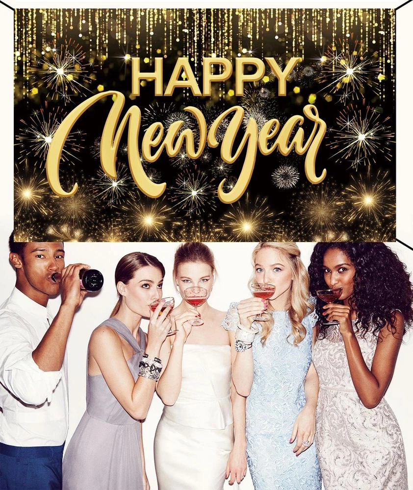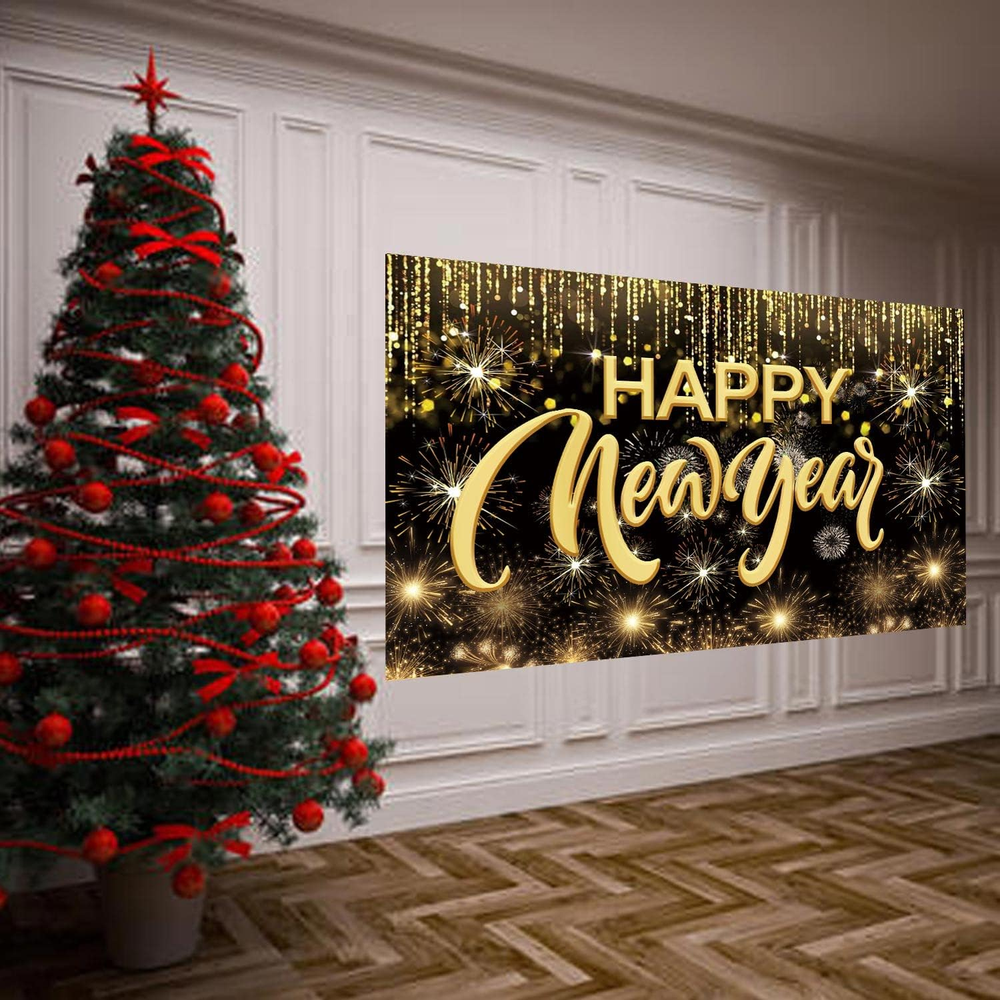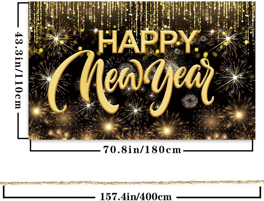 Material:The Happy NEW YEAR Banner is High quality ECO-Friendly Fabric Sign Poster Backdrop Banner.It is soft smooth material,Durable and Washbale,it also can be reused! Design Elements: Black background with Gold Alphabet Happy NEW YEAR banner firework pattern are printed on the banner; this design perfect for your new year theme and Christmas party. Size: 43.3"x70.8" inches, hanging rope is 157.4"; Enough big backdrop banner perfect for your new year party decorations. Applications:There is enough length rope to hang in outdoor and indoor,bedroom and in the yard,anywhere of you want. Increase the new year party atmosphere. Easy to hang:Come with 4 holes at the corner with a long rope use 157.4"/ 4 meters sturdy hemp rope,it can easy to pass through the copper buckle and hang it up.it is very cute and beautiful! Material:The Happy NEW YEAR Banner is High quality ECO-Friendly Fabric Sign Poster Backdrop Banner.It is soft smooth material,Durable and Washbale,it also can be reused! Design Elements: Black background with Gold Alphabet Happy NEW YEAR banner firework pattern are printed on the banner; this design perfect for your new year theme and Christmas party. Size: 43.3"x70.8" inches, hanging rope is 157.4"; Enough big backdrop banner perfect for your new year party decorations. Applications:There is enough length rope to hang in outdoor and indoor,bedroom and in the yard,anywhere of you want. Increase the new year party atmosphere. Easy to hang:Come with 4 holes at the corner with a long rope use 157.4"/ 4 meters sturdy hemp rope,it can easy to pass through the copper buckle and hang it up.it is very cute and beautiful!