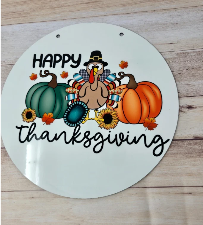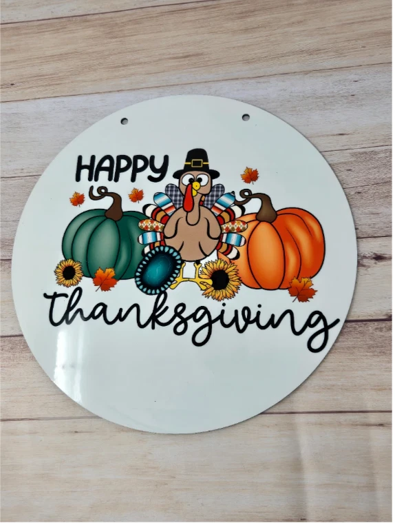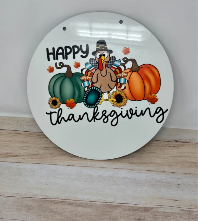 Happy thanksgiving Doorhanger 11.75 inches. Its white on the front and the back is a wooden finish great to hang outdoors.