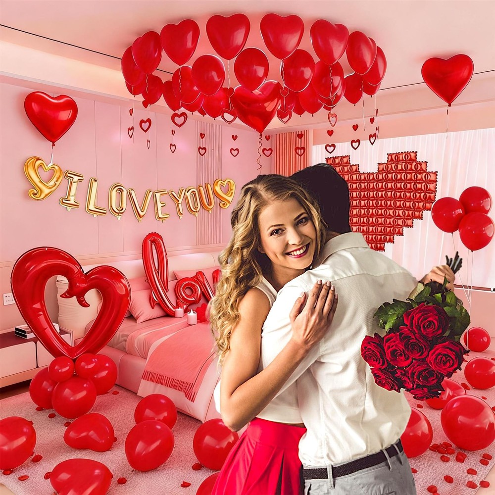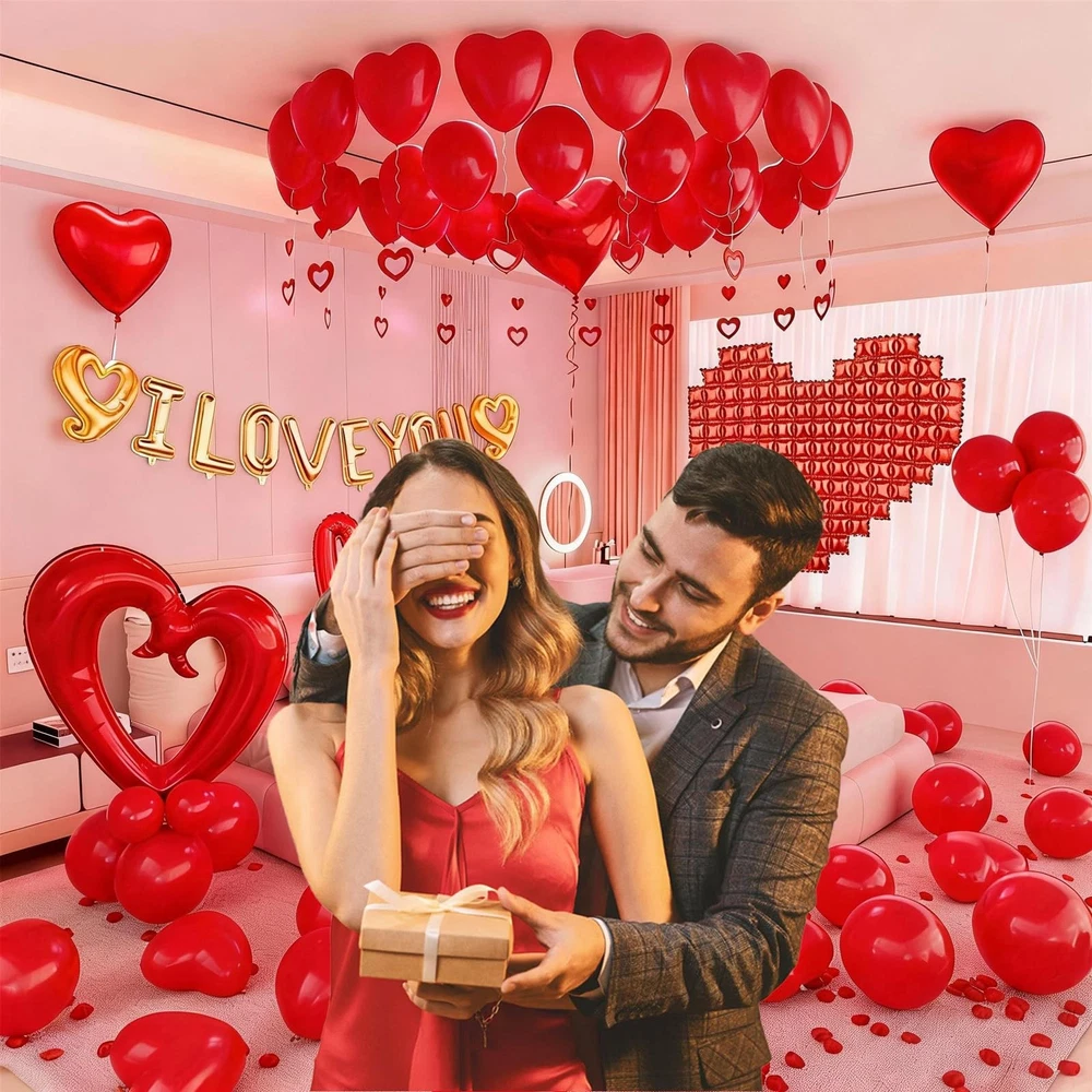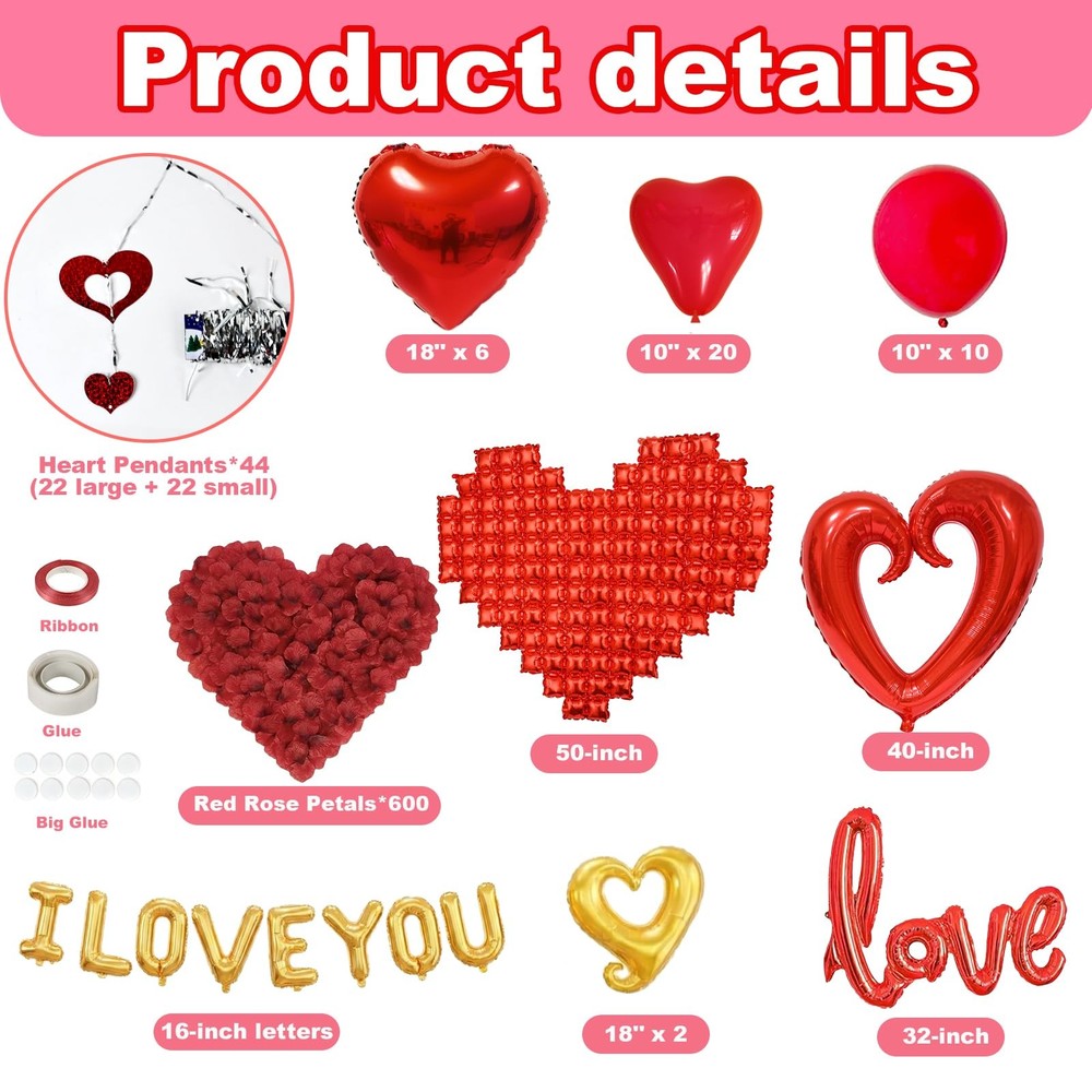 Happy Valentines Day Decorations Balloons, Be My Valentines Balloon Kit Decor, I Love You Balloons Red Heart, San Valentines Decorations for Party Home Bed Room, Romantic Decorations Special Night Package Includes: Our Valentines balloons kit contains 10 red balloons (10"), 20 red heart-shaped balloons (10"), 6 red foil heart-shaped balloons (18"), 1 foil love-shaped balloon(32"), 1 foil open heart(40"), 1 foil giant heart balloon(50"), 2 foil chain of hearts (18"), 1 gold foil " I LOVE YOU" letter balloon (16"), 600 artificial rose petals, 44 heart pendants(22 large + 22 small), 1 balloon ribbon, and glue Made from high-grade natural latex, these balloons are not only of superior quality but also remarkably durable and less likely to burst Crafted from high-quality materials, these foil balloons are designed to be long-lasting, resisting leaks and boasting a shiny finish. Plus, they're reusable for multiple occasions You'll get 600 red artificial rose petals – that's sure to boost the romance Includes a massive 50" x 43" heart balloon that is a guaranteed show-stopper Valentines balloons Shipping We offer FREE shipping on all orders! We ship within Three business days of payment, usually sooner. We use a selection of shipping services such as UPS, FedEx, USPS etc. We only ship to the lower 48 states, no APO/FPO addresses or PO Boxes allowed. Local pickups and combined shipping options are not provided at this time. Return You can return a product for up to 30 days from the date you purchased it. Any product you return must be in the same condition you received it and in the original packaging. Please keep the receipt. Payment We accept payment by any of the following methods: PayPal Please pay as soon as possible after winning an auction, as that will allow us to post your item to you sooner! Feedback Customer satisfaction is very important to us. If you have any problem with your order, please contact us and we will do our best to make you satisfied. Contact Us If you have any queries, please contact us via ebay. We usually respond within 24 hours on weekdays. Please visit our eBay store to check out other items for sale! Thank you for shopping at our store.
