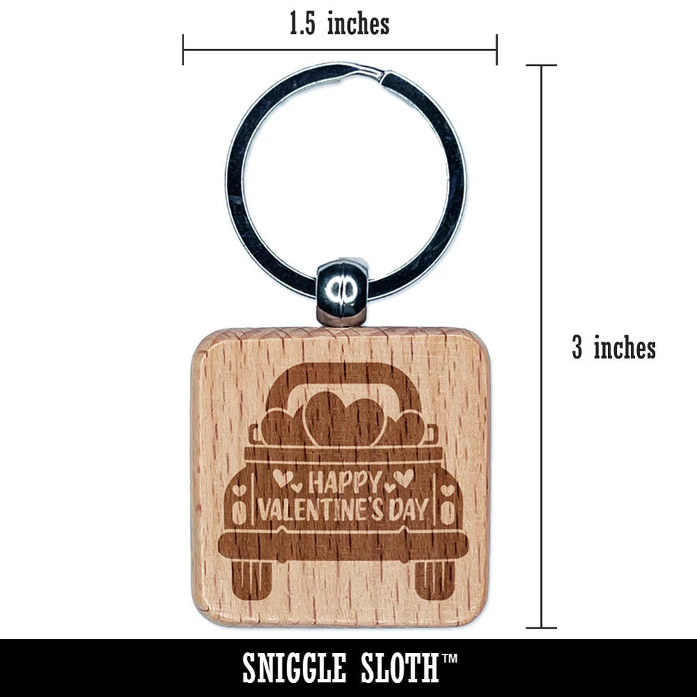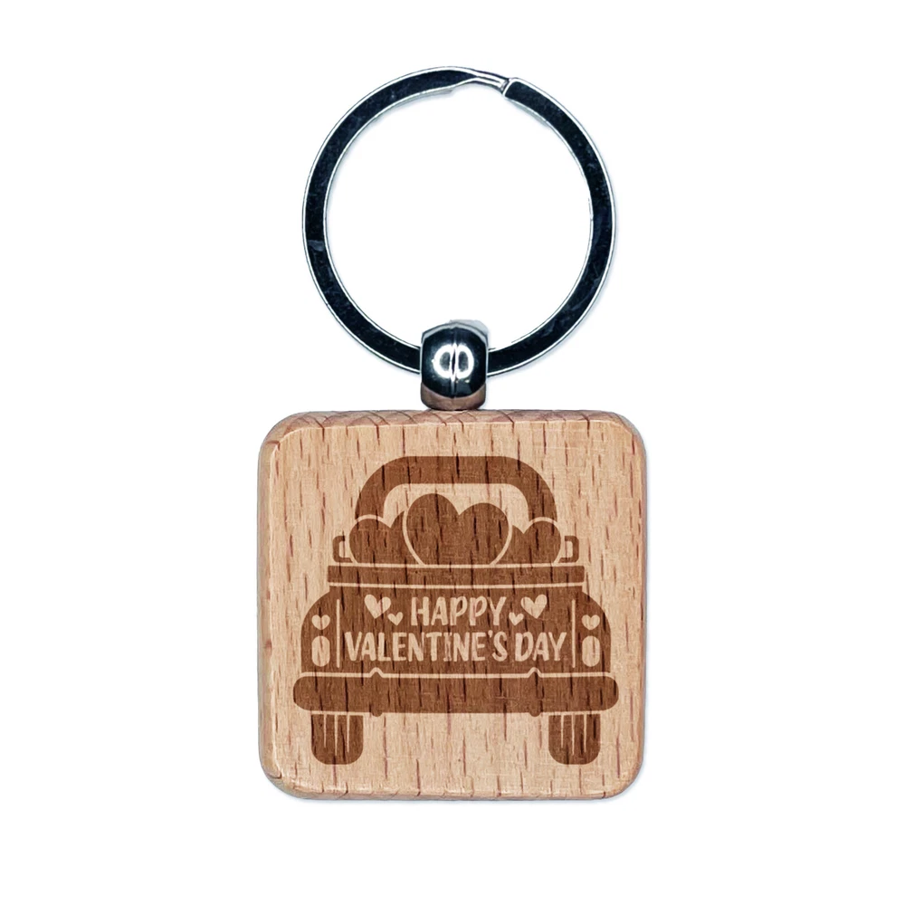 Happy Valentine's Day Truck Engraved Wood Square Keychain Tag Charm
