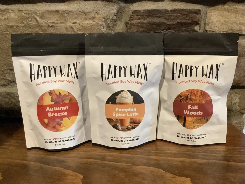 Happy Wax Signature Wax Warmer Flame Free Home Fragrance 3 Xtra Bags Wax Melts Brand New 2 oz Fall Woods scented soy wax melt 2 oz Autumn Breeze scented soy wax melt 2 oz Pumpkin Spice Latte soy wax melt
