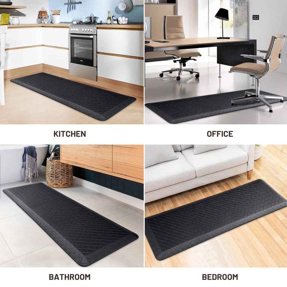 HappyTrends Kitchen Floor Mat - 4/5 Inch Thick Anti-Fatigue Kitchen Rug,Waterproof Non-Slip Kitchen Mats and Rugs Heavy Duty Ergonomic Comfort Rug for Kitchen,Office,Sink EXTRA SOFT:Extra thick kitchen mats are ergonomically designed for your comfort and are perfect choice for for people who spends a lot of time on their feet at work or at home.Cushioned support help improve circulation and posture while maintaining the firmness needed to keep a steady footing WATER RESISTANT:Our anti-fatigue mats are made of premium quality PVC material making it convenient to clean up and will not collect dirt;The material repels water,oils or stains and if anything spills,it makes an effortless clean up;Grid pattern surface never wrinkles and gives a premium texture without collecting debris NO TRIPPING:The non skid washable kitchen mats and rugs are designed with advanced beveled edge and non-slip backing helpful to protect you from slippage and tripping.Beveled edge with anti-curl prevents tripping and you can rely on to keep your family safe VERSATILITY:The memory foam kitchen floor mats provide extra large areas for standing in laundry room, kitchen, office, farmhouse,in front of sink or any other high-traffic indoor or outdoor space NON-SLIP:Nonslip PVC Bottom is manufactured so that they do not move around like other mats while a slight texture on the top makes them slip resistant; Rug must be placed on dry surface during use Have you ever suffered back aches caused by your uncomfortable posture while washing dishes, cooking, doing laundry or working? The HappyTrends kitchen rugs and mats can help provide a comfortable space for standing and working in the kitchen or in any work space. The anti-fatigue kitchen floor mat provides support to help relieve pressure for your feet, knees, joints, and lower back. Cushioned Support Extra thick anti-fatigue kitchen mat is ergonomically engineered and its cushioned support helps improve circulation and posture It is a must-have if you are on your feet for extended periods (such as chef, hair sylist, etc.). Anti-Slip Backing The foam mat for floor has a non-slip bottom to ensure that the mat will stay in place for added safety and stability. The anti-fatigue foam mat may be used on various floor surfaces. Waterproof and Easy to Clean The kitchen runner rug is easily cleaned; simply wipe dirt off with a damp cloth or use a hand-held vacuum as needed. The waterproof surface ensures long-term durability. Rip-Stop Premium PVC Material This comfort standing mat is made of heavy duty PVC material. The PVC is very durable and scratch resistant. The mat is built to last, even with continuous use. Shipping We offer FREE shipping on all orders! We use a selection of shipping services such as UPS, FedEx, USPS etc. We only ship to the lower 48 states, no APO/FPO addresses or PO Boxes allowed. Local pickups and combined shipping options are not provided at this time. Return You can return a product for up to 30 days from the date you purchased it. Any product you return must be in the same condition you received it and in the original packaging. Please keep the receipt. Payment We accept payment by any of the following methods: PayPal Please pay as soon as possible after winning an auction, as that will allow us to post your item to you sooner! Feedback Customer satisfaction is very important to us. If you have any problem with your order, please contact us and we will do our best to make you satisfied. Contact Us If you have any queries, please contact us via ebay. We usually respond within 24 hours on weekdays. Please visit our eBay store to check out other items for sale! Thank you for shopping at our store.