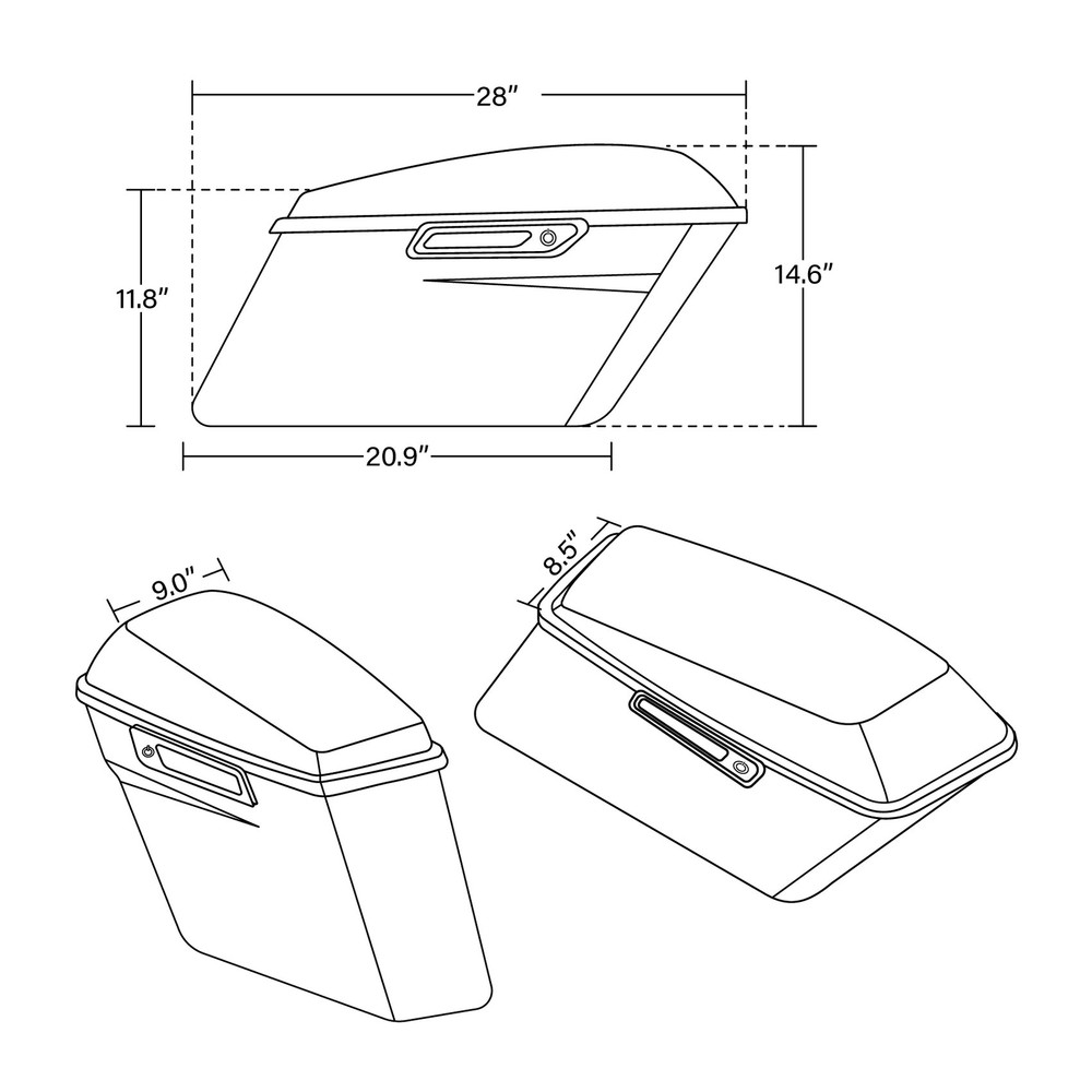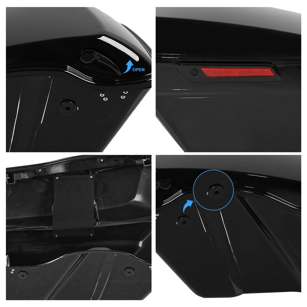 Hard Saddlebags Fits For Harley Touring Street Road King Glide 2014-2024 Black Fitment: Fit For Harley Touring Models 2014-2024. More Information: Newly manufactured by CCI. High quality ABS. Bright black finish (painted). Size: as shown in the picture. (External size measurement) Easy to install back in place without adjustments. Pre-drilled holes for easy installation. Painted bright black and ready to install. No install instructions. Included Items: 1 Pair Left & Right Saddlebags (Included 2 Keys + 2 Latches) 1.Package handling takes about 2 business days at our warehouse, so please make sure entering correct payment and shipping information before checking out. 2.All domestic orders will be shipped via USPS or Fedex from our US warehouse and usually arrives in about 2-7 business days. 3.Local pick up is not available. Buyers – Please Note •Import duties, taxes and charges are not included in the item price or shipping charges. These charges are the buyer's responsibility. Please check with your country's customs office to determine what these additional costs will be prior to bidding/buying. Return Policy •When you receive item damaged, not as describe or wrong one, please email us pictures within 72 hours to resolve any problem better and faster: 1.All labels with clear words on the package; 2.The real goods you receive; 3.Different angles of the products and package to show the problem clearly. Fitment: Fit For Harley Touring Models 2014-2024. More Information: Newly manufactured by CCI. High quality ABS. Bright black finish (painted). Size: as shown in the picture. (External size measurement) Easy to install back in place without adjustments. Pre-drilled holes for easy installation. Painted bright black and ready to install. No install instructions. Included Items: 1 Pair Left & Right Saddlebags (Included 2 Keys + 2 Latches) SHIPPING 1.Package handling takes about 2 business days at our warehouse, so please make sure entering correct payment and shipping information before checking out. 2.All domestic orders will be shipped via USPS or Fedex from our US warehouse and usually arrives in about 2-7 business days. 3.Local pick up is not available. Terms of Sale Buyers – Please Note •Import duties, taxes and charges are not included in the item price or shipping charges. These charges are the buyer's responsibility. Please check with your country's customs office to determine what these additional costs will be prior to bidding/buying. Return Policy •When you receive item damaged, not as describe or wrong one, please email us pictures within 72 hours to resolve any problem better and faster: 1.All labels with clear words on the package; 2.The real goods you receive; 3.Different angles of the products and package to show the problem clearly.