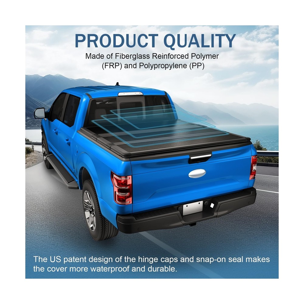 Hard Tri-Fold Truck Bed Tonneau Cover Compatible with 2009-2023 Dodge Ram 1500 2500 5.7FT Bed Description Features: [VEHICLE MODEL FIT] Compatible with 2009-2023 Dodge Ram 1500 2500 5.7FT Bed. Please verify your bed length before ordering. [EXCELLENT MATERIAL] FRP panels and internal honeycomb structure support, resist the impact of heavy objects, protect your cargo from the elements & theft. Waterproof, snow proof and dirt proof, keeps truck bed dry and secure. [PRACTICAL FUNCTION] Suitable for various weather conditions, including rainy and snowy days. It can not only decorate your truck, but also improve fuel economy and protect your shopping, toys, and camping supplies. It can prevent your items from being stolen or rained on the cover. [EASY INSTALLATION] Easy to install, no drilling and further modification. Provided necessary hardware and instructions for installation. Easy to use clamping system secures the cover to your truck, so it won't detach when you're. [WARRANTY] Provide one year warranty. For any reason, if you are not satisfied with your purchase, contact us directly. Product Details: Brand: DICMIC Style: Folding Exterior Finish: Fiber Reinforced Plastic Material: FRP Lock Type: Tailgate Brand: DICMIC Style: Folding Exterior Finish: Fiber Reinforced Plastic Material: FRP Lock Type: Tailgate Manufacturer: DICMIC Automotive Fit Type: Vehicle Specific Fit Model: Dodge Ram Truck Bed Tonneau Cover Item Weight: 62.6 pounds Product Dimensions: 72.05 x 26.77 x 5.31 inches Item model number: DICMIC-H212 Manufacturer Part Number: DICMIC-H212 Date First Available: December 15, 2023 Delivery We Do Not Ship Outside of the Continental US. Return Policy All items qualify for returns within 30 days of receipt. Buyer is responsible for return shipping on any item that is not damaged. Feedback We take our reputation seriously, we buy and sell online, so we understand the value of trust. If you are unsatisfied with your order, please contact us and we will work with you to resolve it to your satisfaction.
