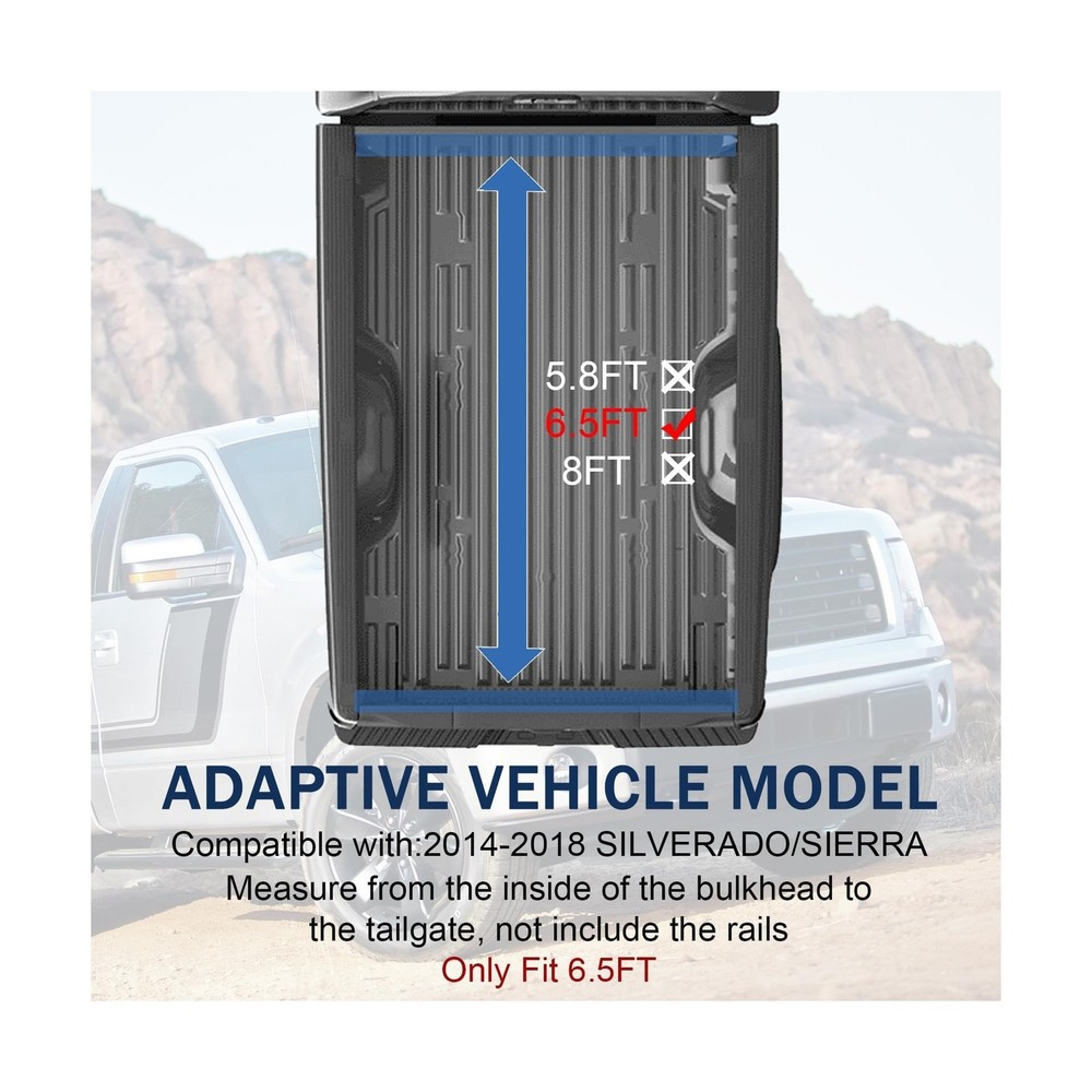 Hard Tri-Fold Truck Bed Tonneau Cover Compatible with 2014-2018 Chevy Silverado GMC Sierra 6.5FT Not for CarbonPro Bed Description Features: [VEHICLE MODEL FIT] Compatible with 2014-2018 Chevy Silverado 6.5FT Bed, compatible with 2014-2018 GMC Sierra 6.5FT Bed, not for CarbonPro Bed. Please verify your bed length before ordering. [EXCELLENT MATERIAL] FRP panels and internal honeycomb structure support, resist the impact of heavy objects, protect your cargo from the elements & theft. Waterproof, snow proof and dirt proof, keeps truck bed dry and secure. [PRACTICAL FUNCTION] Suitable for various weather conditions, including rainy and snowy days. It can not only decorate your truck, but also improve fuel economy and protect your shopping, toys, and camping supplies. It can prevent your items from being stolen or rained on the cover. [EASY INSTALLATION] Easy to install, no drilling and further modification. Provided necessary hardware and instructions for installation. Easy to use clamping system secures the cover to your truck, so it won't detach when you're. [WARRANTY] Provide one year warranty. For any reason, if you are not satisfied with your purchase, contact us directly. Product Details: Brand: DICMIC Style: Folding Exterior Finish: Aluminum Material: FRP Lock Type: Tailgate Brand: DICMIC Style: Folding Exterior Finish: Aluminum Material: FRP Lock Type: Tailgate Manufacturer: DICMIC Automotive Fit Type: Vehicle Specific Fit Model: Chevy Silverado GMC Sierra Truck Bed Tonneau Cover Item Weight: 73.7 pounds Product Dimensions: 70.87 x 30.71 x 5.31 inches Item model number: DICMIC-H141 Manufacturer Part Number: DICMIC-H141 Date First Available: December 15, 2023 Delivery We Do Not Ship Outside of the Continental US. Return Policy All items qualify for returns within 30 days of receipt. Buyer is responsible for return shipping on any item that is not damaged. Feedback We take our reputation seriously, we buy and sell online, so we understand the value of trust. If you are unsatisfied with your order, please contact us and we will work with you to resolve it to your satisfaction.