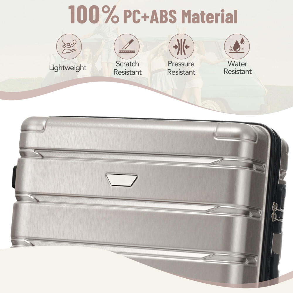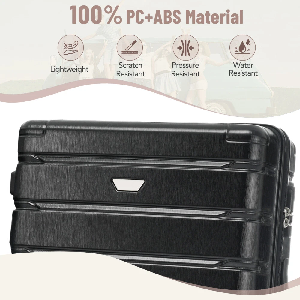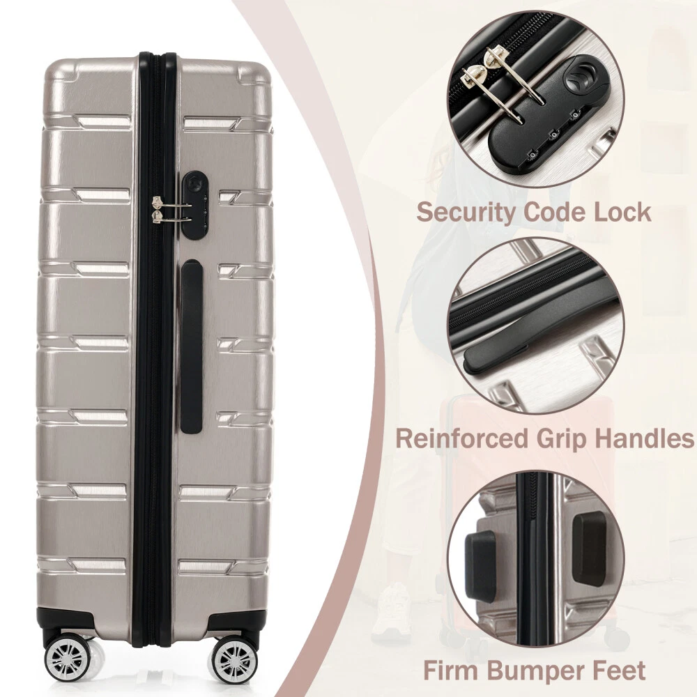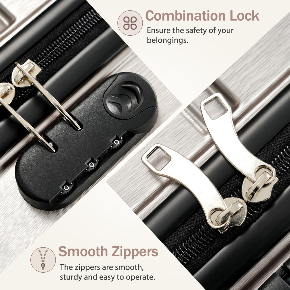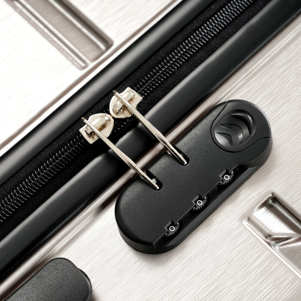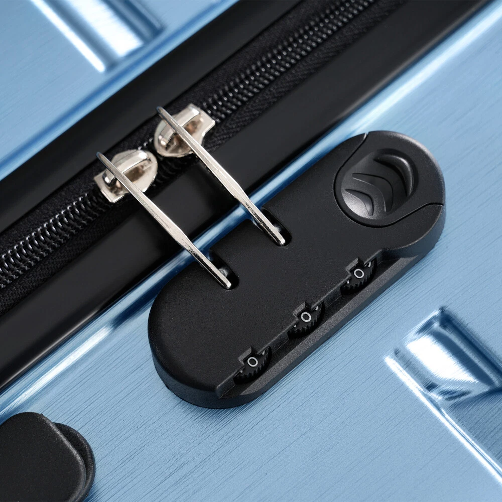 Premium ABS+PC Material: Made from high-quality ABS+PC, this hardshell luggage offers exceptional durability and impact resistance. The brushed finish provides a sleek, glossy look while minimizing the appearance of scratches, making your suitcase not only sturdy but also stylish for any travel adventure. Effortless Maneuverability: Suitcase with four 360° spinner wheels and a telescopic handle, designed for effortless glide in any direction. The dual-wheel design ensures easy maneuverability, allowing you to navigate through crowded airports or busy streets with minimal effort—making your travel experience stress-free and convenient. Spacious and Organized Interior: The spacious interior features a zippered divider and cross strap to keep your belongings separated and secure. Whether you're packing clothes, toiletries, or other essentials, everything stays neatly in place, ensuring your items are safe and easily accessible throughout your journey. Convenience and Stability: The suitcase features a convenient side handle for easy lifting and carrying. The sturdy bumper feet keep the luggage stable when placed on the ground, minimizing contact with the surface to reduce wear and tear. Save Space: The suitcases in 3 sizes can be nested inside each other to save storage space. 20 inch: 13.8 x 8.9 x 21.3", weight: 5.95lb. 24 inch: 17.3 x 10 x 25.7", weight: 8.16lb. 28 inch: 19.5 x 11.3 x 29.4", weight: 9.7lb. HOW TO RESET THE LOCK 1、The lock is set to 0-0-0 at the factory. 2、Set the lock to the unlockable state. 3、Press and hold the unlock button while you set a new password. 4、Release the unlock button, and the new password is set.