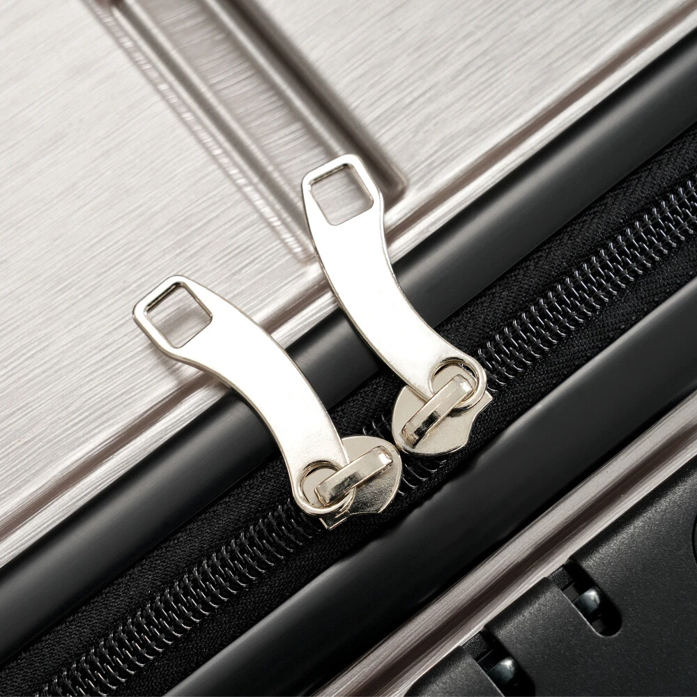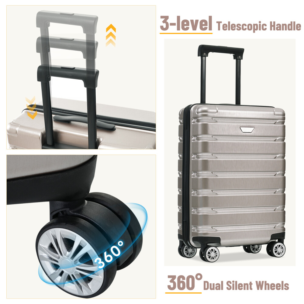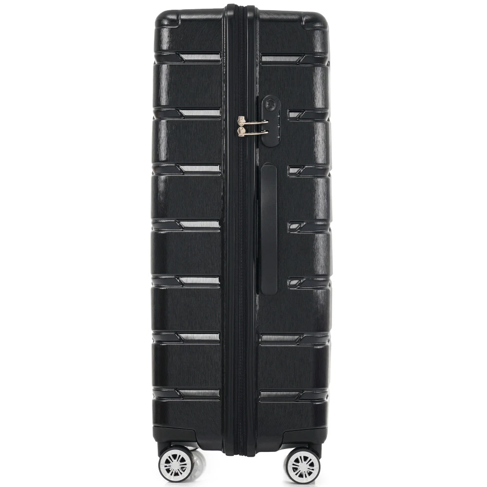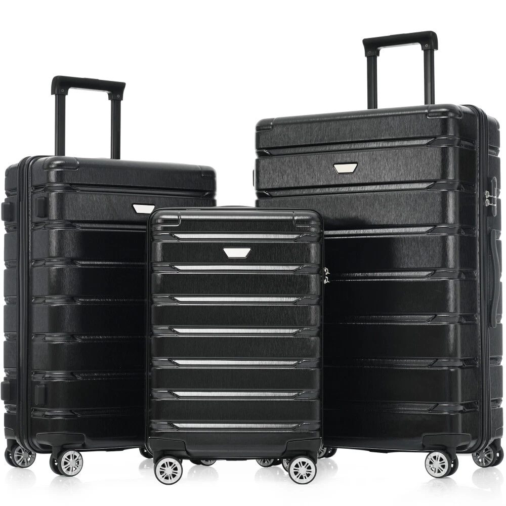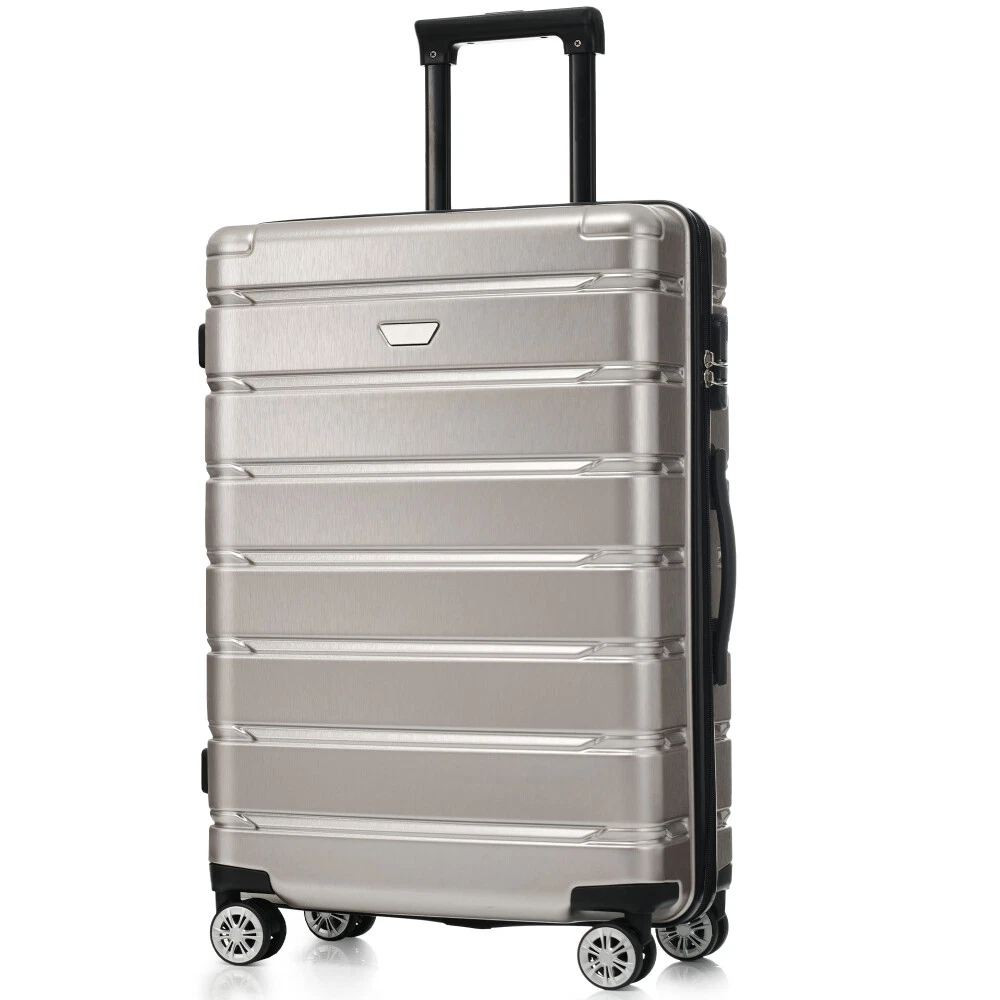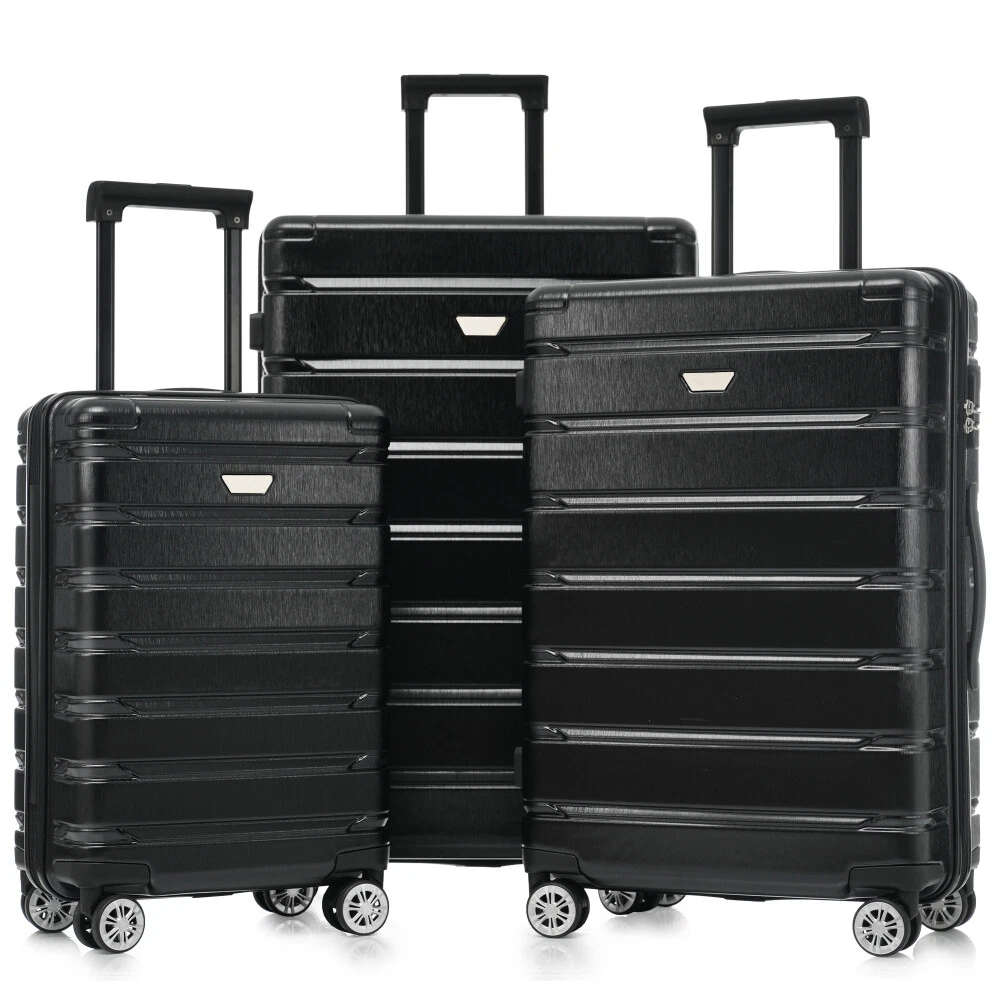 Premium ABS+PC Material: Made from high-quality ABS+PC, this hardshell luggage offers exceptional durability and impact resistance. The brushed finish provides a sleek, glossy look while minimizing the appearance of scratches, making your suitcase not only sturdy but also stylish for any travel adventure. Effortless Maneuverability: Suitcase with four 360° spinner wheels and a telescopic handle, designed for effortless glide in any direction. The dual-wheel design ensures easy maneuverability, allowing you to navigate through crowded airports or busy streets with minimal effort—making your travel experience stress-free and convenient. Spacious and Organized Interior: The spacious interior features a zippered divider and cross strap to keep your belongings separated and secure. Whether you're packing clothes, toiletries, or other essentials, everything stays neatly in place, ensuring your items are safe and easily accessible throughout your journey. Convenience and Stability: The suitcase features a convenient side handle for easy lifting and carrying. The sturdy bumper feet keep the luggage stable when placed on the ground, minimizing contact with the surface to reduce wear and tear. Save Space: The suitcases in 3 sizes can be nested inside each other to save storage space. 20 inch: 13.8 x 8.9 x 21.3", weight: 5.95lb. 24 inch: 17.3 x 10 x 25.7", weight: 8.16lb. 28 inch: 19.5 x 11.3 x 29.4", weight: 9.7lb. HOW TO RESET THE LOCK 1、The lock is set to 0-0-0 at the factory. 2、Set the lock to the unlockable state. 3、Press and hold the unlock button while you set a new password. 4、Release the unlock button, and the new password is set.