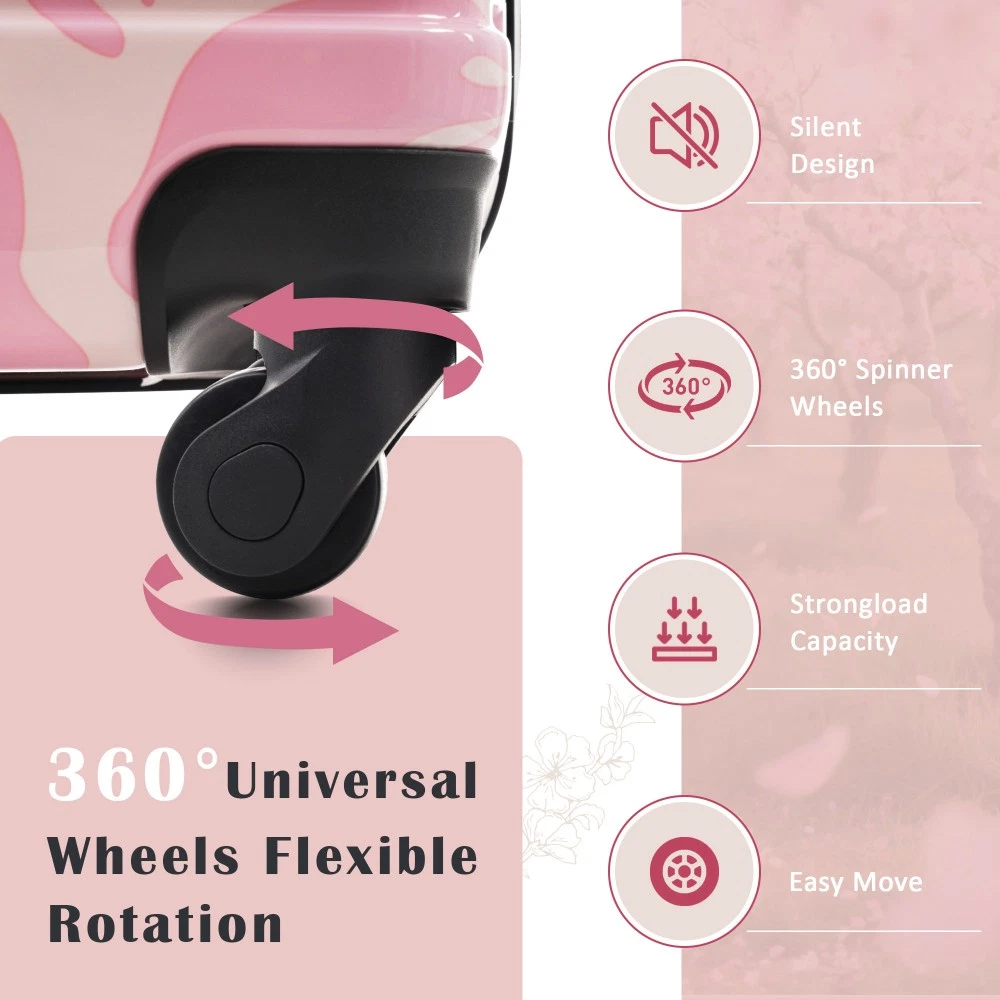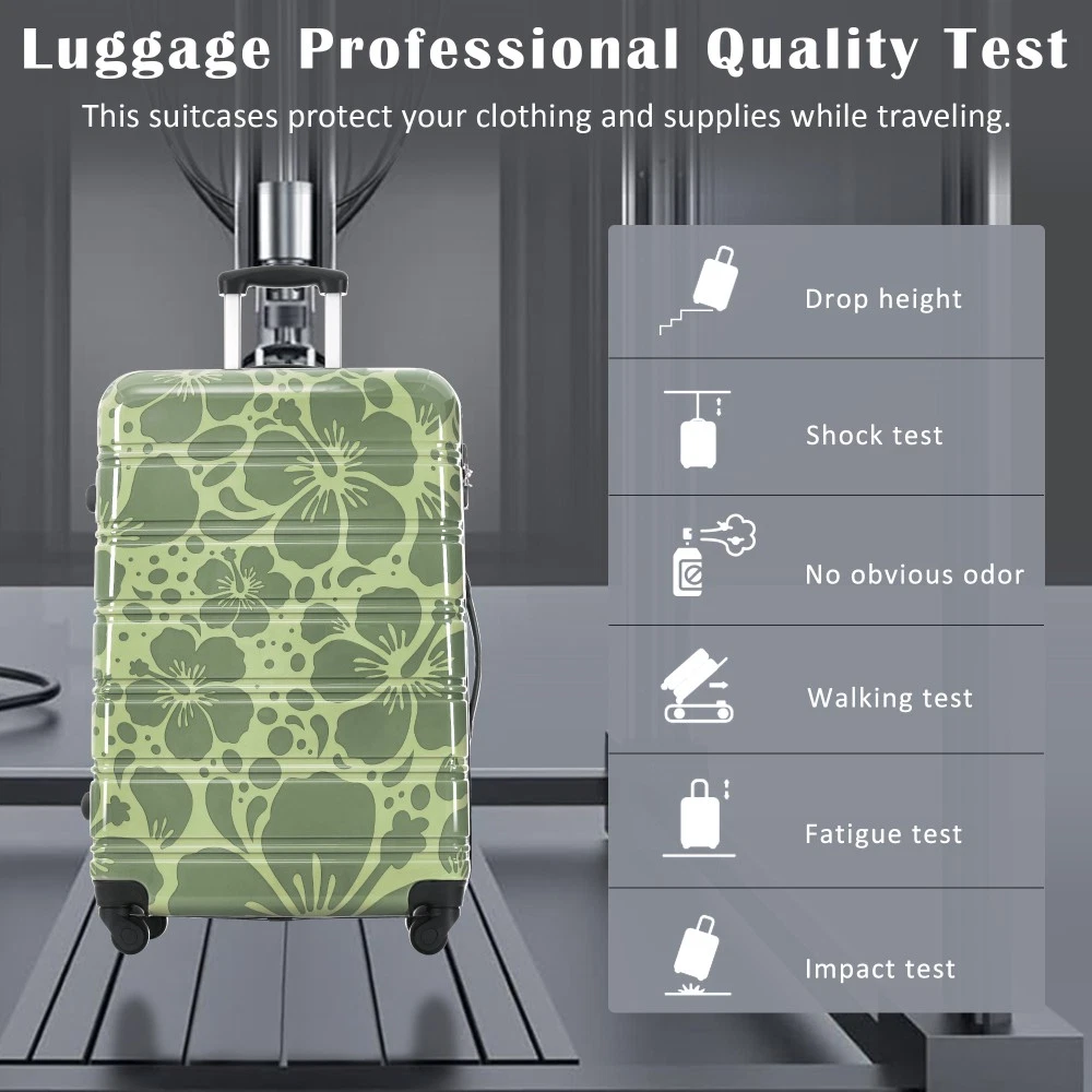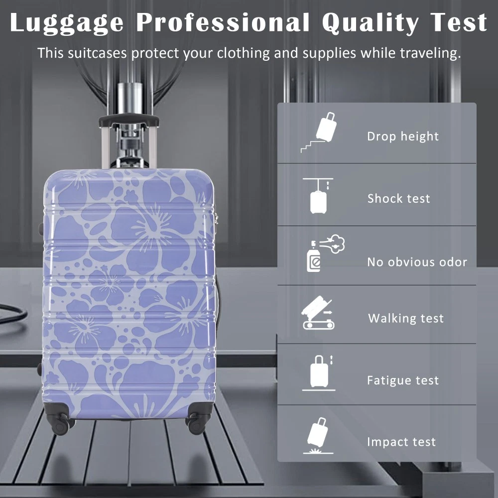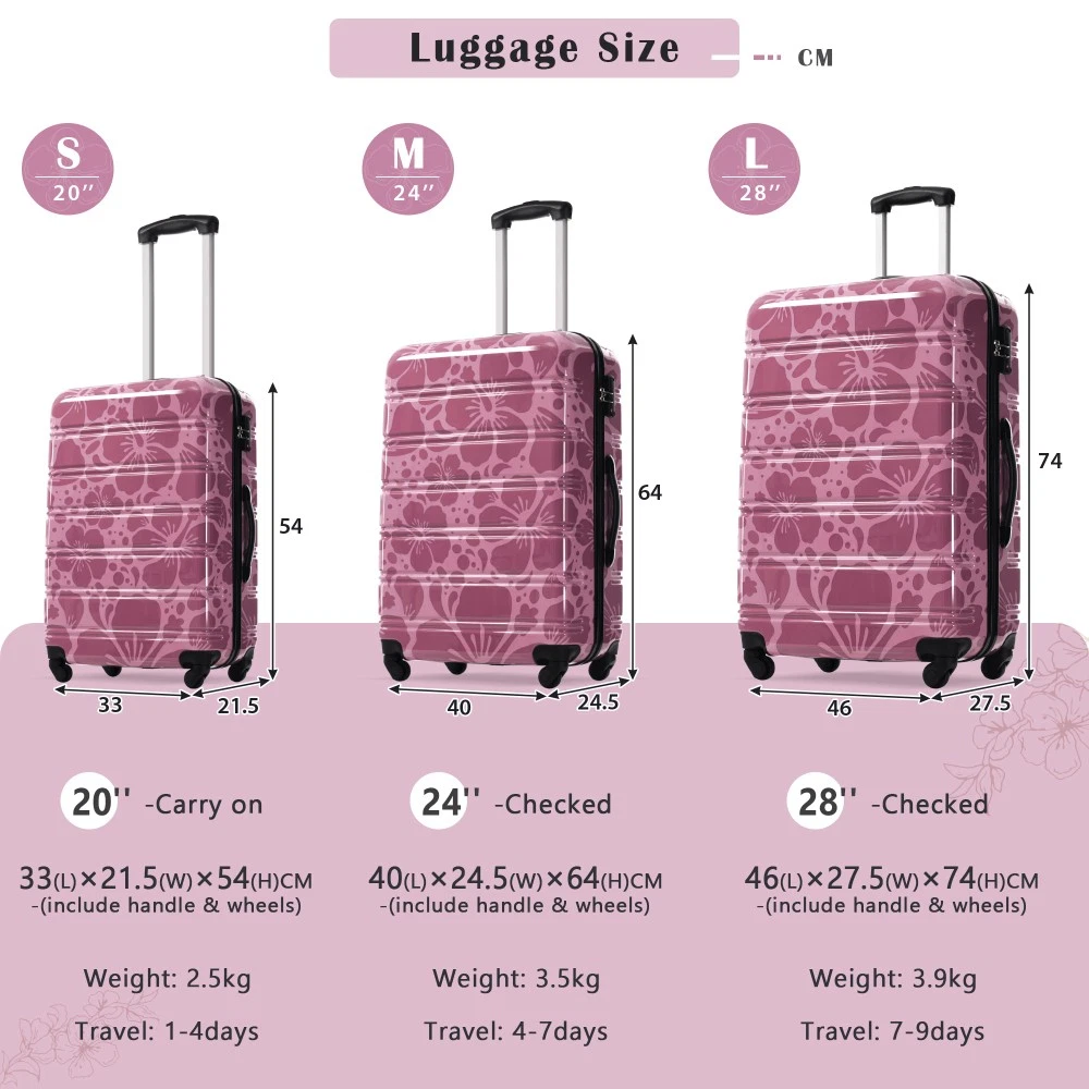 The 3 p ieces set includes 20 inches, 24 inches and 28 inches. One set just satisfies all your different travelling needs.The printed suitcase is very summery and will turn you into a fashion expert in seconds. Material: These luggage sets with wheels are made from high tenacity PC material, harder and more resistant to pressure, effectively reducing damage caused by collisions during travel. Protection: Each suitcase is covered with a protective film, which can be removed before use to avoid bumps and scratches during transportation. Safe:Side mounted TSA lock which allows only TSA agents to inspect your suitcase sets without damaging the lock. Zippers are not easy to be pierced by sharp tools, that protects your stuffs in luggage and privacy more better. Carry & Move:Silicone handles make it easier to lift your suitcases when going up and down stairs. Sturdy 3-step telescoping handle slso allow you to maneuver in tight spaces and provide effortless movement. We have perfected our hard case luggage collections, with high quality material molded body coveted. Instructions for Reset the combination lock 1.The lock is Pre set to 0-0-0; 2. Push the button on the broadside, while in this position, set each number to your preference; 3. Release the button and your combination is now set; 4.Take care when setting the numbers to not release the button while setting it. Note: None of the three dimensions of this suitcase are expandable.