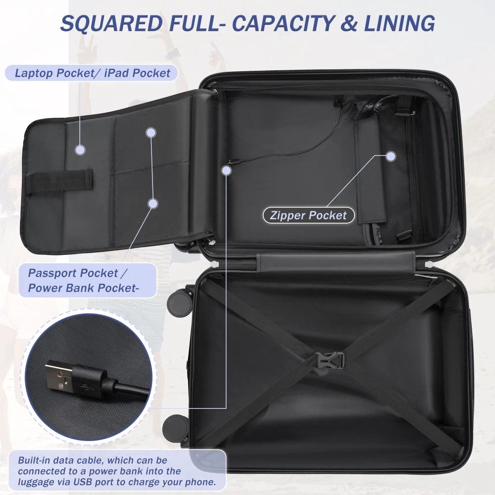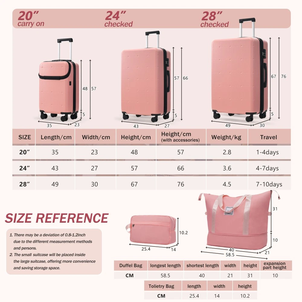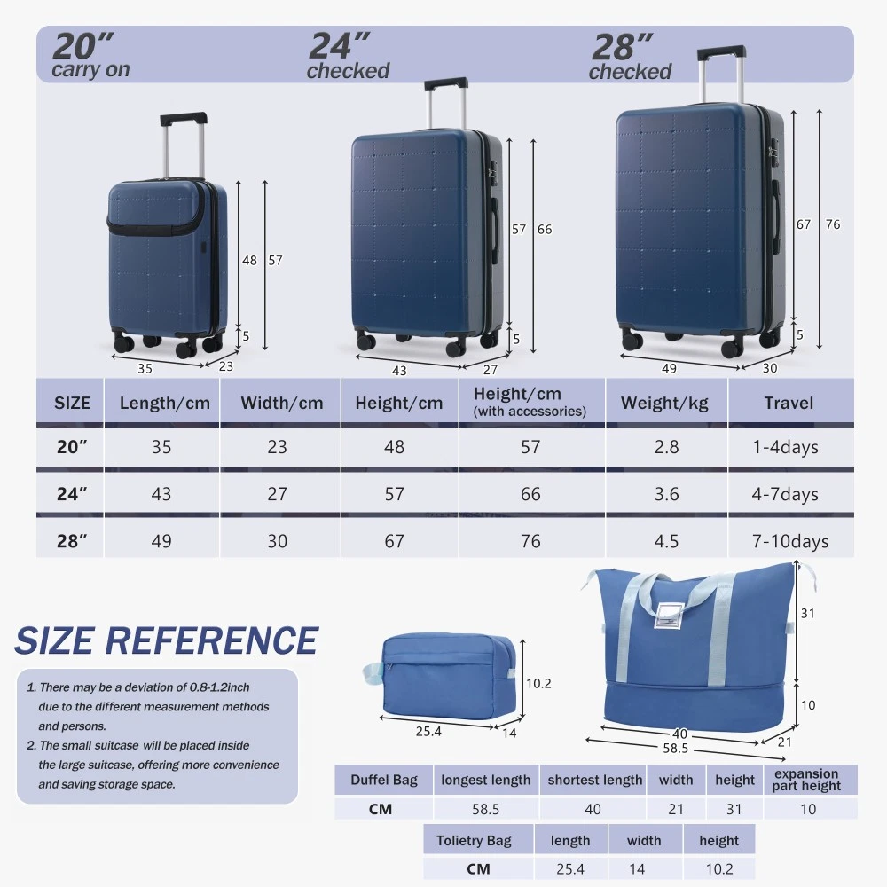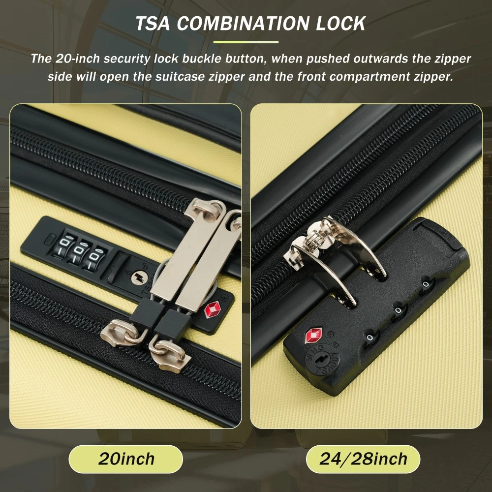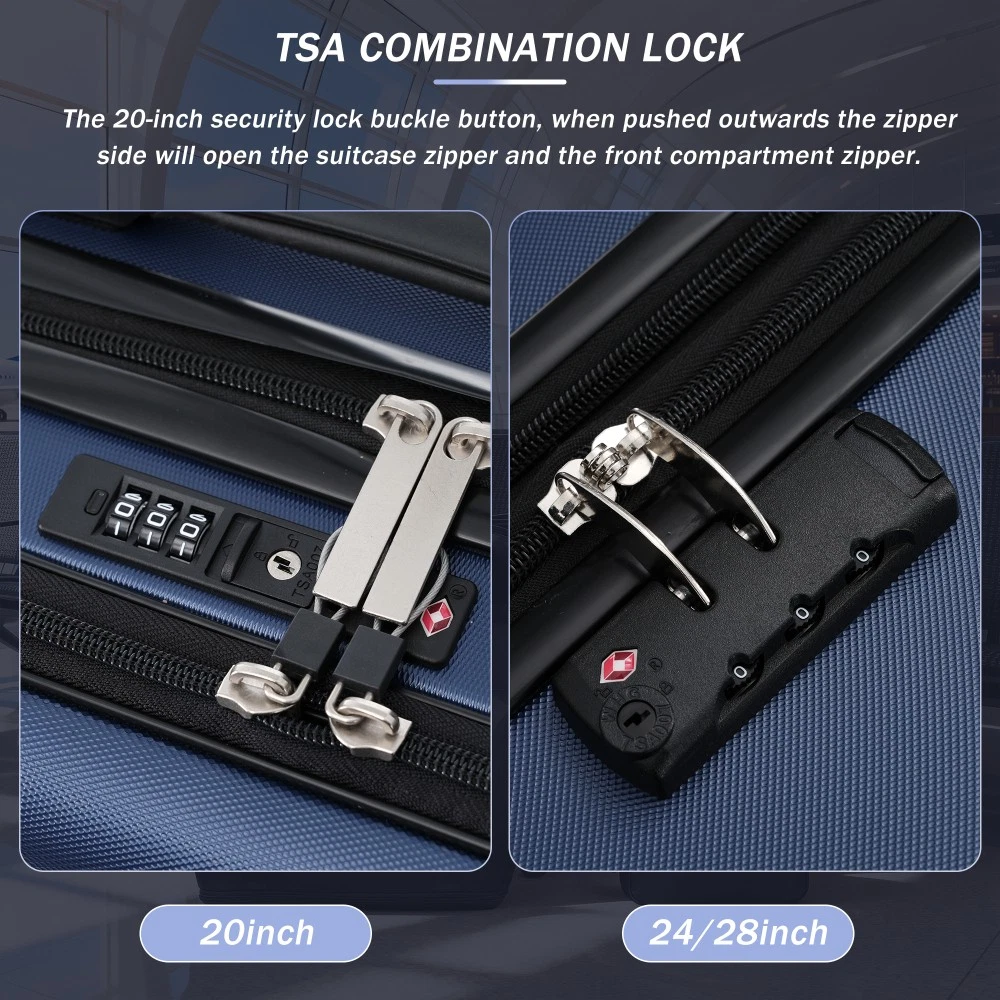 Durable Material: Crafted from high-quality ABS, this 5-piece luggage set includes 20"(half-opening)24" (common) and 28"(common) suitcases and 1 duffel bag & 1 toiletry bag that are lightweight .The matching bags are made of tightly crafted fabric, adding more convenience to your travel. 20 Carry on Luggage: The 20-inch carry-on is ideal for short trips, built-in USB port and data cable for charging devices on the go (power supply not included). The front half-opening design allows you to carry computers, ipads and other items with easy access. Expandable Space (24"+28" ): The 24-inch & 28-inchsuitcase offer more expandable space, giving you more room for packing when you need it most, ideal for longer trips or extra belongings. Safe: Our 3-piece luggage sets are equipped with explosion-proof double zippers, offering an additional storage space. The TSA lock is designed to avoid violent damage to the luggage, which allows only customs agents to inspect your bags without damaging the lock when traveling. Travel Luggage Accessories: Duffel bag can be used to organize and store personal items for easy portability. The luggage bag has a pocket on the back that can be put on the luggage handle, which is very convenient for travel. We have perfected our hard case luggage collections, with high quality material molded body coveted. Instructions for Reset the 3 Digit Secure TSA Lock--20 inch The original combination is 0-0-0. To set your own combination, please follow these steps: 1) With the lock in the 0-0-0 position. 2) Press down the reset button [A] with a pen or other tool until you hear a "click"sound. 3) Set your own combination by turning the dials [B]. For example, 8-8-8. 4) Push the button [C] in the direction of the arrow until you hear the "click"sound again, confirming that you have set your personal combination. Instructions for Reset the 3 Digit Secure TSA Lock--24 & 28 inch 1. The initial password of lock is 0-0-0. 2.Press the reset hole with the tip of the pen. 3.Set the new 3-digit code while pressing. 4.Now you can open the lock with the new password.