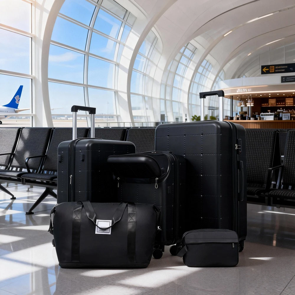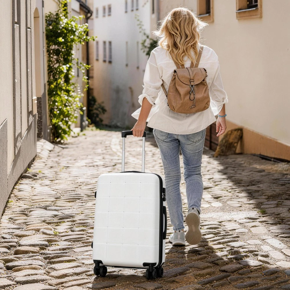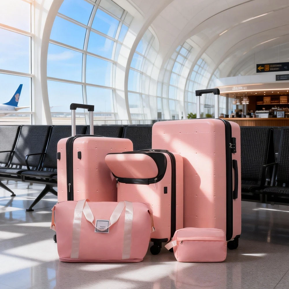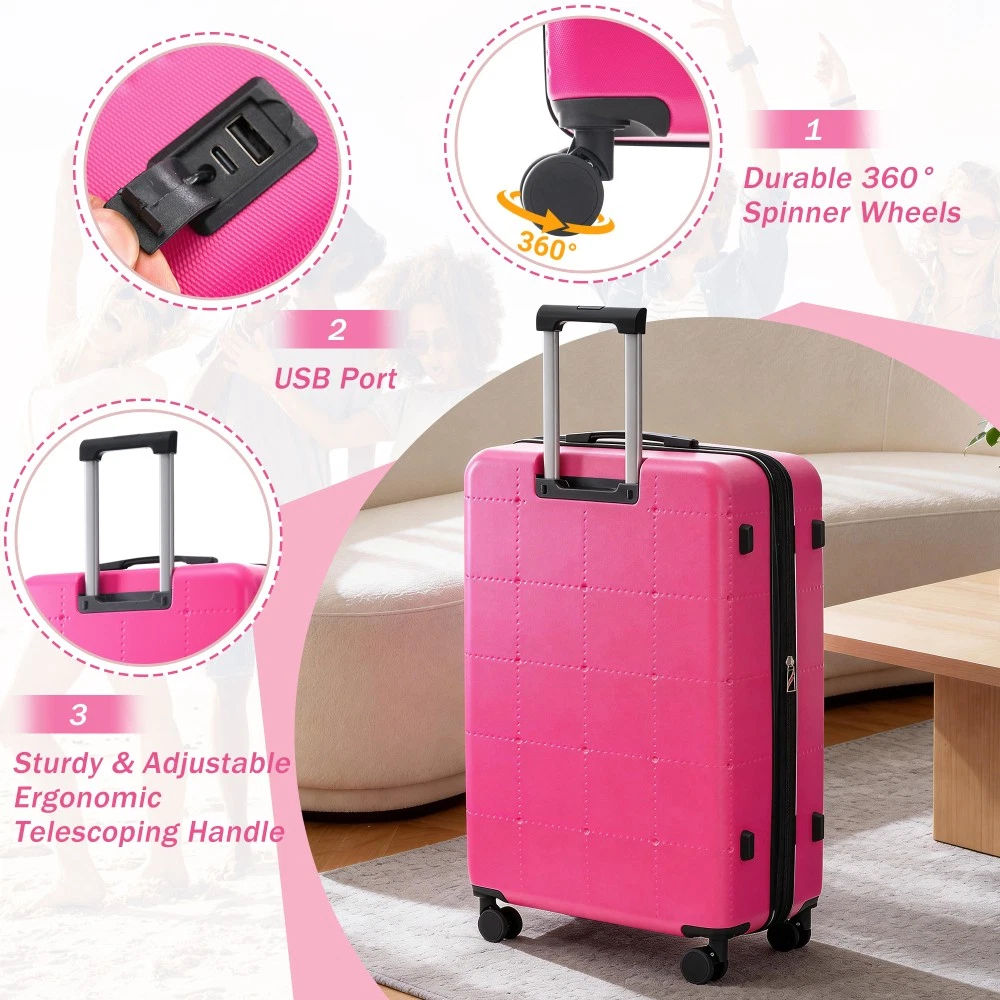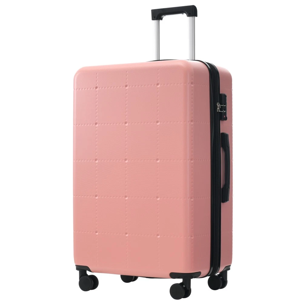 Durable Material: Crafted from high-quality ABS, this 5-piece luggage set includes 20"(half-opening)24" (common) and 28"(common) suitcases and 1 duffel bag & 1 toiletry bag that are lightweight .The matching bags are made of tightly crafted fabric, adding more convenience to your travel. 20 Carry on Luggage: The 20-inch carry-on is ideal for short trips, built-in USB port and data cable for charging devices on the go (power supply not included). The front half-opening design allows you to carry computers, ipads and other items with easy access. Expandable Space (24"+28" ): The 24-inch & 28-inchsuitcase offer more expandable space, giving you more room for packing when you need it most, ideal for longer trips or extra belongings. Safe: Our 3-piece luggage sets are equipped with explosion-proof double zippers, offering an additional storage space. The TSA lock is designed to avoid violent damage to the luggage, which allows only customs agents to inspect your bags without damaging the lock when traveling. Travel Luggage Accessories: Duffel bag can be used to organize and store personal items for easy portability. The luggage bag has a pocket on the back that can be put on the luggage handle, which is very convenient for travel. We have perfected our hard case luggage collections, with high quality material molded body coveted. Instructions for Reset the 3 Digit Secure TSA Lock--20 inch The original combination is 0-0-0. To set your own combination, please follow these steps: 1) With the lock in the 0-0-0 position. 2) Press down the reset button [A] with a pen or other tool until you hear a "click"sound. 3) Set your own combination by turning the dials [B]. For example, 8-8-8. 4) Push the button [C] in the direction of the arrow until you hear the "click"sound again, confirming that you have set your personal combination. Instructions for Reset the 3 Digit Secure TSA Lock--24 & 28 inch 1. The initial password of lock is 0-0-0. 2.Press the reset hole with the tip of the pen. 3.Set the new 3-digit code while pressing. 4.Now you can open the lock with the new password.