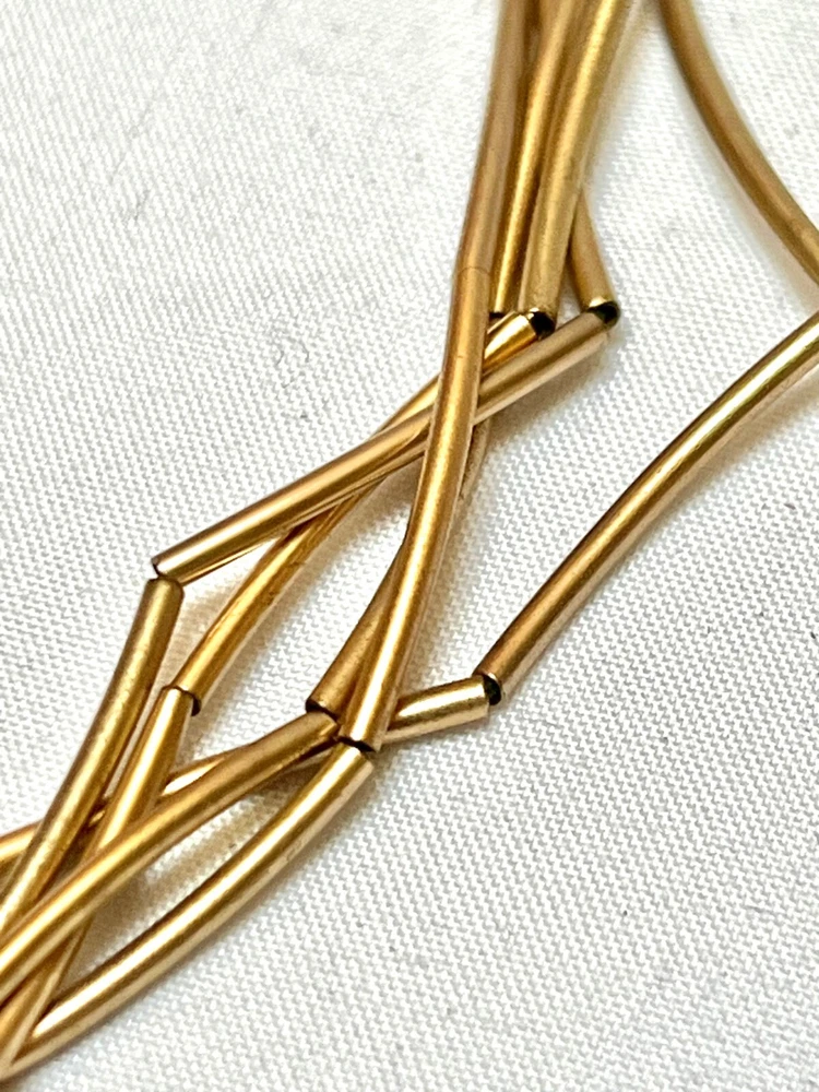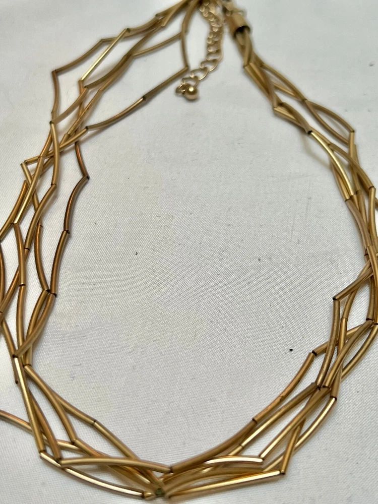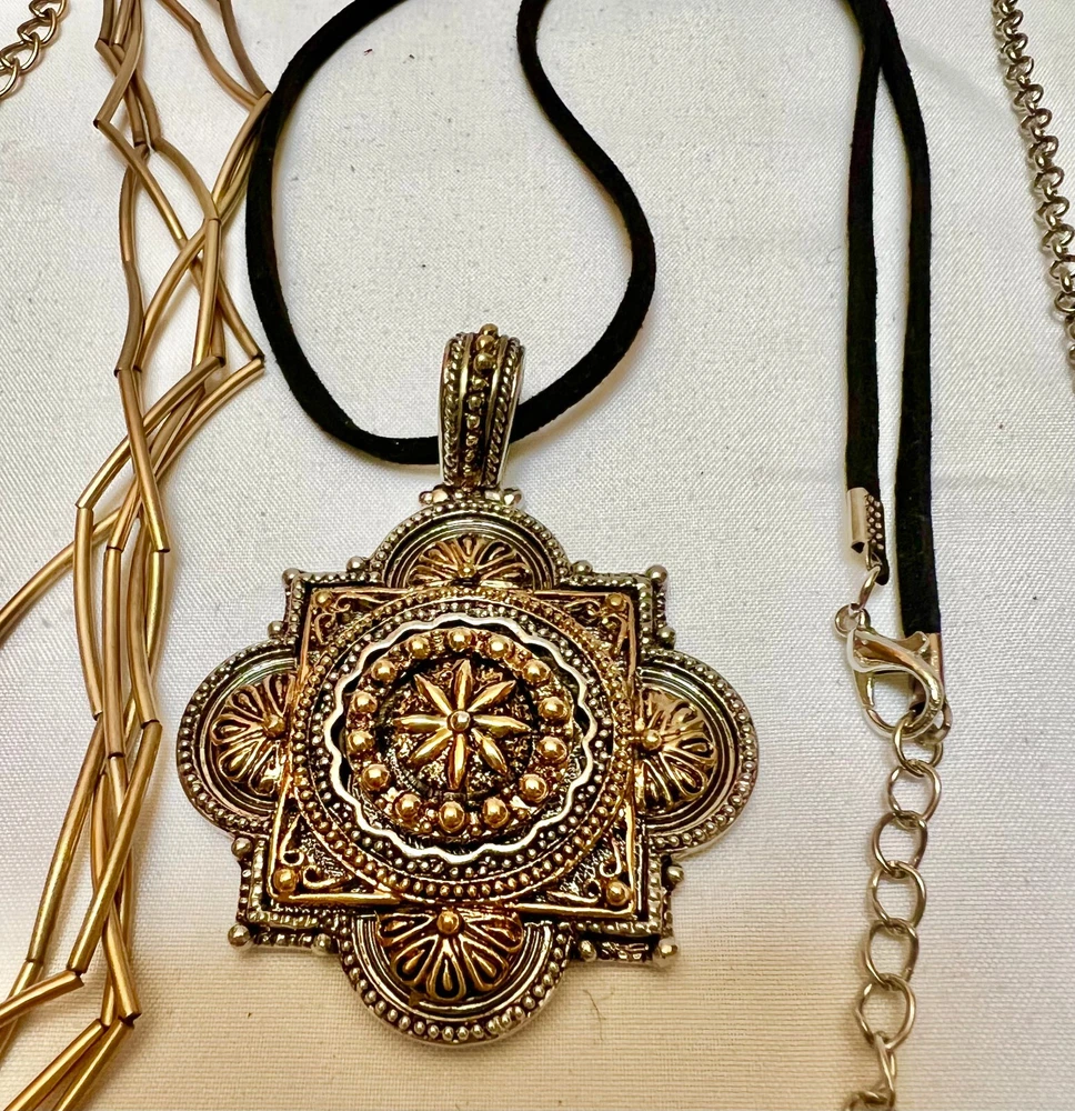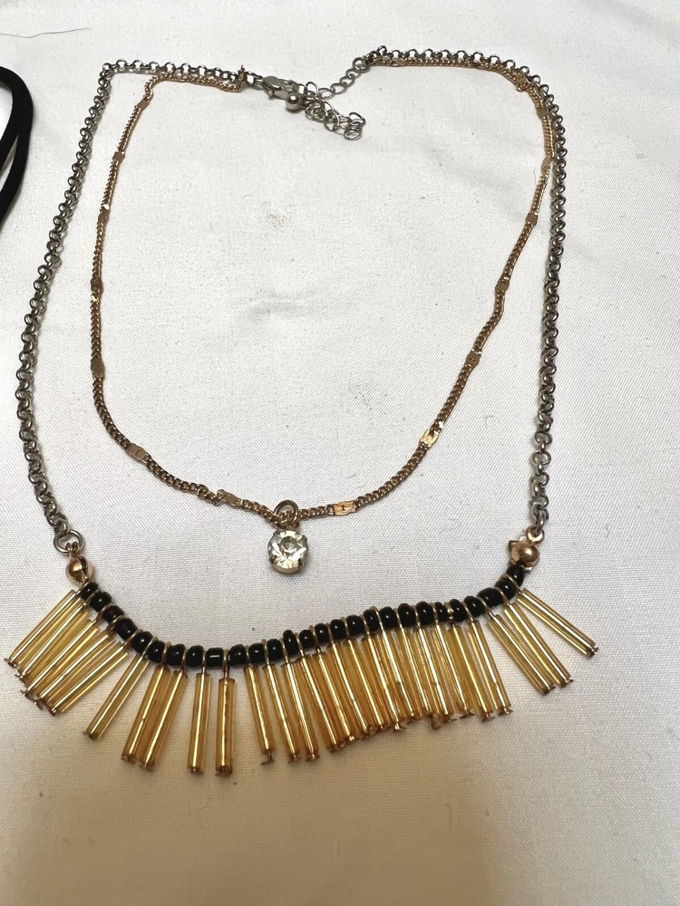 There are three pretty necklaces in this bundle. The gold and silver tone is signed Roman and hands on a black leather cord. Necklace measures 18" +2" esxtension. The gold metal tube necklace is made of 5 strands and measures 16" + 3" extension. The two strand necklace is a gold tone tube design that dangles with black seed bead spacers. The second strand is a solitaire faux diamond. All the pieces are fun casual style necklaces in good wearable condition and ready to enjoy.