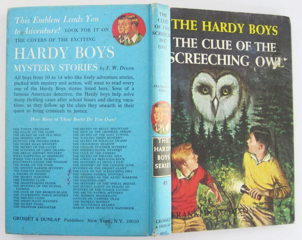 Circa 1973 edition of the Hardy Boys hardcover book "The Clue of the Screeching Owl," #41 in the series 20 chapters. Endpapers are the white multi type. Hardcover, from Grosset & Dunlap List of books on back ends at "Shattered Helmet," interior lists to "Aztec Warrior." Condition: Good condition overall, has a small dent/divot on cover, some small tick marks in pen on the back checklist. No writing or tears inside, minor wear. PLEASE NOTE: We do not have the Carpentieri reference, so if you have specific questions about this item's exact publication date, please ask us. BUY MORE AND SAVE! If you are buying multiple items, we offer combined shipping for actual ship cost! Simply "Agree to Buy" the items, then choose "Request Invoice from Seller." RETURNS: Accepted if item is still in its originally mailed condition. We do not accept returns on items that have been altered by the buyer. Feel free to ask questions if you have them - we offer discounts on multiple purchases! CLICK OR TAP HERE TO SEE ALL THE HARDY BOYS BOOKS IN OUR EBAY STORE! LOTS of vintage versions! CLICK OR TAP HERE to visit our eBay Store and save on shipping with ONE INTERNET STOP! With over 1500 different items to choose from, we have something for every kid on your list (even the big ones)! Buy with confidence from us -- we have over 20 years experience selling on eBay and other venues!