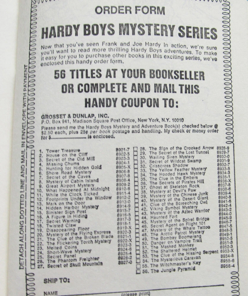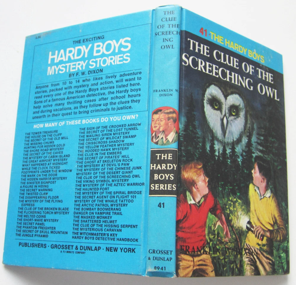 Circa 1977 edition of the Hardy Boys hardcover book "The Clue of the Screeching Owl," #41 in the series 20 chapters. Endpapers are the white multi type. Hardcover, from Grosset & Dunlap List of books on back ends at "Witchmaster's Key," interior lists to "Jungle Pyramid" (1977). Condition: Excellent condition, no writing or tears, minor wear, barely used if at all. PLEASE NOTE: We do not have the Carpentieri reference, so if you have specific questions about this item's exact publication date, please ask us. BUY MORE AND SAVE! If you are buying multiple items, we offer combined shipping for actual ship cost! Simply "Agree to Buy" the items, then choose "Request Invoice from Seller." RETURNS: Accepted if item is still in its originally mailed condition. We do not accept returns on items that have been altered by the buyer. Feel free to ask questions if you have them - we offer discounts on multiple purchases! CLICK OR TAP HERE TO SEE ALL THE HARDY BOYS BOOKS IN OUR EBAY STORE! LOTS of vintage versions! CLICK OR TAP HERE to visit our eBay Store and save on shipping with ONE INTERNET STOP! With over 1500 different items to choose from, we have something for every kid on your list (even the big ones)! Buy with confidence from us -- we have over 20 years experience selling on eBay and other venues!