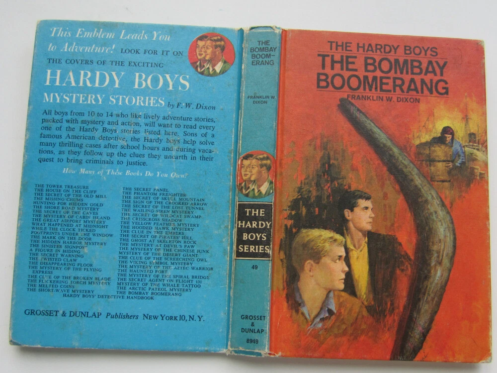 Circa 1970 printing of the Hardy Boys mystery "Bombay Boomerang," #49 in the series, in great condition. Hardcover, from Grosset & Dunlap. List of books on back ends at this one, no interior list, thus we assume an early edition. Very good overall, no writing or tears, spine and back cover have edgewear and some light staining, other minor wear. A nice copy. BUY MORE AND SAVE! If you are buying multiple items, we offer combined shipping for actual ship cost! Simply "Agree to Buy" the items, then choose "Request Invoice from Seller." RETURNS: Accepted if item is still in its originally mailed condition. We do not accept returns on items that have been altered by the buyer. Feel free to ask questions if you have them - we offer discounts on multiple purchases! CLICK OR TAP HERE TO SEE ALL THE HARDY BOYS BOOKS IN OUR EBAY STORE! LOTS of vintage versions! CLICK OR TAP HERE to visit our eBay Store and save on shipping with ONE INTERNET STOP! With over 1500 different items to choose from, we have something for every kid on your list (even the big ones)! Buy with confidence from us -- we have over 20 years experience selling on eBay and other venues!