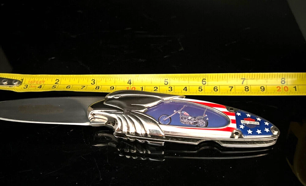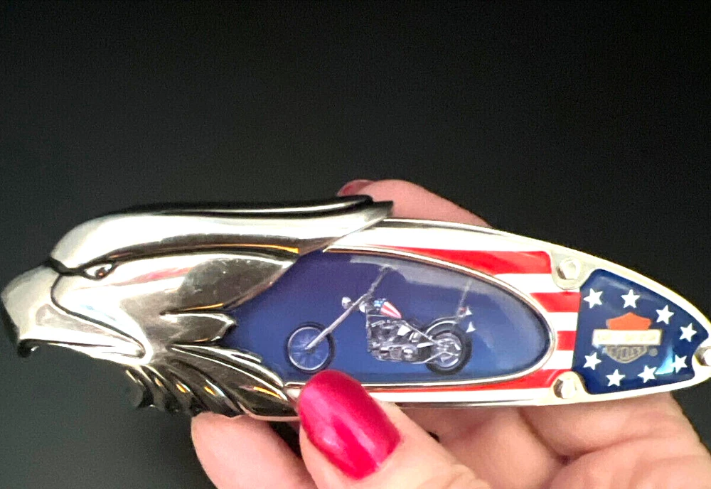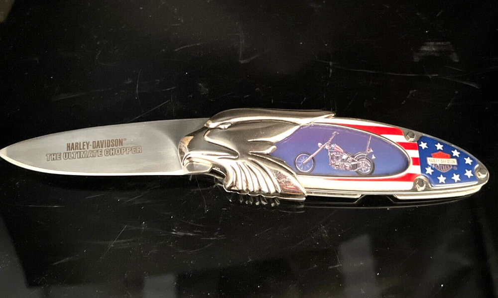This Harley Davidson Series pocketknife by Franklin Mint is a must-have for any collector or fan of the iconic brand. The knife features a multi-colored handle and a plain edge stainless steel blade with a spear point. It is manually opened and has one blade. The handle is made of plastic and the knife is an original, not a reproduction. This knife is part of the Easy Rider Collector series and is perfect for display or use. The knife is a great addition to any collection and is sure to impress any fan of Harley Davidson. This knife has not been used and i in very nice condition I will pack with care and get it to you ASAP Thank you for looking !