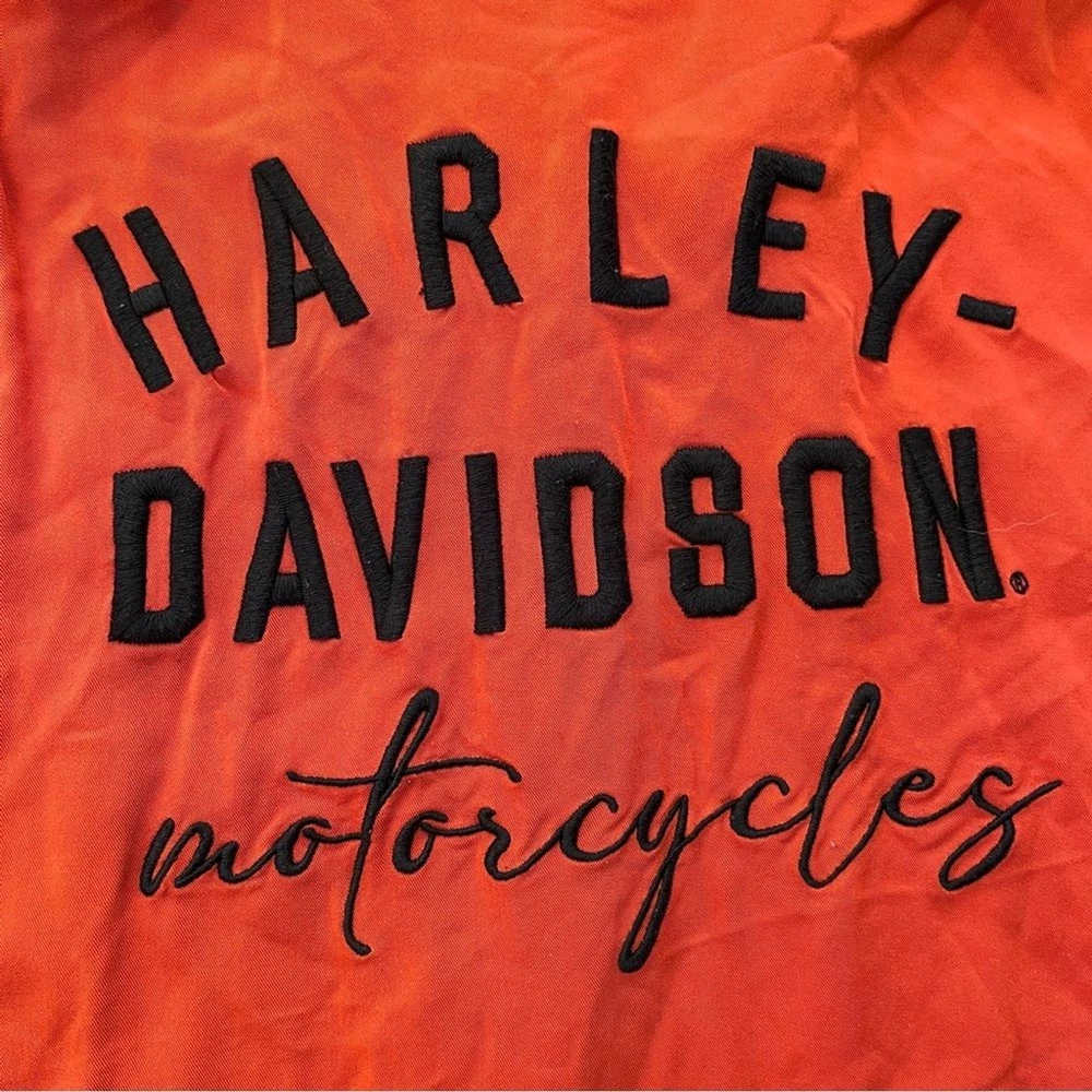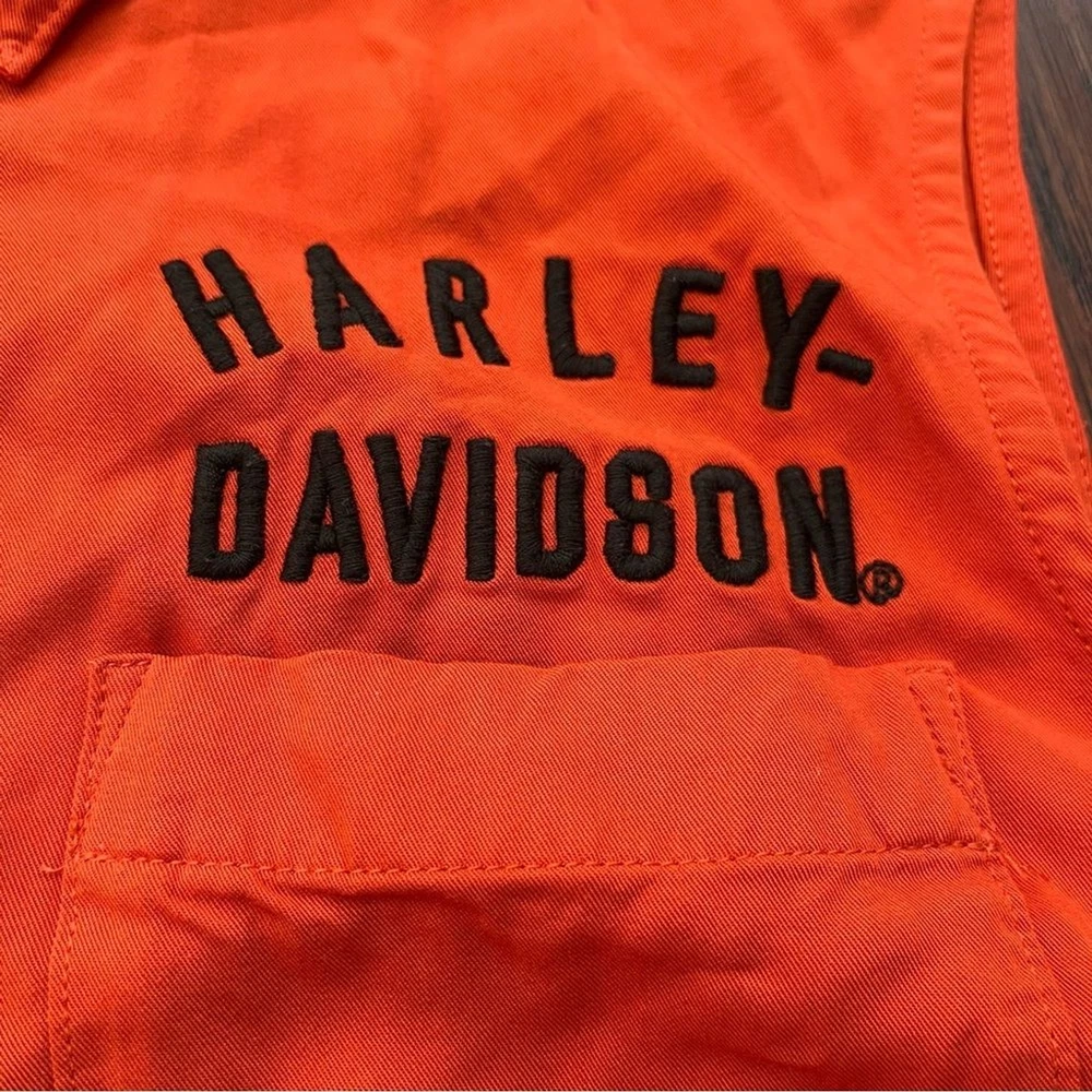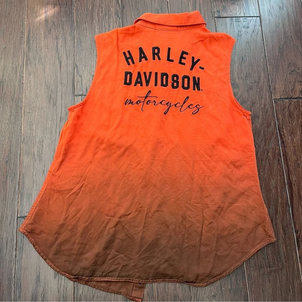 This Harley-Davidson button-up top is a must-have for any fan of the brand. It features a striking orange and black color scheme that is sure to turn heads. The top is made for unisex adults in a regular size medium and is perfect for wearing on any occasion. The top is made with high-quality materials and features the iconic Harley-Davidson logo on the front. It is perfect for anyone who wants to show off their love for the brand. This item is a great addition to any wardrobe and is sure to be a favorite for years to come. Harley Davidson button front top women’s medium orange black Sleeveless Collared Flowy fit and soft fabric Dip dyed look that goes from orange to black Embroidered on front and back with Harley Davidson motorcycles Like new All items ship the next business day! I love offers & give generous discounts on bundles