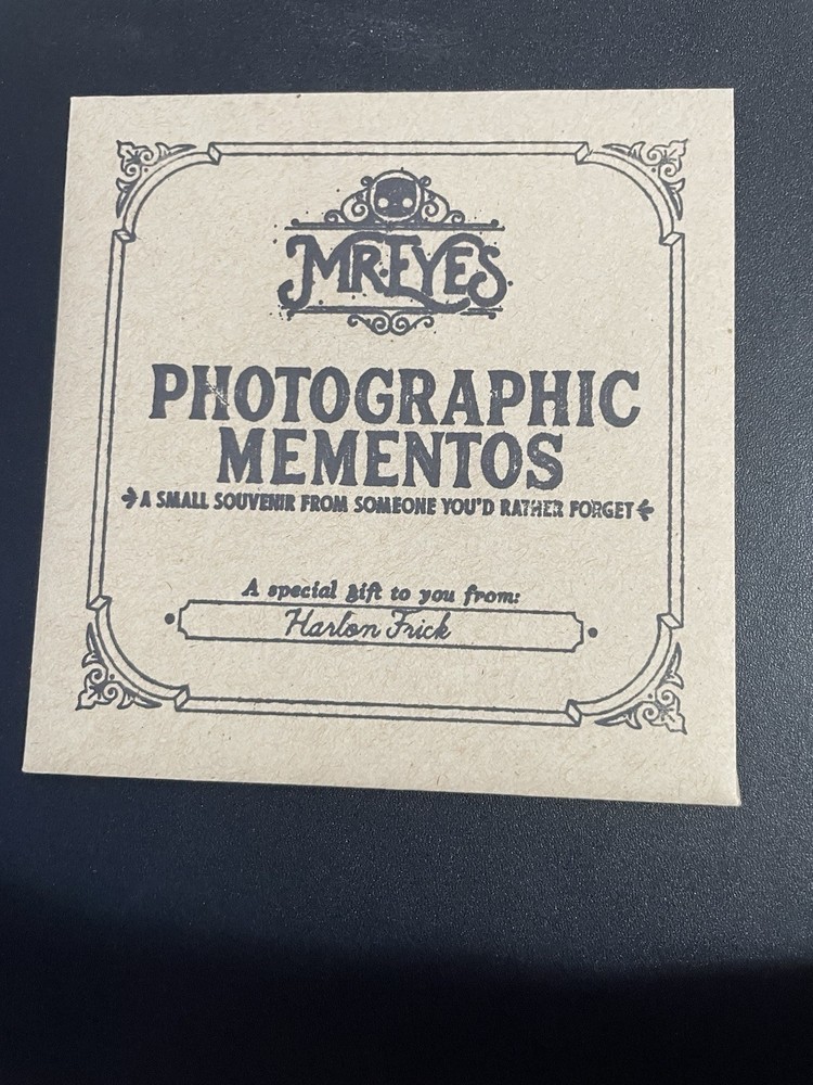 4x4" Archival Art Mini Print of Mr. Eyes horrible creation “Harlon Frick” enclosed in a custom designed envelope. This piece is printed on two sides in fine-detail on extra thick premium 32 point paper stock. Reverse side of print includes a story about the character. Each print is individually hand-signed on the front by the artist, Michael Reyes, aka Mr.Eyes.
