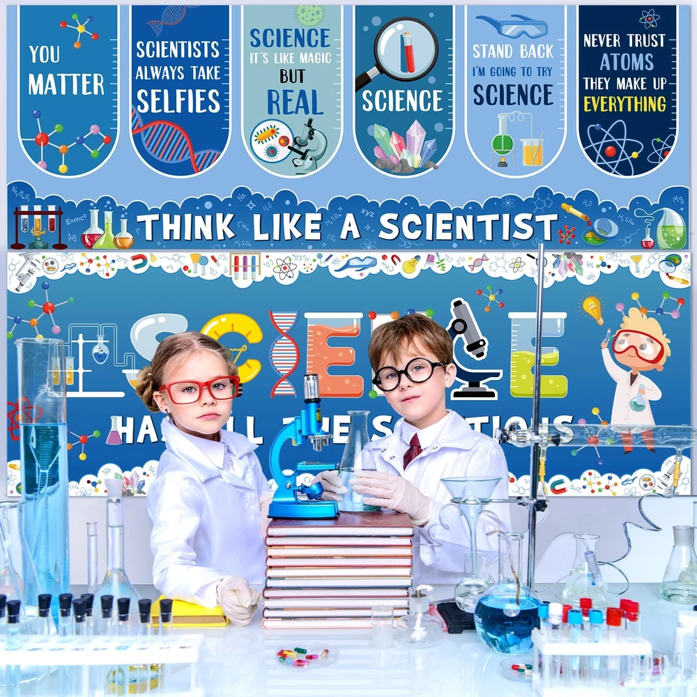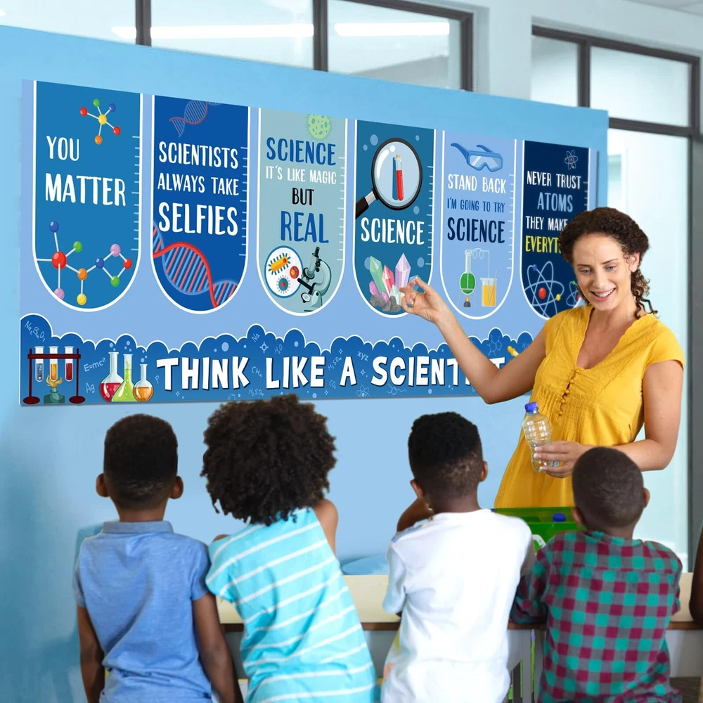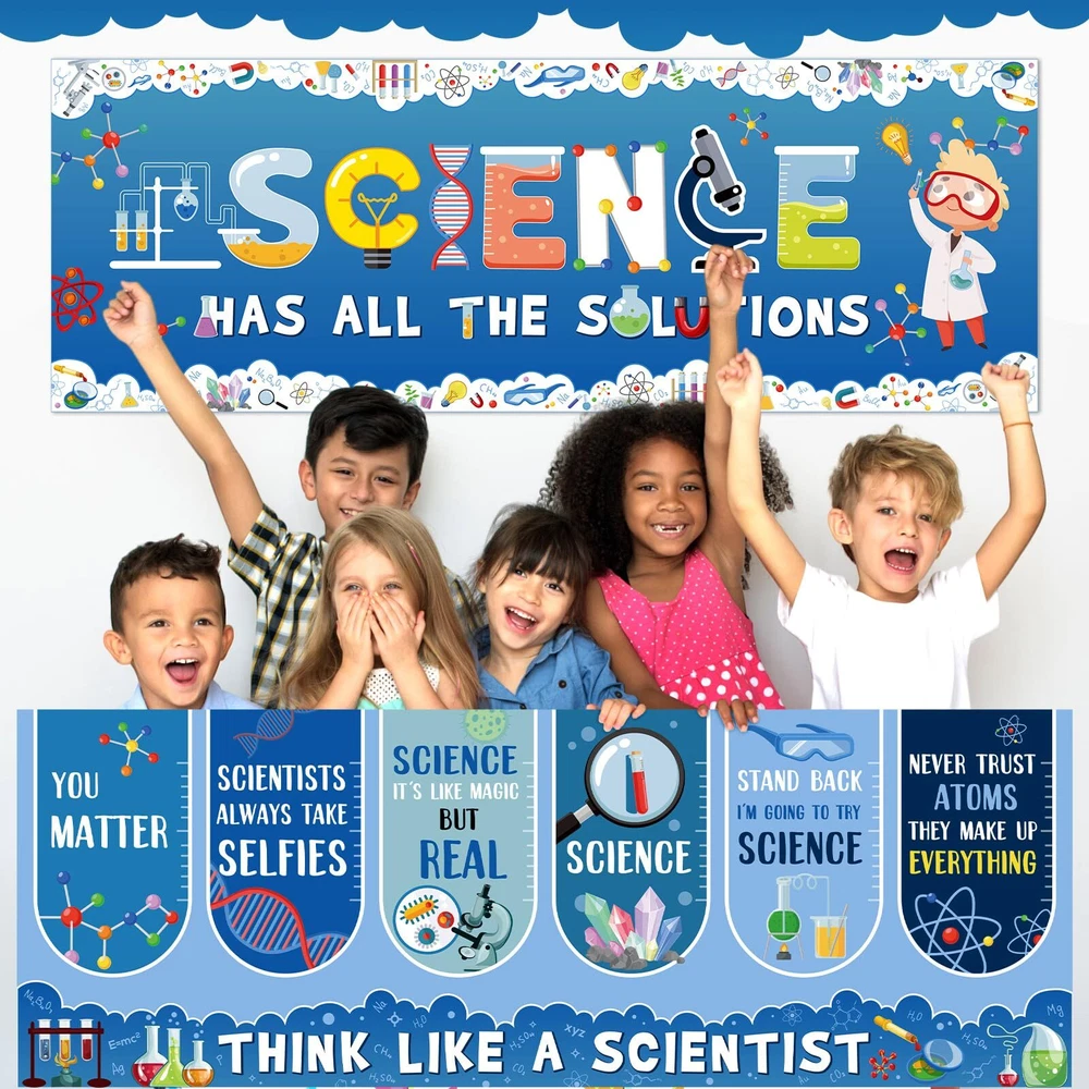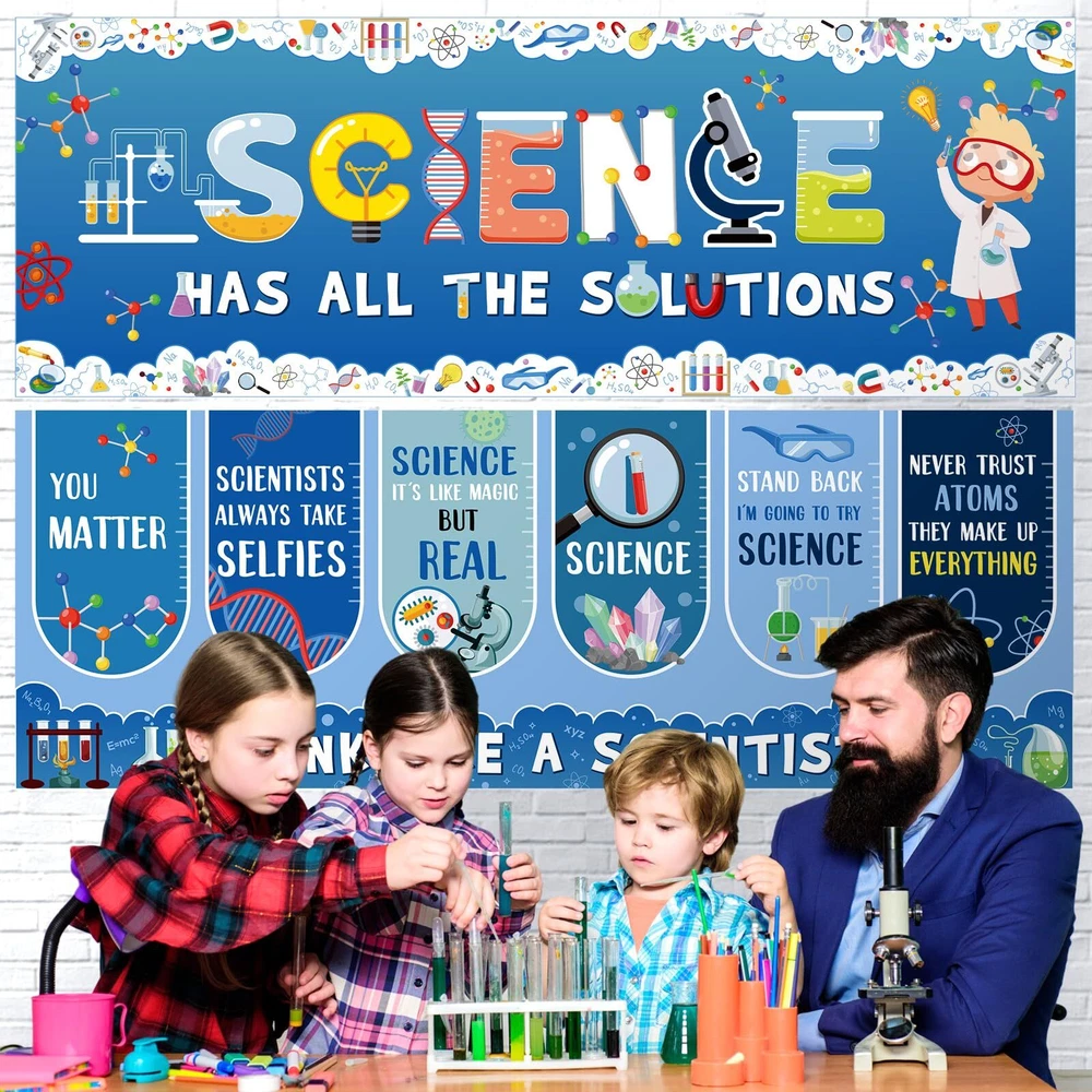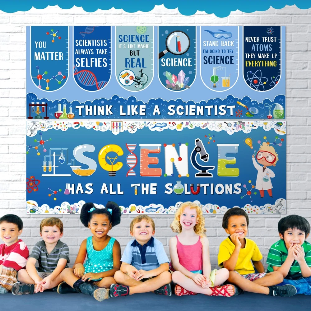 Features: Science classroom decor: Our science posters for classroom come with 2 sheets of adhesive dots, which aid in a quick and easy set up. Hanging these science banners and setting up your event or science decorations becomes a breeze. Get the bright celebration started in no time with our welcome banners. Specifications: Material: paper Color: as the picture shows Size: 13.8x38.6 inch Package includes: 2 x Science welcome banners 2 Sheets adhesive dots Notes: Manual measurement, please allow slight errors on size. The color may exist a slight difference due to different screen displays. Science Classroom Decor: 2 pieces of science banners which come with 2 sheets of adhesive dots to help easily secure the banners at your preferred location, ideal as party decorations or for fostering an appreciative environment in classrooms Classroom Decorations: these science posters for classroom are designed in cute science theme, combining education and decoration, printed colorful lab patterns and science related characters, embody a piece of commemoration with dazzling first day of school party decorations Material: our science bulletin board decor is crafted from paper, not easy to tear or wrinkle and fade resistant; This resilient material ensures your classroom decorations are durable and long lasting, ideal for celebrating and decorating Suitably Sized: each of the science motivational banners measures a substantial size of about 13.8 x 38.6 inches; This generous size makes them an eye catching addition to your party decorations, ensuring they command attention and conversation Multifaceted Celebratory Decoration: classroom cute science decorations cater to various needs, functioning as school decorations or science theme party decorations; Whether it's for a classroom celebration, community event, or a home setting, our banners bring a fitting touch to colorful sciences commemorations