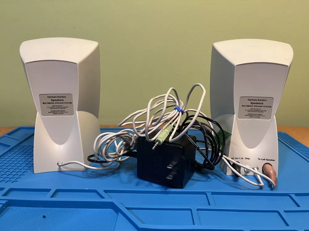 Harman Kardon (Dell OEM) 02320V Multimedia Computer Speaker System Beige computer speakers from the year 2000 that came with an old Dell Dimension desktop, in perfectly working order. They're still plenty useful as daily computer speakers, but they would go best into a retro-styled beige computer setup. Comes with the original power supply.