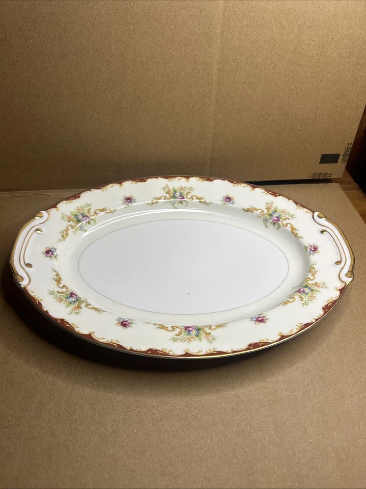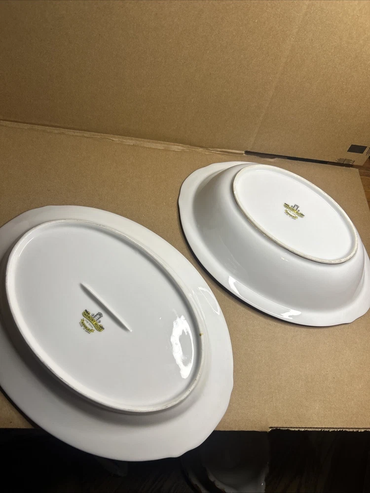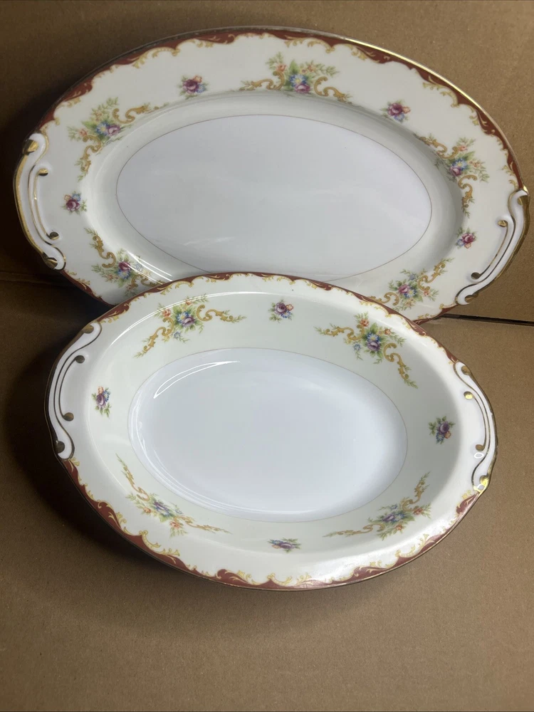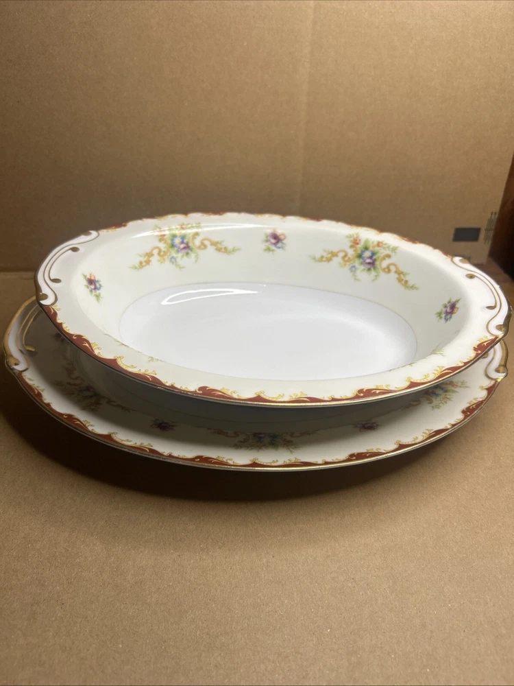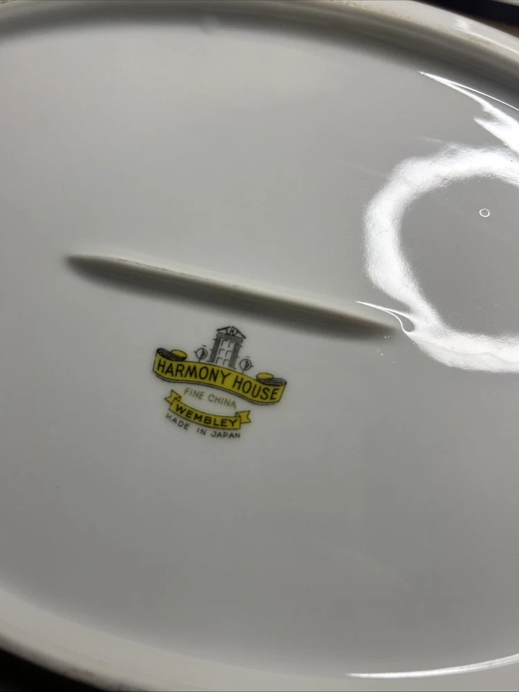 This is a vintage Harmony House fine china set from the 1960s, made in Japan. The set includes an oval serving plate and a serving bowl, both featuring a flower pattern. The pieces are made of porcelain in a multicolor design. They are part of a vintage collection and are ideal for serving food in a stylish and elegant manner.both pieces are in excellent shape