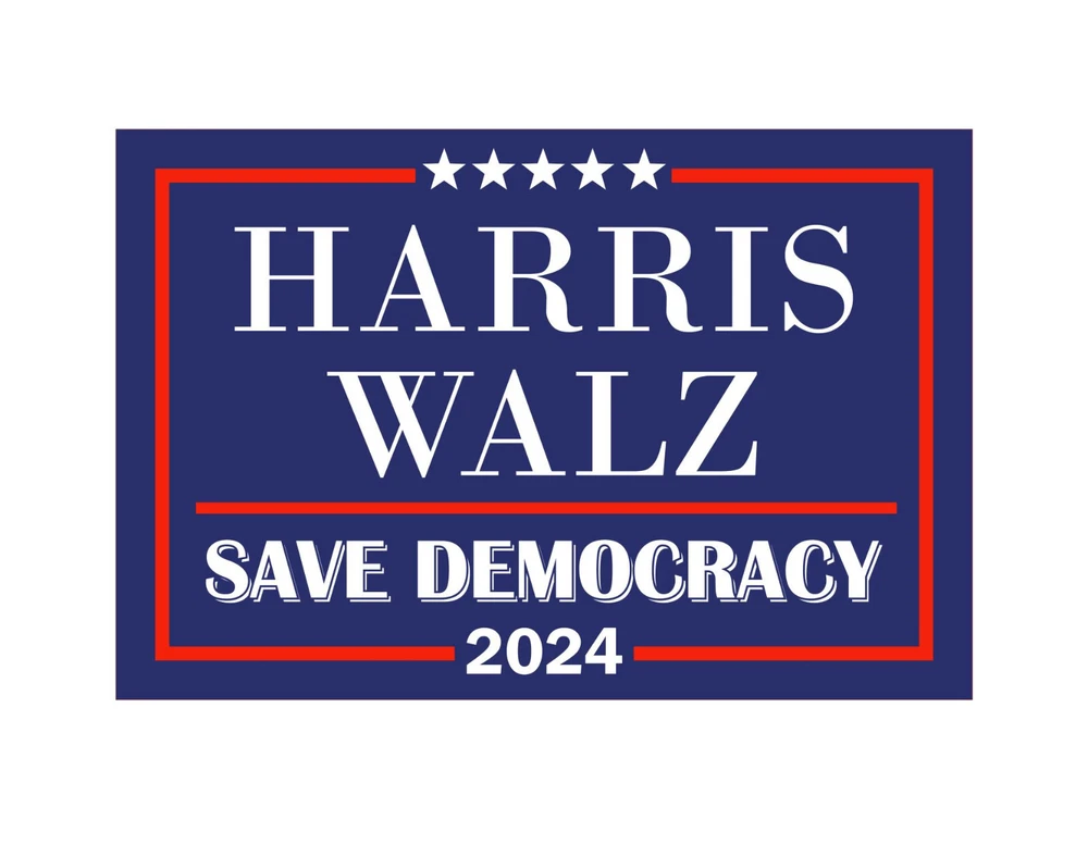 Harris Walz 2024 Yard Sign Double-sided Dimensions : 12x18 inches, perfect for visibility without overwhelming your yard or space. Material : Durable Coroplast, weather-resistant and designed for outdoor use in various climates. Design : Bold, legible text: "Harris Walz 2024" in prominent, eye-catching font. Secondary message: "Save Democracy" in a slightly smaller font to emphasize the campaign’s core message. Color scheme: Patriotic colors (e.g., red, white, and blue) to reflect the American spirit. Versatile Use : Ideal for lawns, gardens, or as a display in windows and public spaces. Easy Installation : Includes metal H-stakes for quick and secure placement in grass or soil. Purpose : Show your support for the Harris Walz 2024 campaign and the movement to protect democratic values.