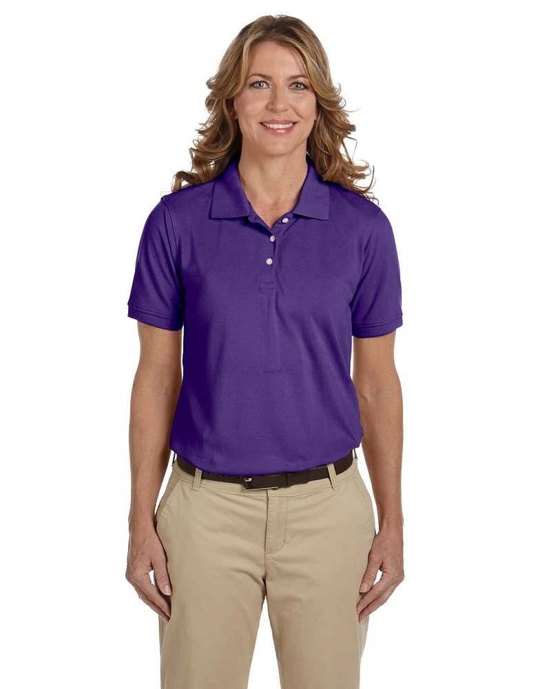65% polyester, 35% cotton piqu?; Wrinkle-resistant; Special poly/cotton blend creates soft silky hand and helps reduce shrinkage; Flat-knit collar and cuffs; Hemmed bottom with side vents; Sideseamed; Three-button placket; Set-in sleeves; Softly shaped for more flattering feminine fit;
