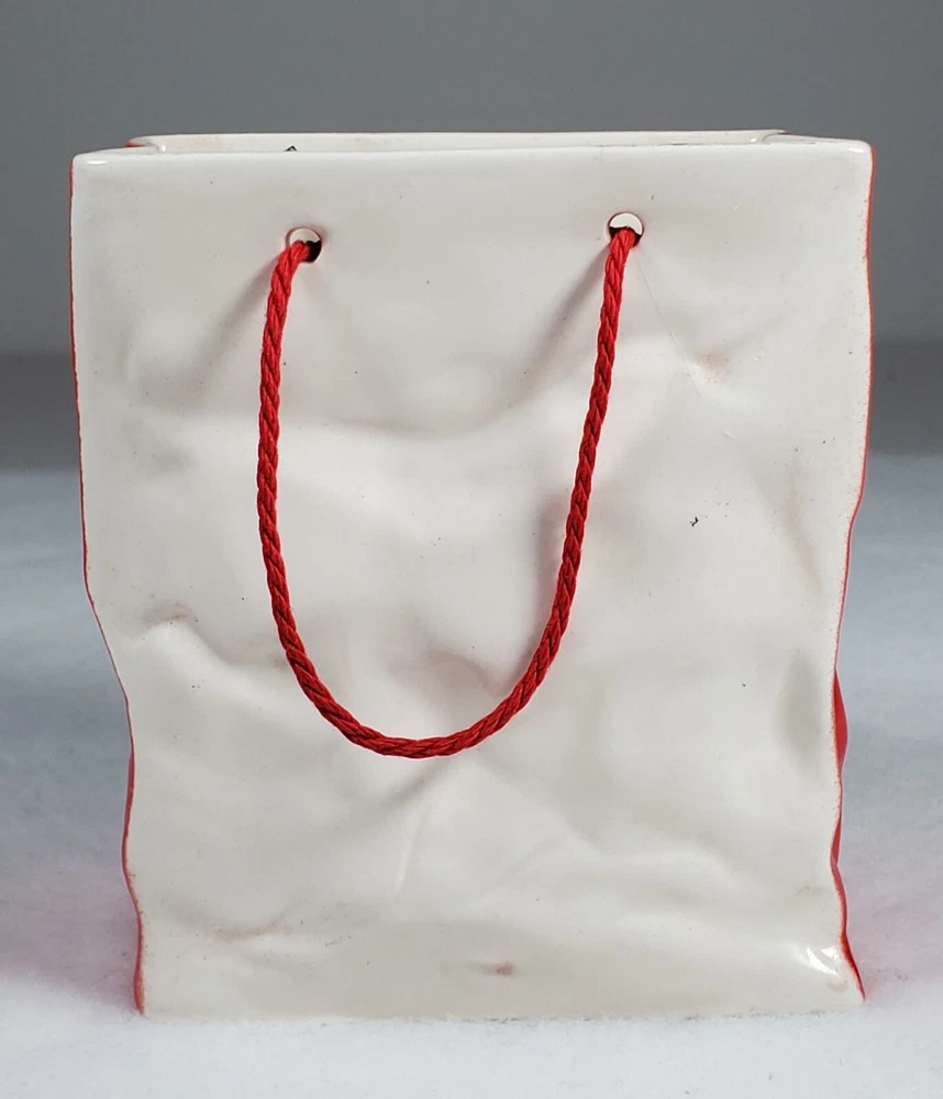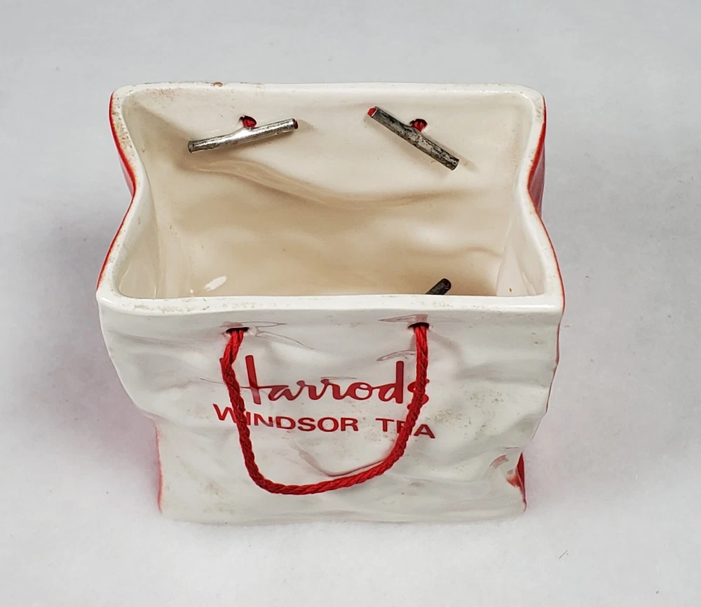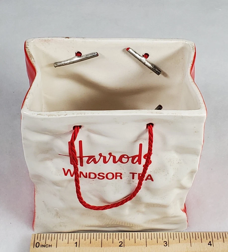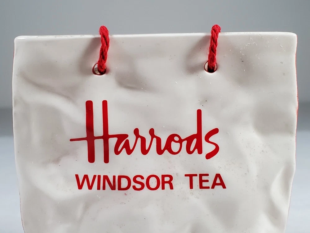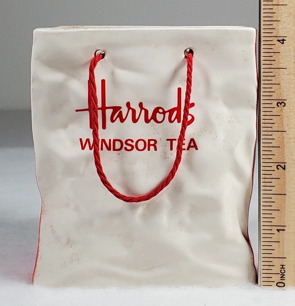 Harrods Ceramic Shopping Bag Windsor Tea, Red And White, Carlton Ware England. 4 inches tall. 3.5 inches long. 2 inches wide. READ: Minor loss of red paint; minor wear overall; no chips; no cracks; red handles in good condition.