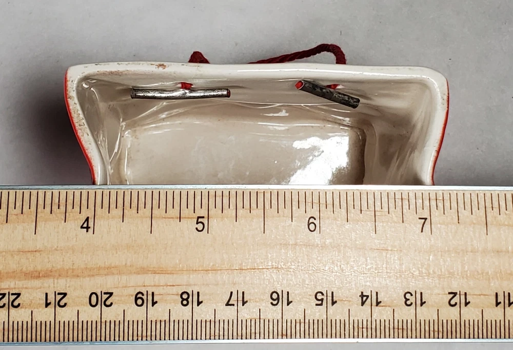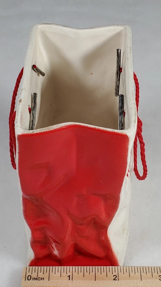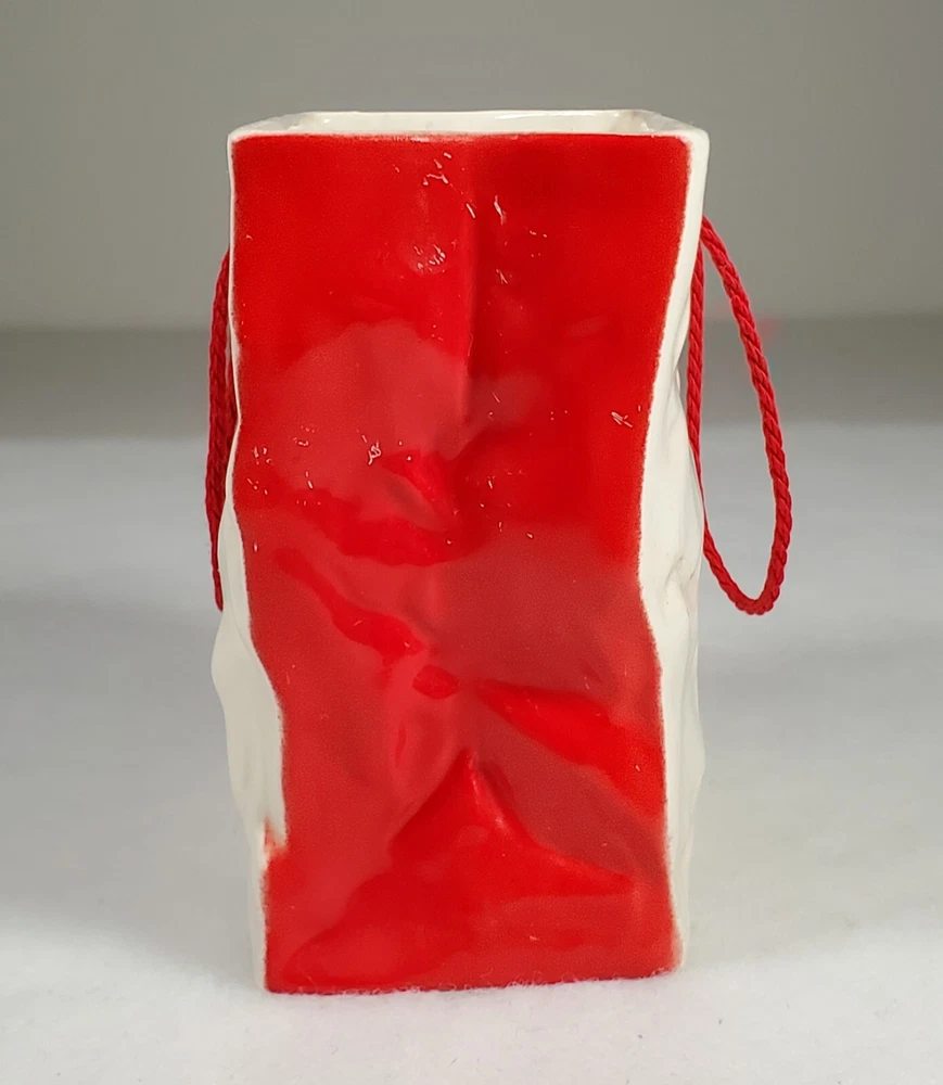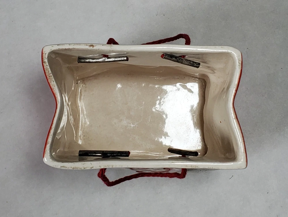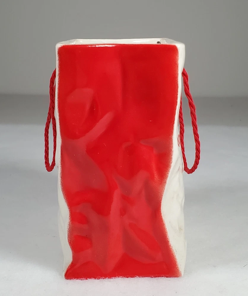 Harrods Ceramic Shopping Bag Windsor Tea, Red And White, Carlton Ware England. 4 inches tall. 3.5 inches long. 2 inches wide. READ: Minor loss of red paint; minor wear overall; no chips; no cracks; red handles in good condition.