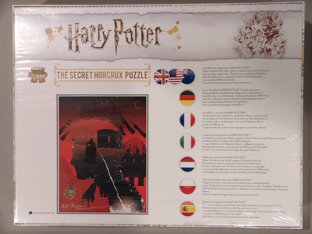 Immerse yourself in the magical world of Harry Potter with this 1000 piece jigsaw puzzle. Featuring the iconic character family and theme, the puzzle is brand new and sealed to ensure its pristine condition. The puzzle depicts the Secret Horcrux, a highly sought-after item in the wizarding world. With its vibrant colors and intricate details, this puzzle will provide hours of entertainment for any Harry Potter fan. Assemble the puzzle and bring the world of Harry Potter to life right in your own home. Whether as a gift for a loved one or as a treat for yourself, this puzzle is sure to delight. Get ready to experience the thrill of the hunt as you piece together the Secret Horcrux puzzle.
