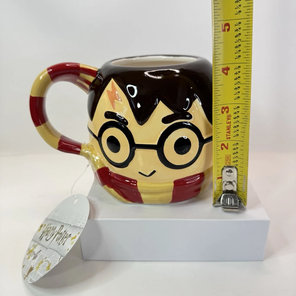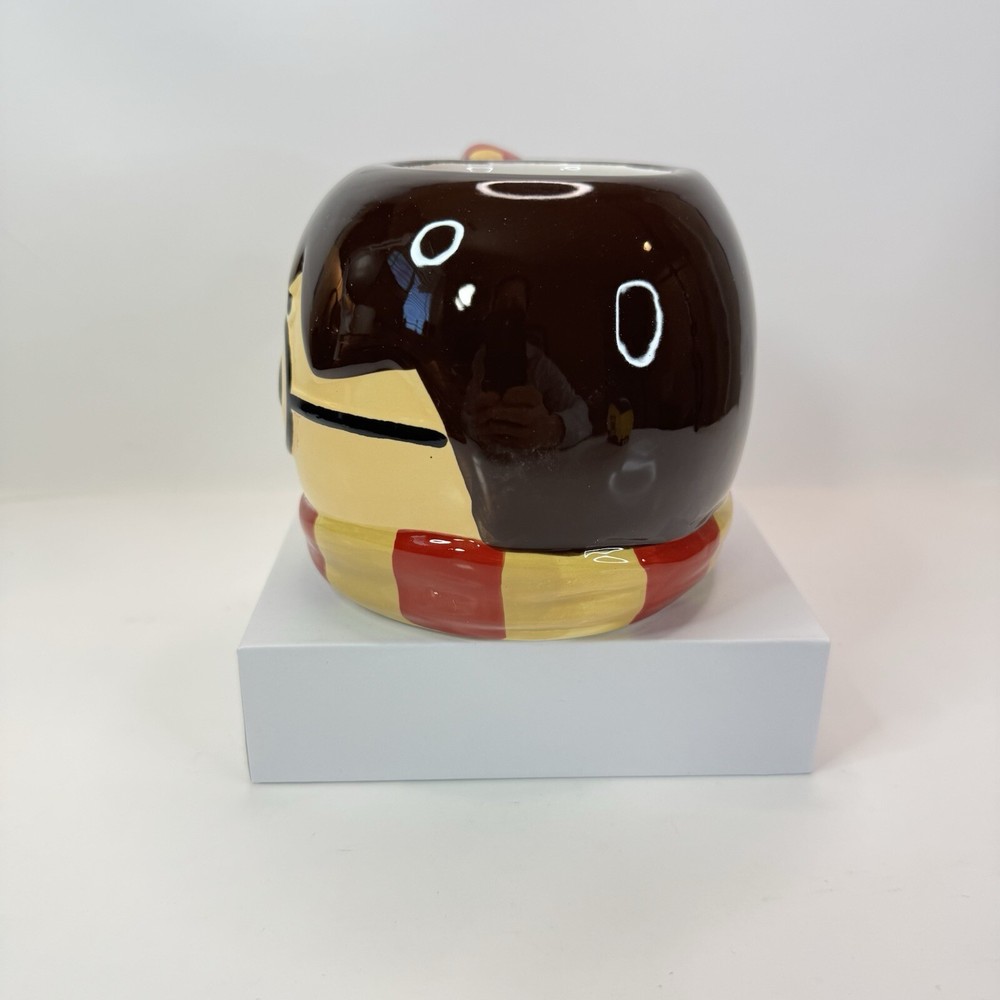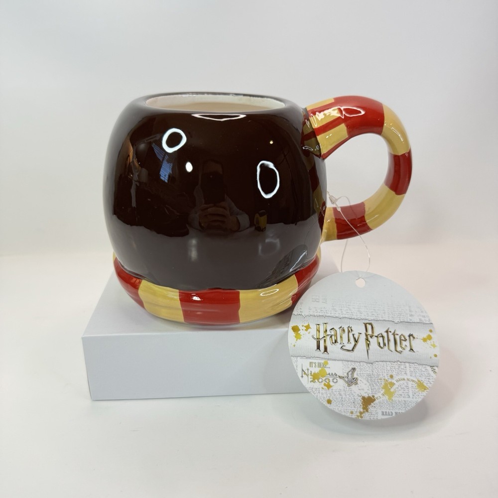 This is a brand new Harry Potter coffee mug featuring a cute chibi design and a Gryffindor scarf. The mug has a large 24 oz capacity and is shaped like a figure. It is colored in beige and is perfect for any Harry Potter fan looking to add a touch of magic to their daily coffee or tea routine. The mug is a charming addition to any kitchen or dining collection, making it a must-have for fans of the popular fantasy series.