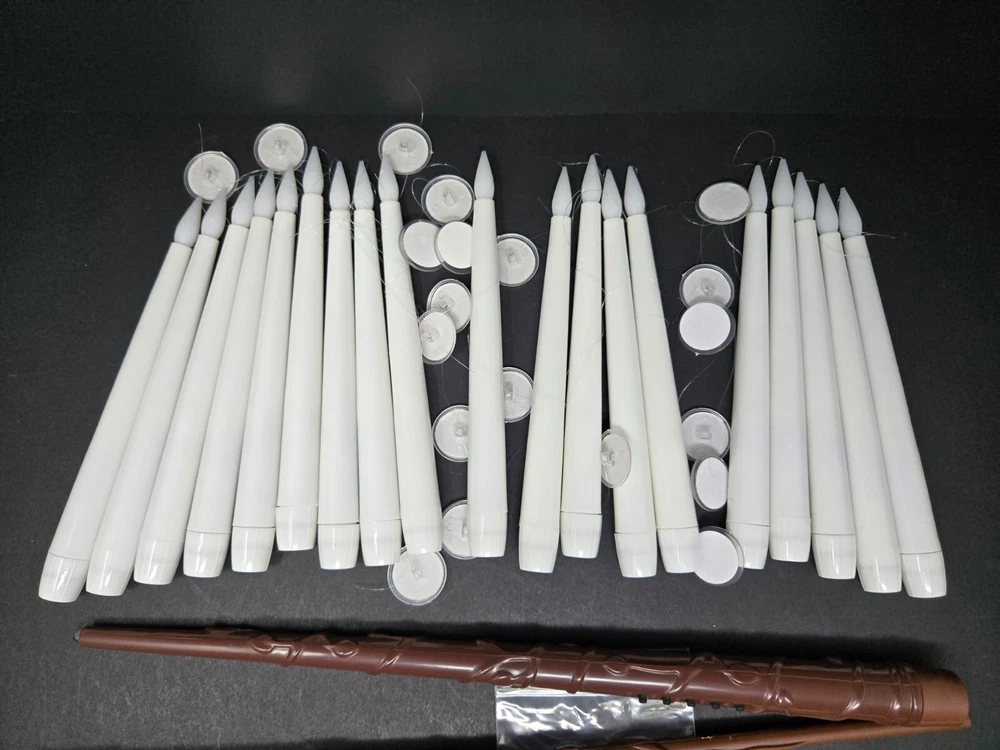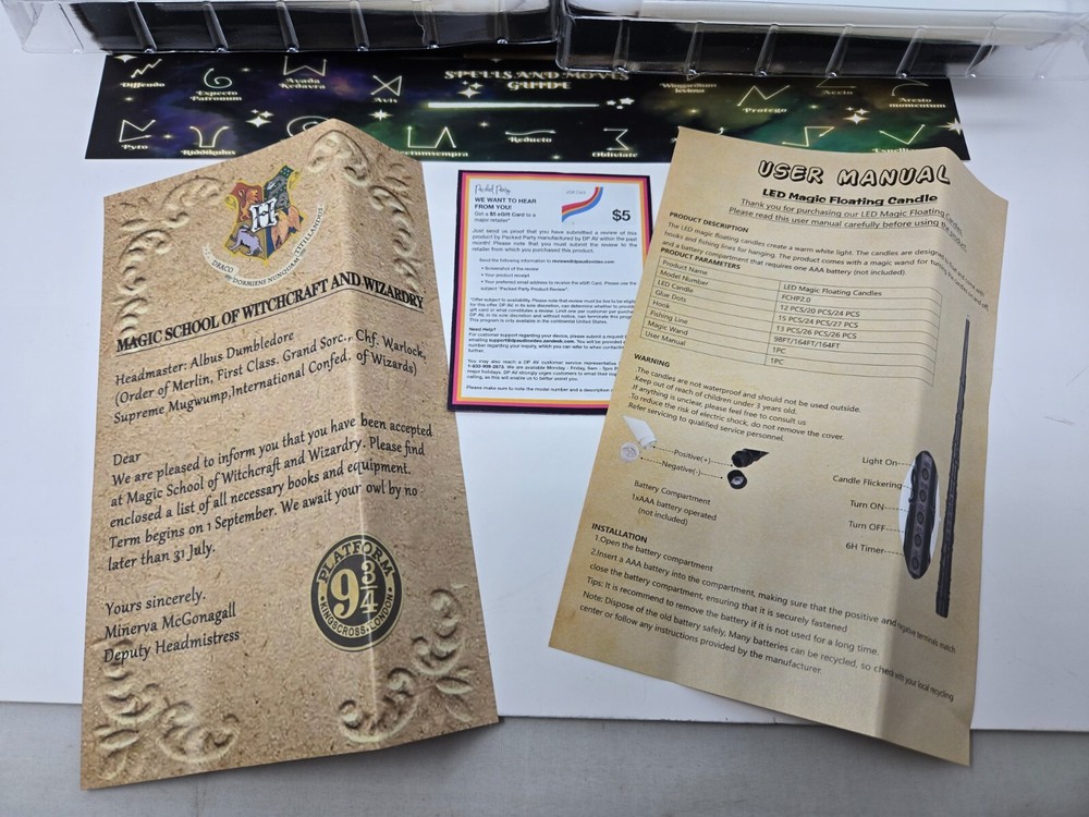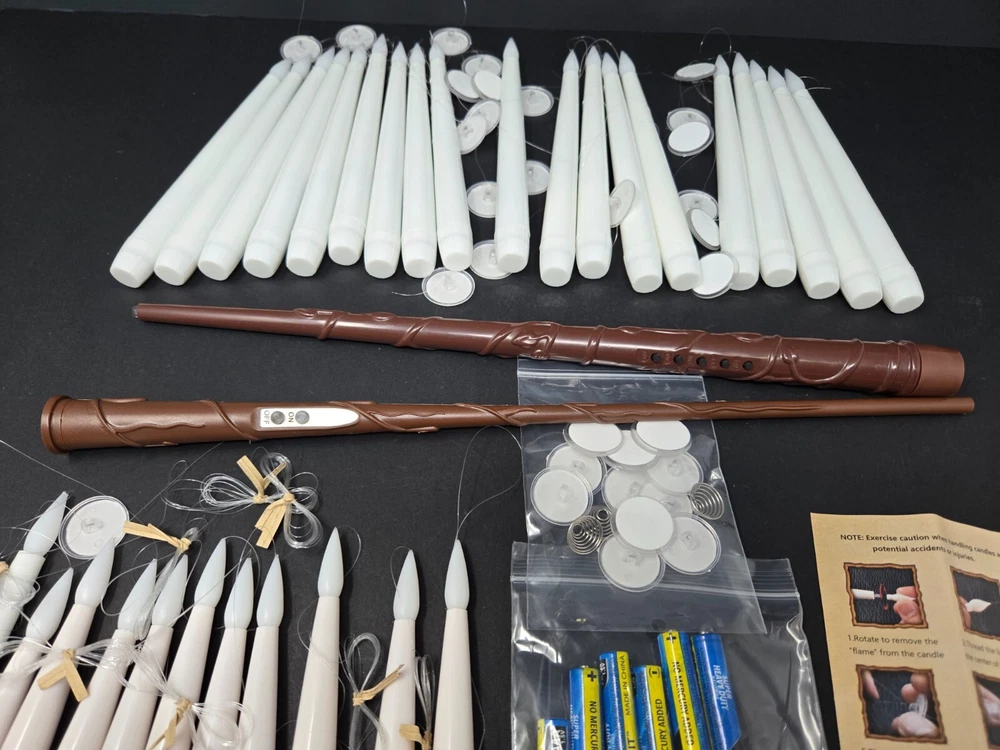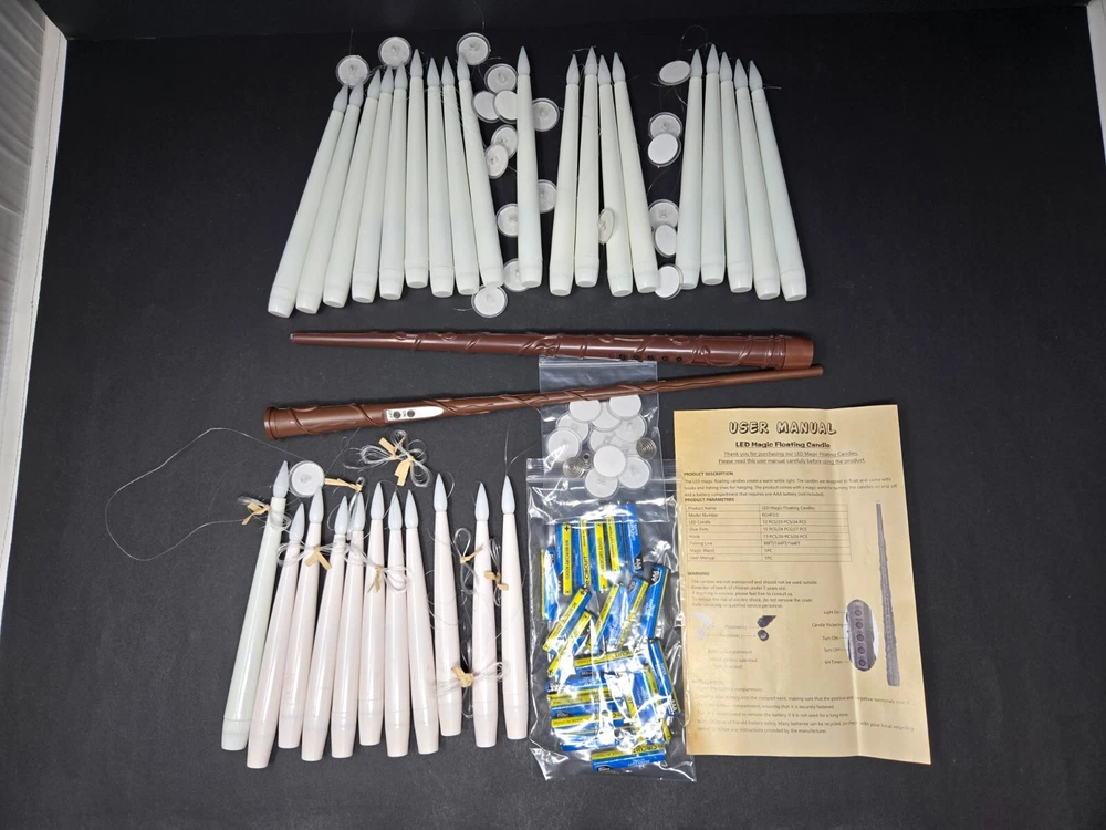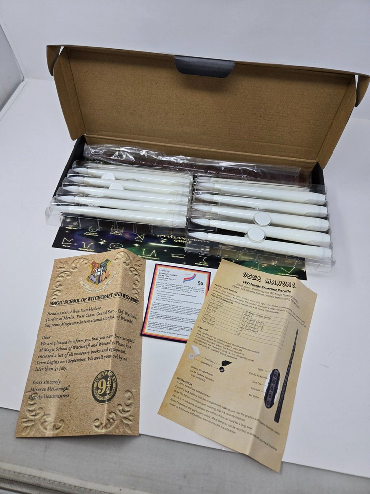 This medium-sized set of 50 white plastic floating candles is designed in a round shape and is powered by AAA batteries. Each candle features LED lights and the lot comes with three remote wands, creating a magical Harry Potter theme. Perfect for adding a touch of art deco style and fantasy to your living room or dining room, these unscented candles have a burning time of more than 5 hours. Ideal for those who enjoy fun, curiosity, and novelty themes, this set is a unique addition to any home decor. NOS (New Old Stock) New/Open Box. Lot includes EVERYTHING you see in ALL of the photos. All of our items are shipped from a SMOKE-FREE environment.