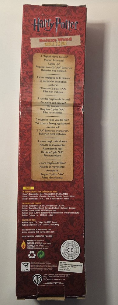 This Harry Potter Deluxe Wand is a must-have for any fan of the franchise. Made by Warner Bros., this wand is a replica of the one used by the famous wizard. It is a sound-only motion activated wand that comes with its original box. This wand is perfect for collectors and enthusiasts alike who want to feel like they are part of the Harry Potter universe. The wand is from 2010 and does not have any light, but it still makes the perfect addition to any collection.