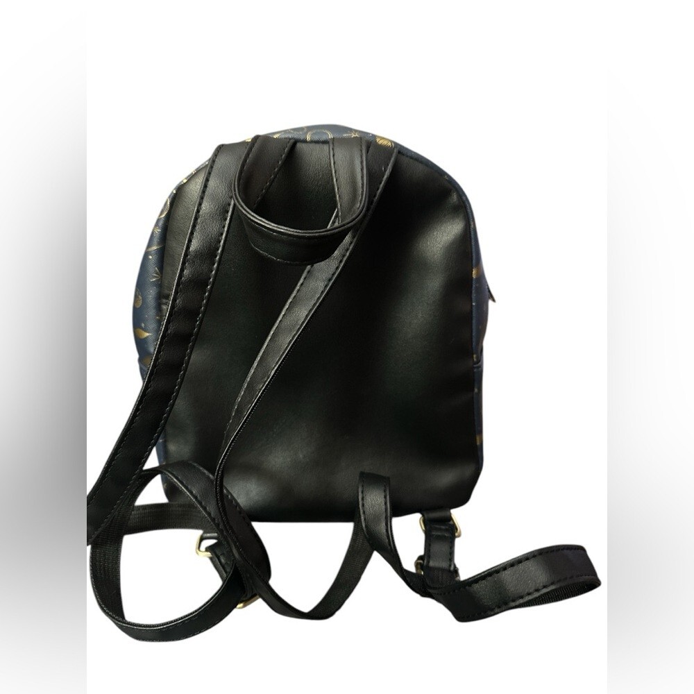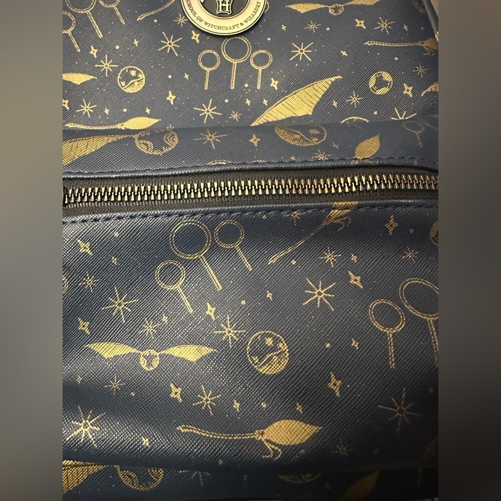 Harry Potter Navy & Gold Quidditch Mini Backpack This navy blue mini backpack is printed all over with metallic gold stars, Quidditch hoops and other equipment from the game. Featuring a front zipper pocket, zipper closure, adjustable straps and a top carrying handle. 8 1/2" x 6" x 11" Polyurethane