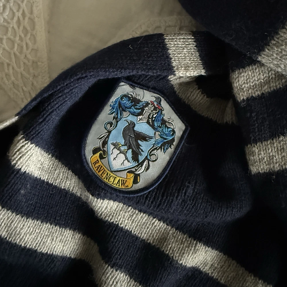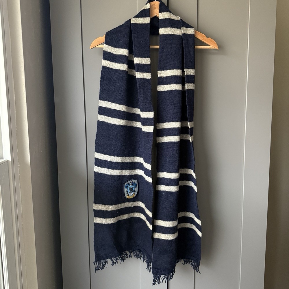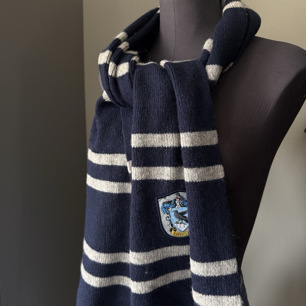 Bring a bit of Hogwarts magic to your winter wardrobe with this classic Ravenclaw house scarf, featuring the iconic Ravenclaw crest patch and traditional navy/grey stripe pattern. Made from soft lambswool, this scarf is warm, cozy, and perfect for both daily wear and cosplay. Condition: Pre-owned, excellent condition with minimal signs of wear. No holes or stains. Fringe intact and colors vibrant. Brand: Harry Potter (officially licensed) Material: 100% Lambswool Made in: China Measurements: • Length: 76 inches • Width: 11 inches