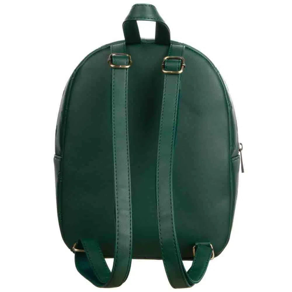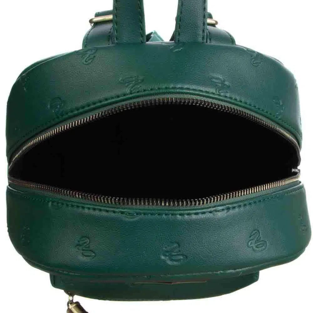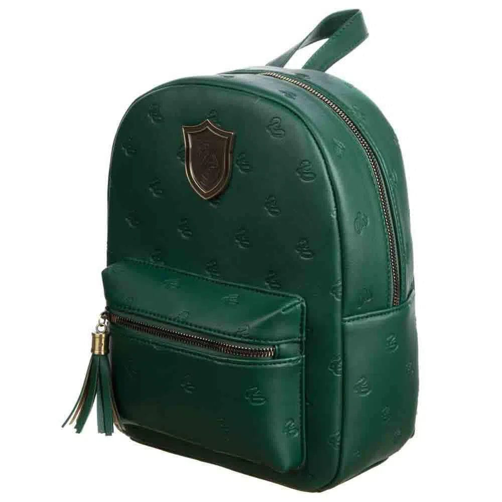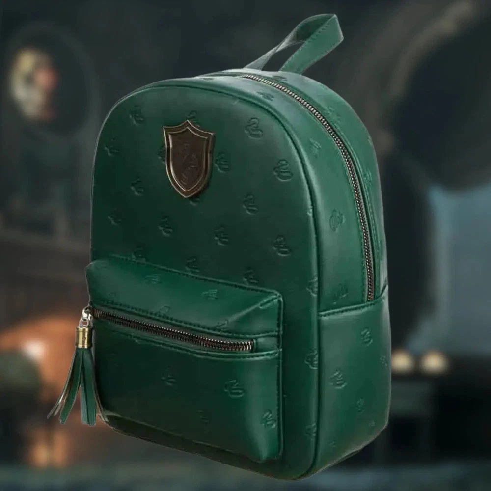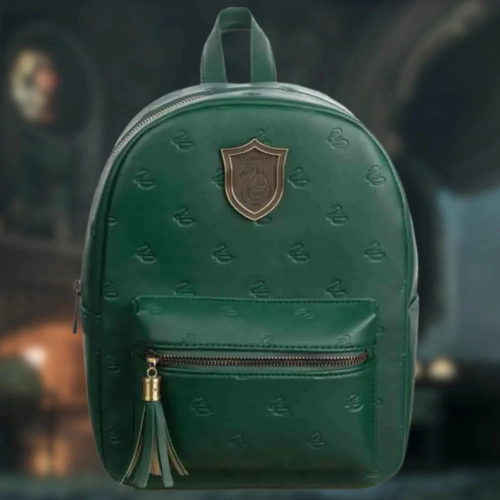 Harry Potter - Slytherin Mini Backpack - Bioworld Condition: New The Harry Potter - Slytherin Mini Backpack by Bioworld is the perfect accessory for fans of the Slytherin house. Designed with a sleek, green synthetic leather exterior, this backpack showcases a metal badge and an embossed pattern, reflecting the house's distinctive style. Whether you're off to class or out for an adventure, this backpack is a stylish way to carry your essentials. The backpack features a convenient tassel zipper puller for easy access, while the adjustable shoulder straps ensure a comfortable fit. With its compact yet functional design, this backpack provides ample space to carry your items securely. The interior is fully lined, offering extra durability and protection for your belongings. Made from high-quality synthetic leather, this mini backpack is both stylish and practical. It measures 11" H x 8.5" W x 4" D, making it the perfect size for everyday use. Easy to maintain, simply wipe it clean with a damp cloth to keep it looking new. This officially licensed Harry Potter accessory is an essential for any Slytherin fan looking to display their house pride.