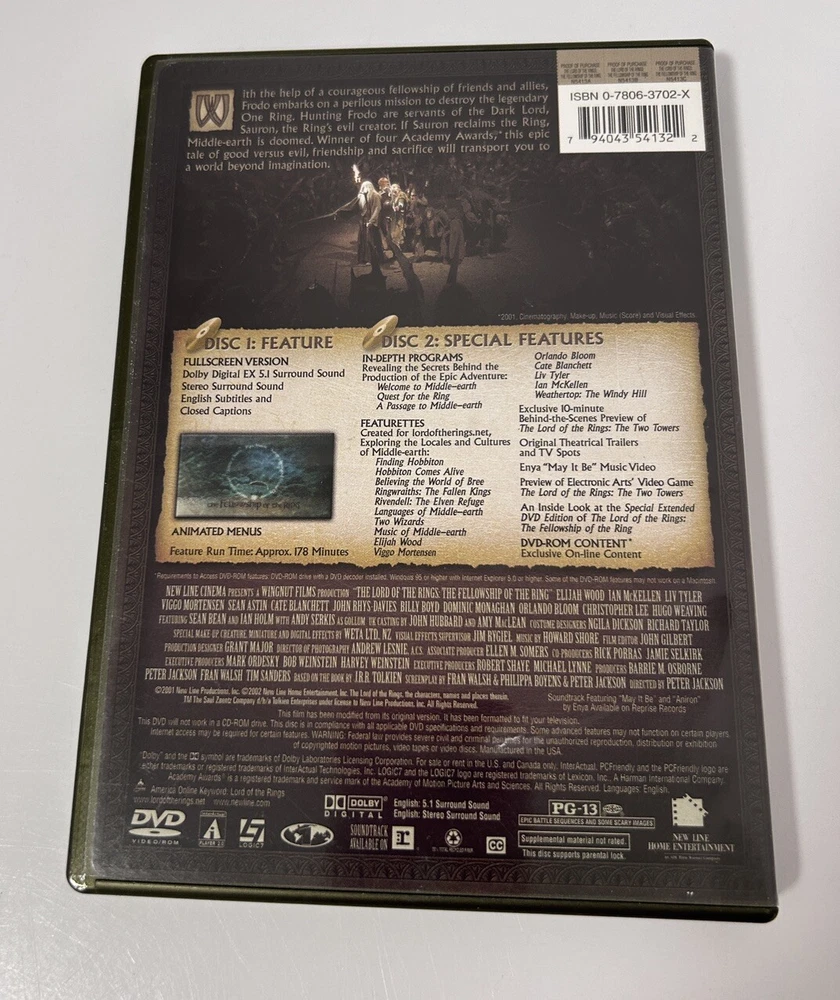 Book: Harry Potter And The Cursed Child, Special Rehearsal Edition Script Parts 1 and 2. Hardback book 1st edition, like new with dust cover. DVD: The Lord Of The Rings, The Fellowship Of The Ring. Pre-owned but in great condition. Two discs, one is the Full Screen Feature and one is Special Features. PG 13, 178 minutes, with 10 minute behind the scenes feature. DVD includes the case insert (booklet.) The discs have been cleaned with disc cleaner. Both discs play fine ( I have taken a video of both discs while playing.) Ships to Continental U.S. only. Thanks for viewing…LCF